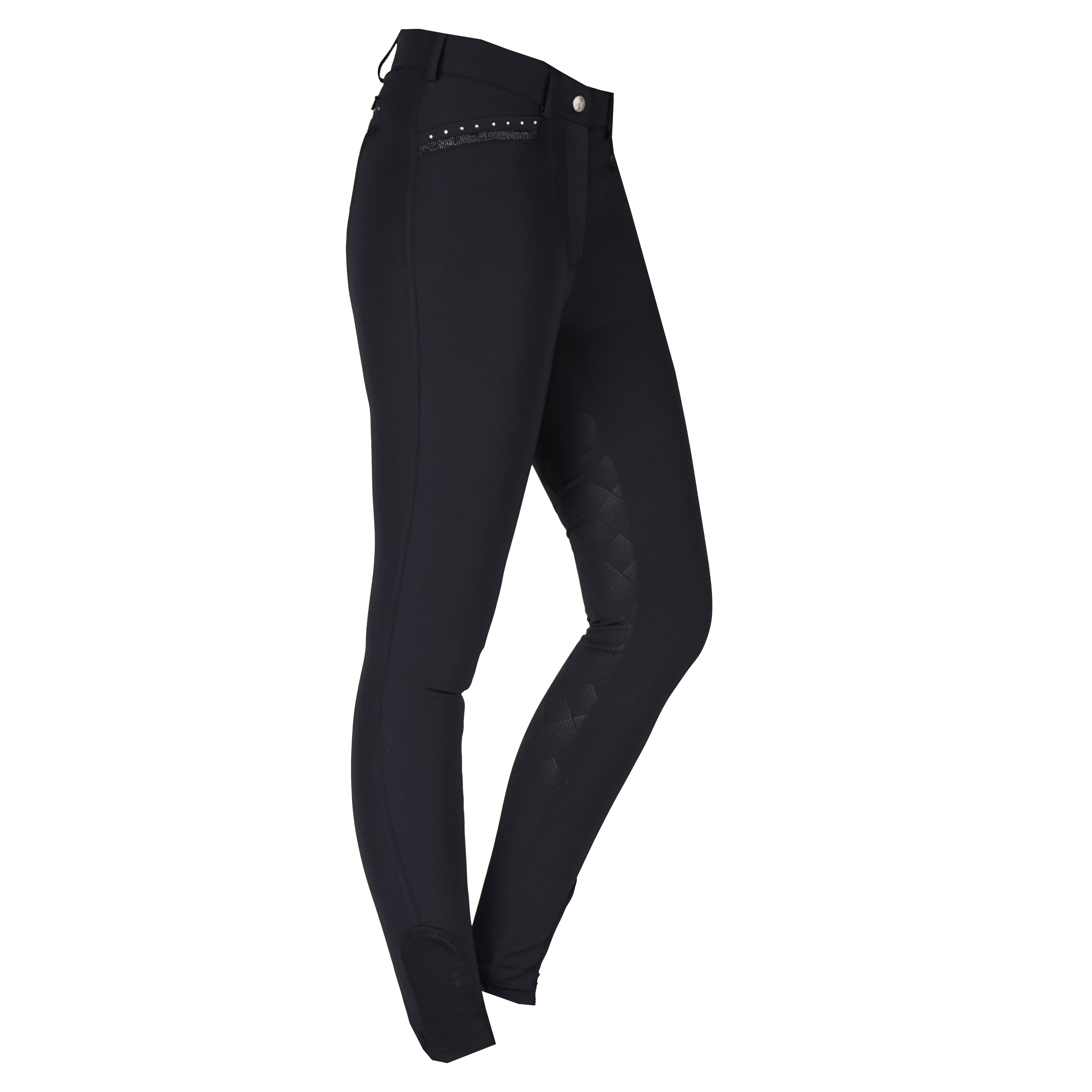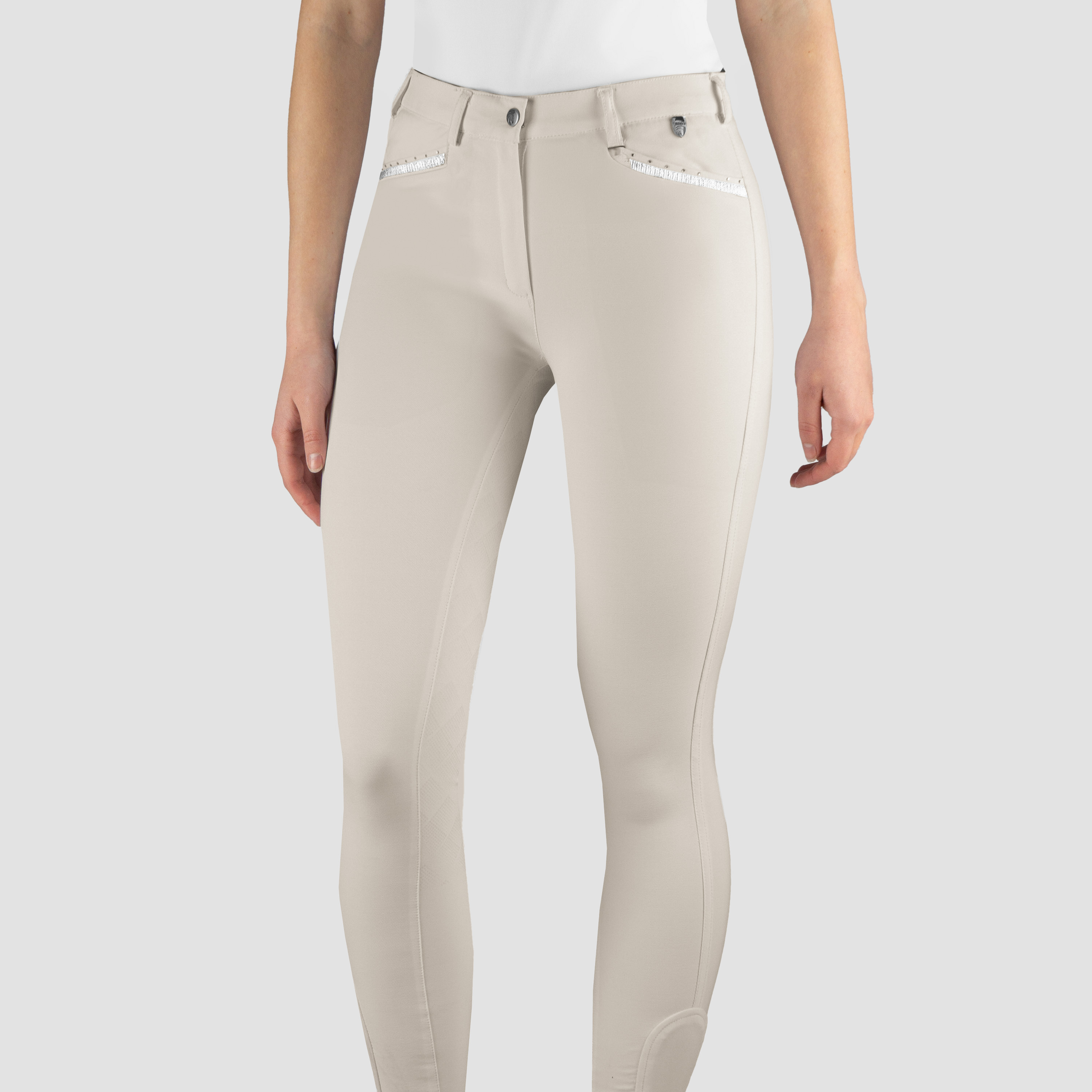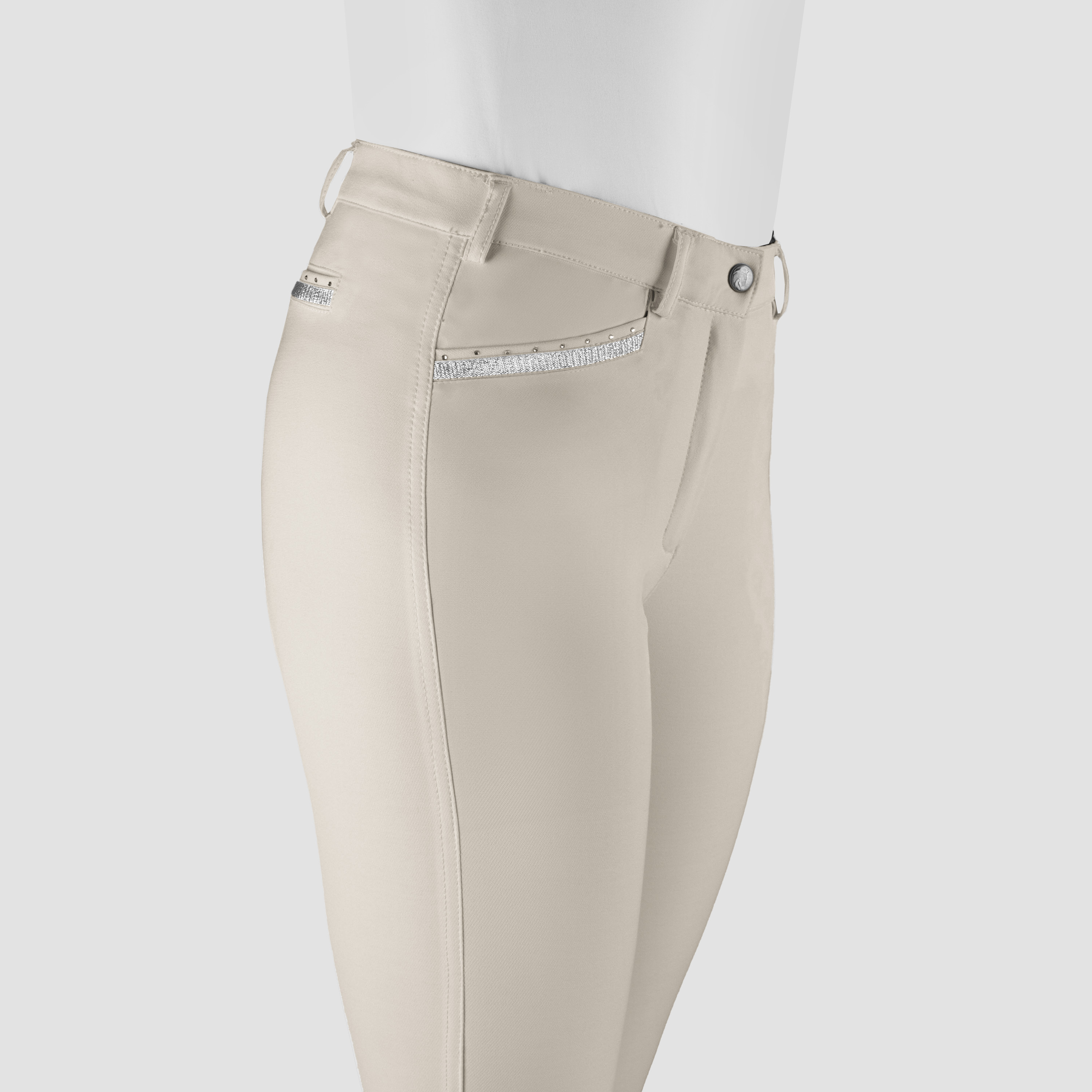 Great ladies breeches from comfortable micropolyester. The Alexa is well designed with a flattering fit and medium high waistband. Subtle glitter tape and crystal stone details make for a sophisticated look.