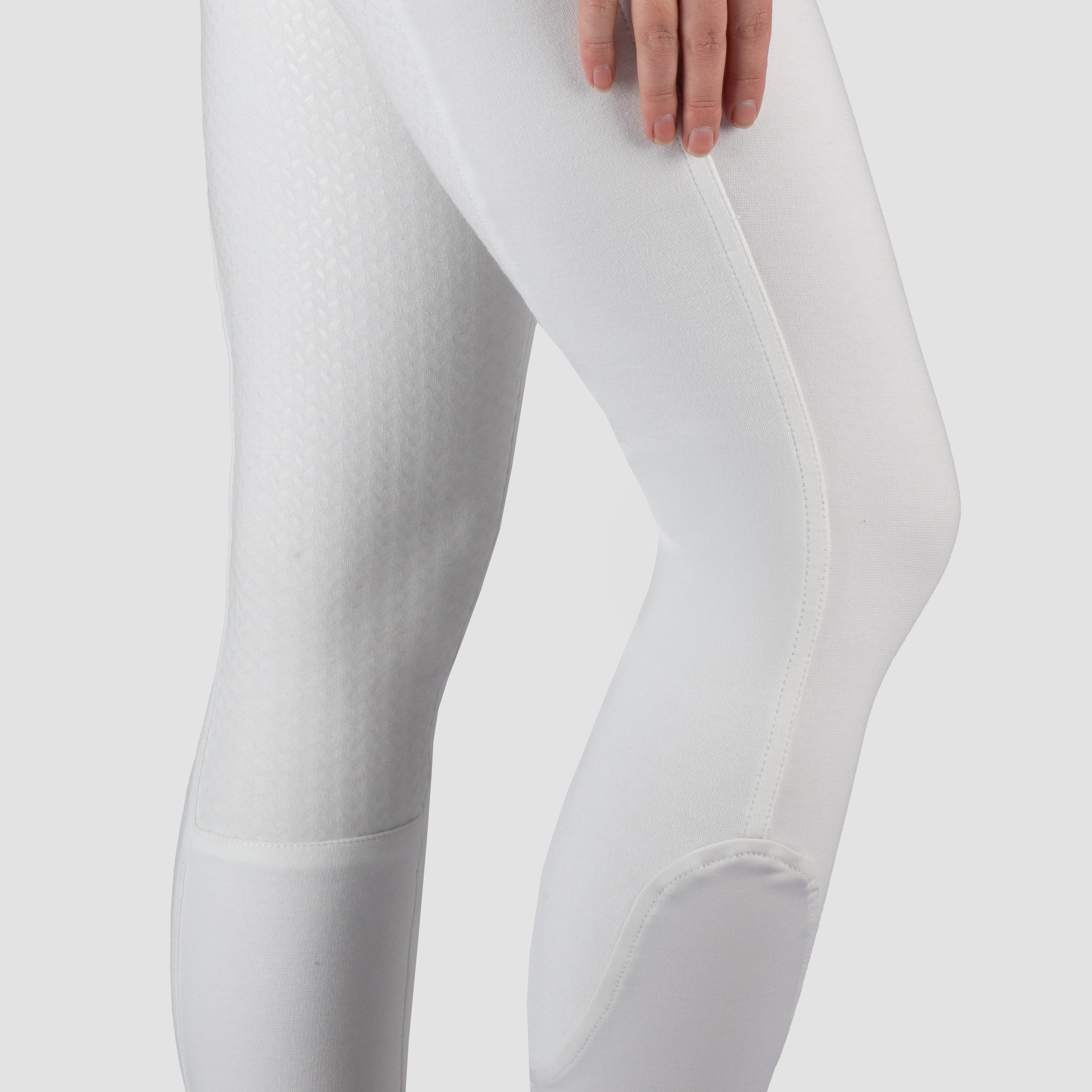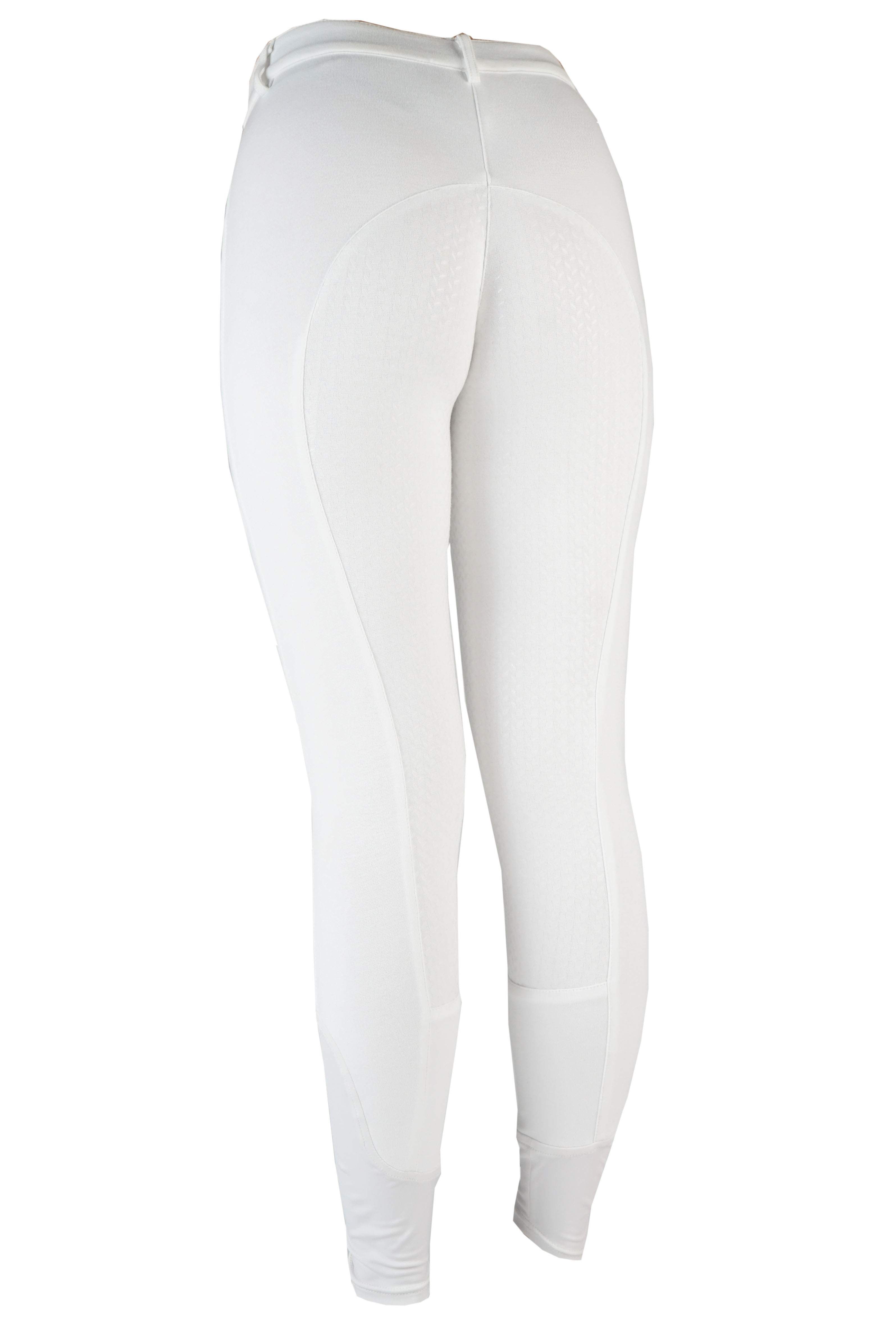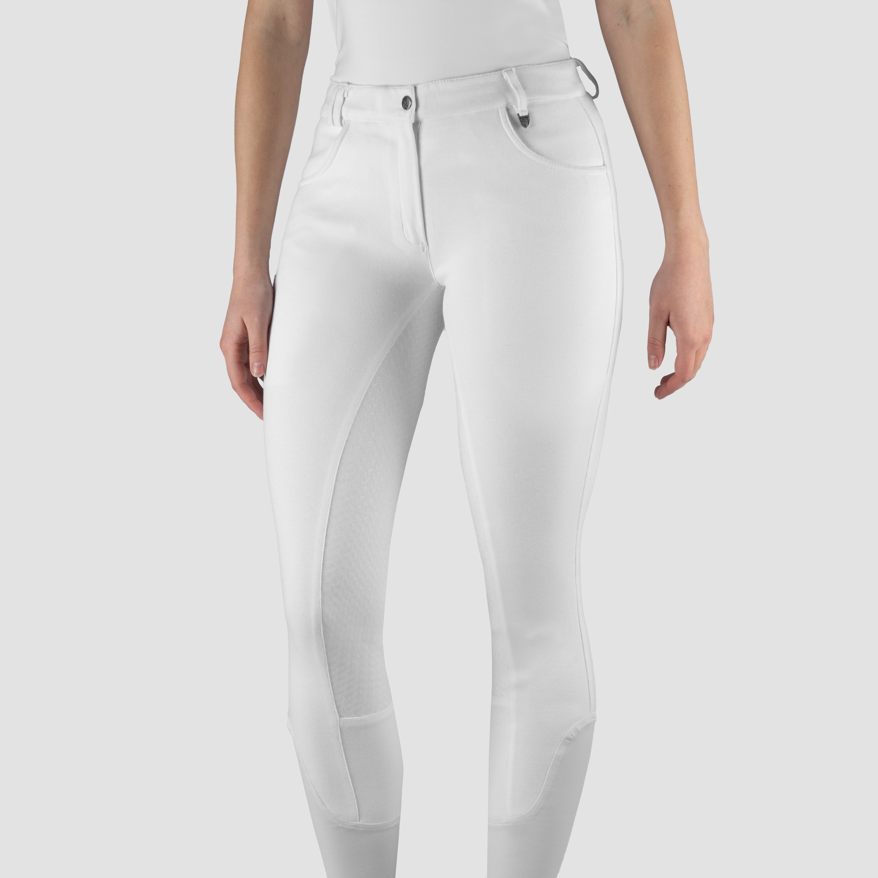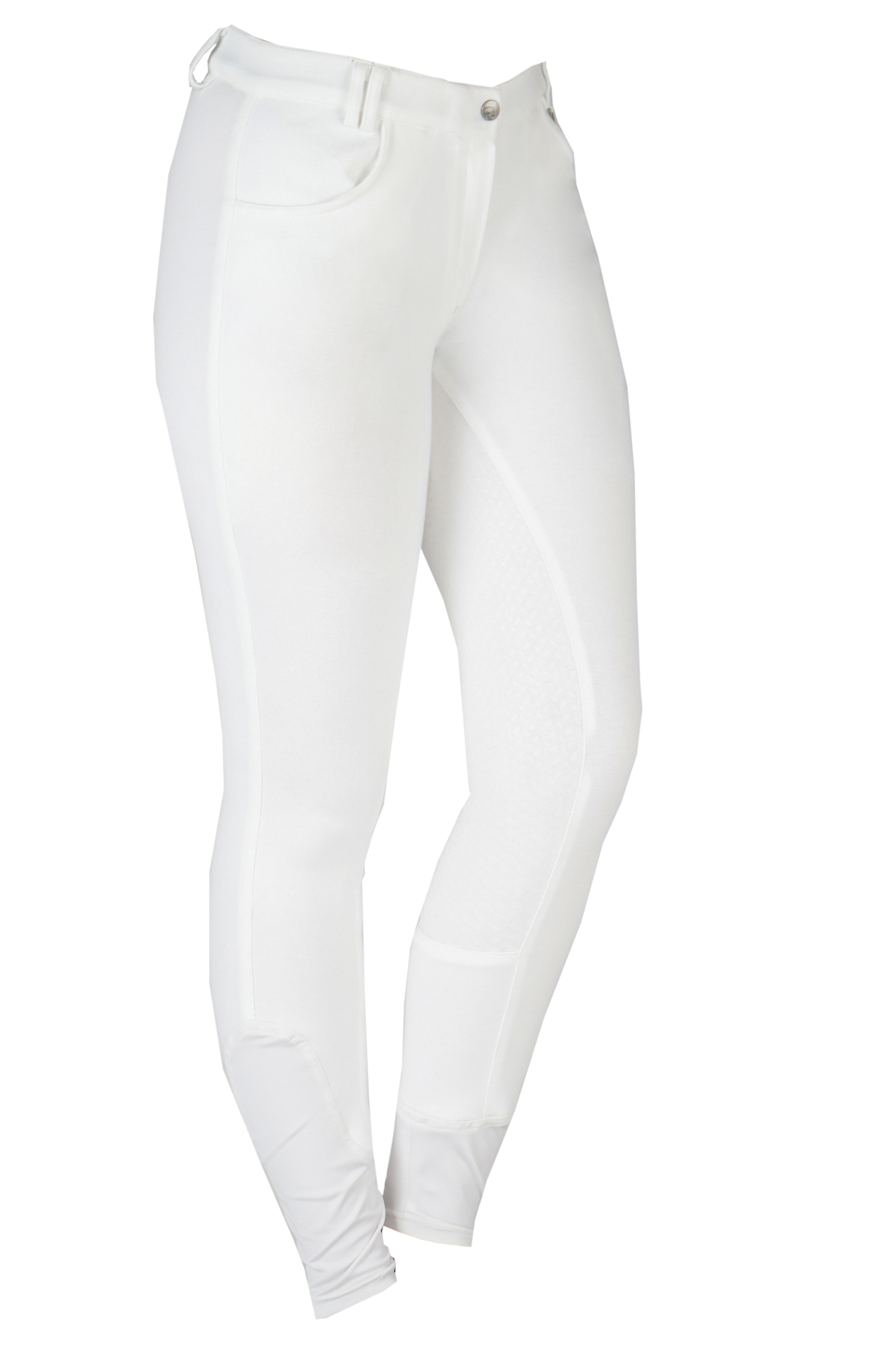 Basic women’s riding breeches with two front pockets and a matte rice silicone seat. Product specifications: Basic knitted cotton riding breeches Elastic ankle closure Belt loops Two front pockets Matte silicone seat Material: 95% cotton 5% elastane Knitted
