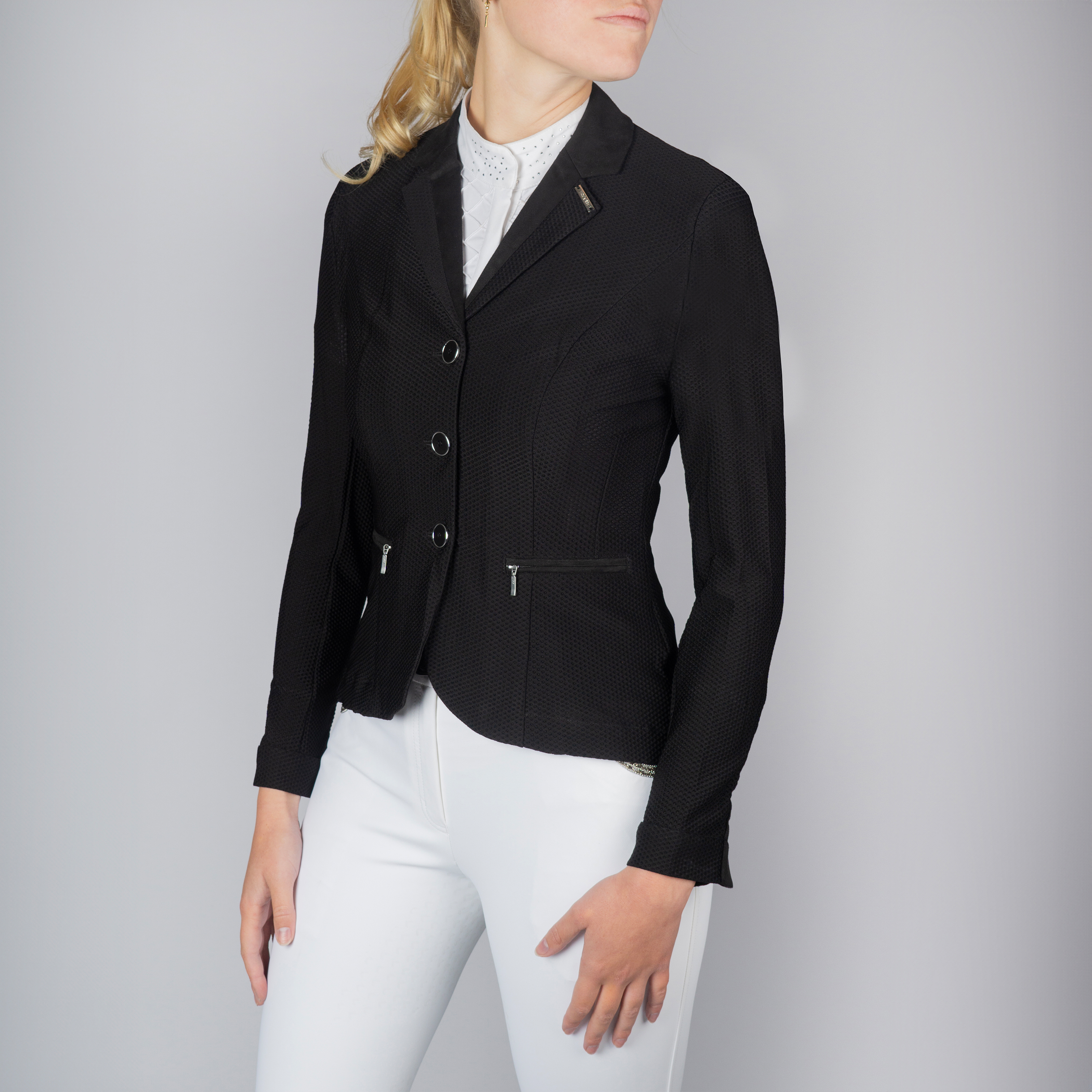 Fashionable competition jacket made of breathable mesh material. : Product specifications: Two front pockets with zipper Suede details and collar Luxury buttons on the front and sleeves Silver HORKA logo on the front and in the collar Packed in a garment bag with hanger : Material: 87% Polyamide 13% Spandex :