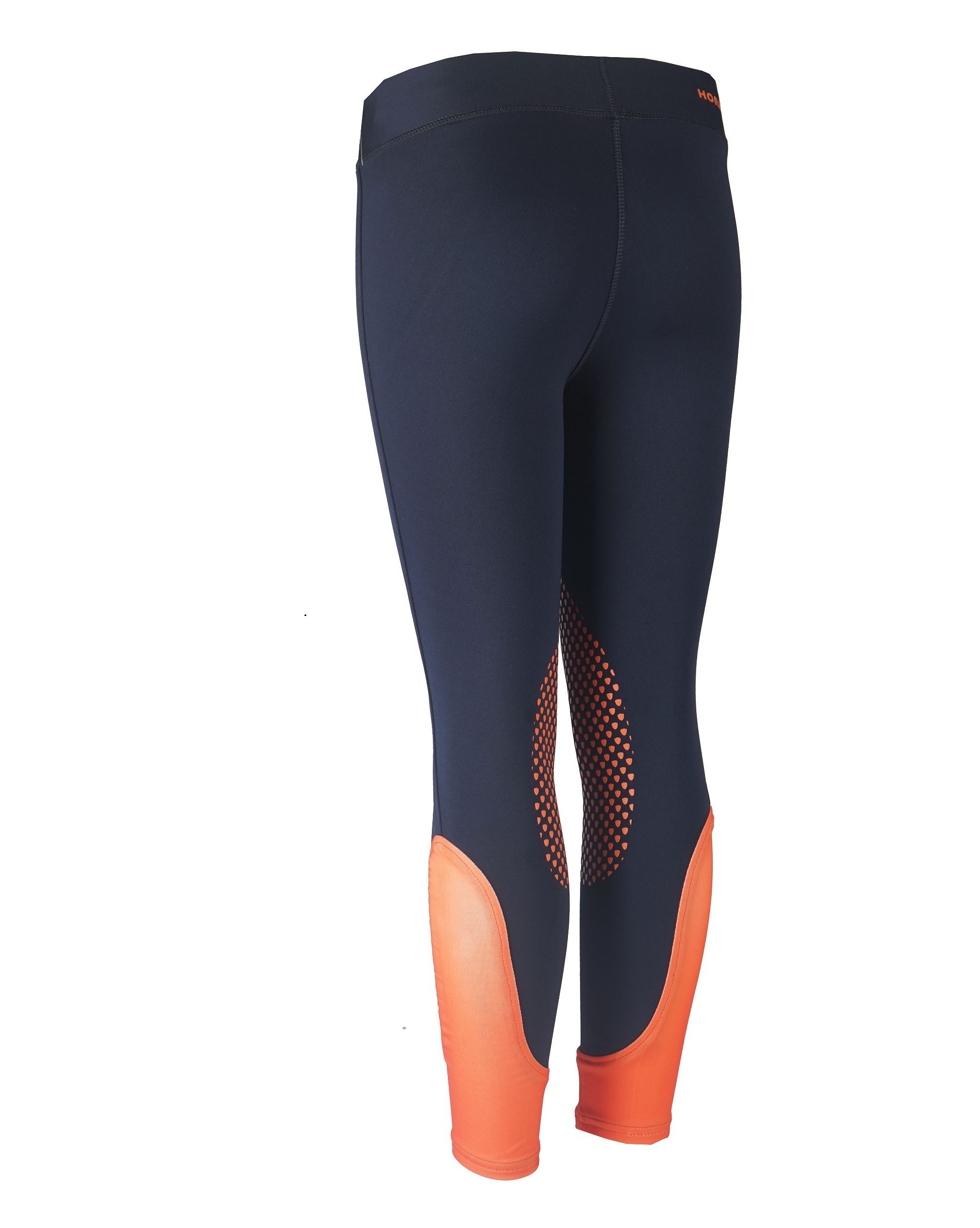 Basic riding leggings with coloured lycra ankles. The Lucy riding tights has a printed silicone knee pad.