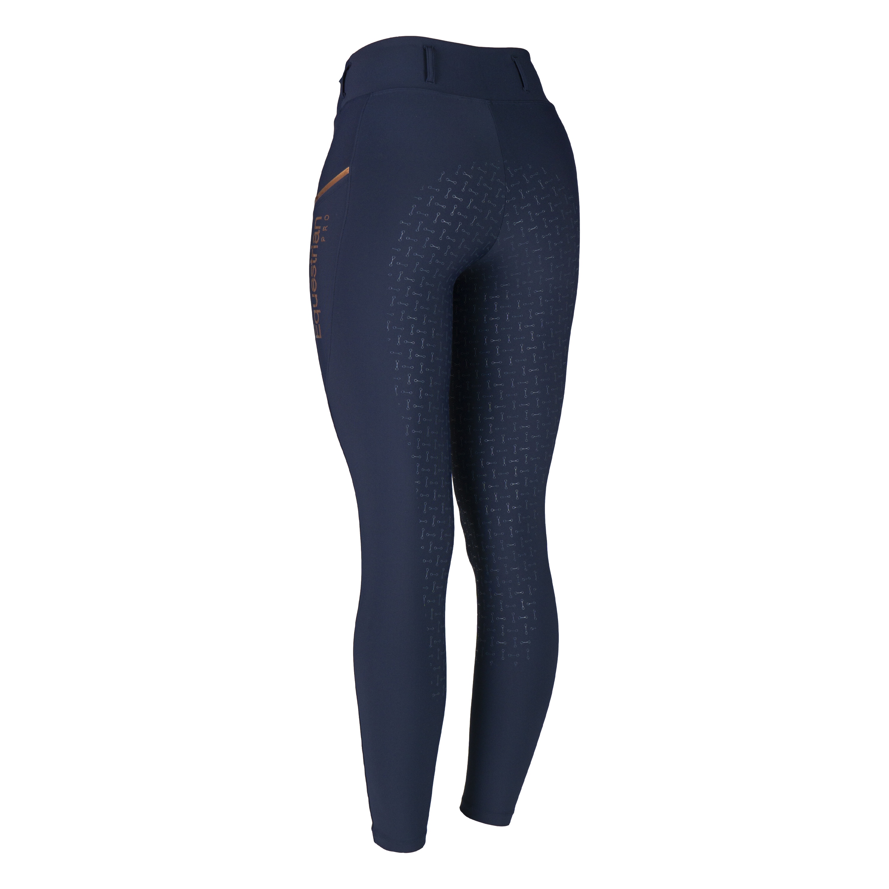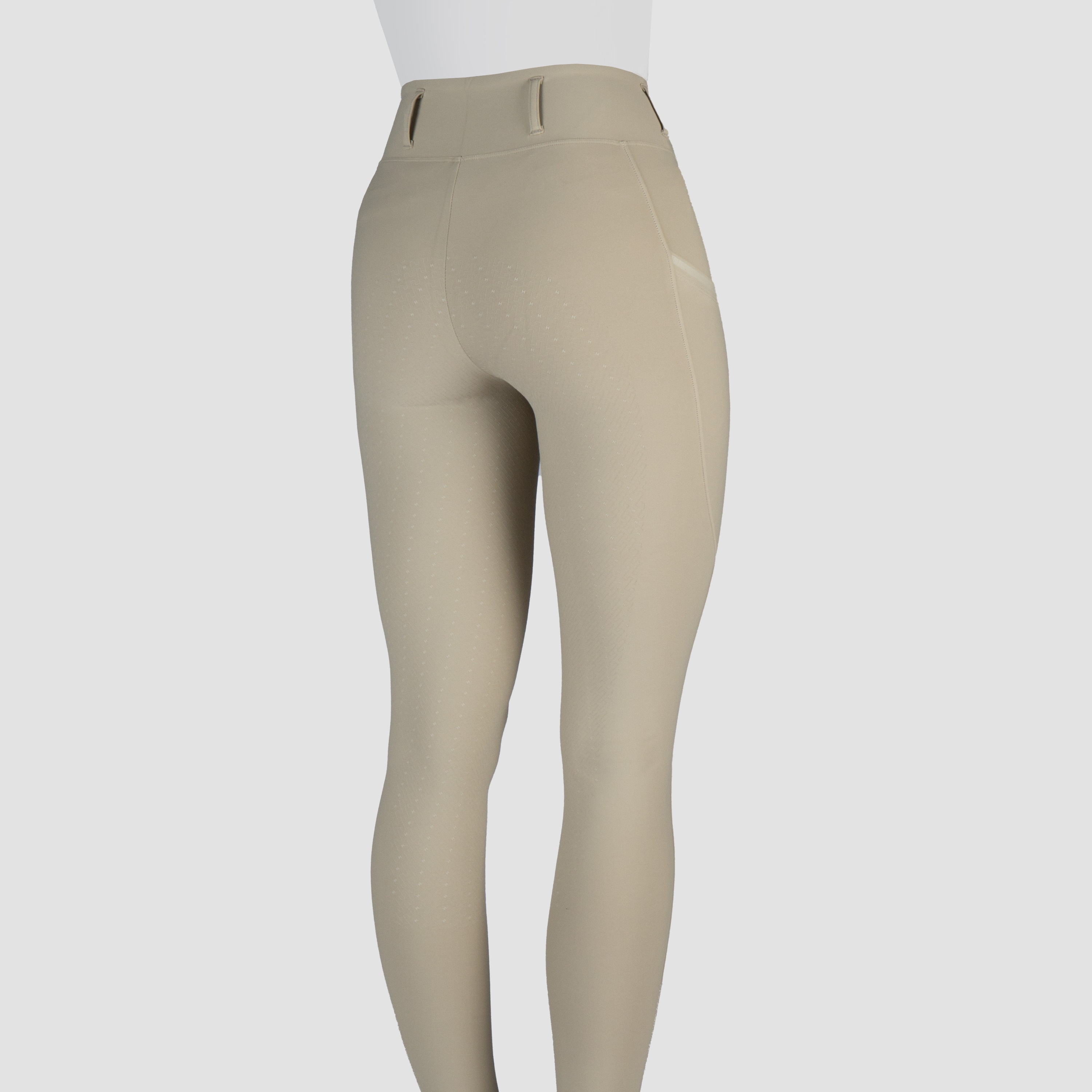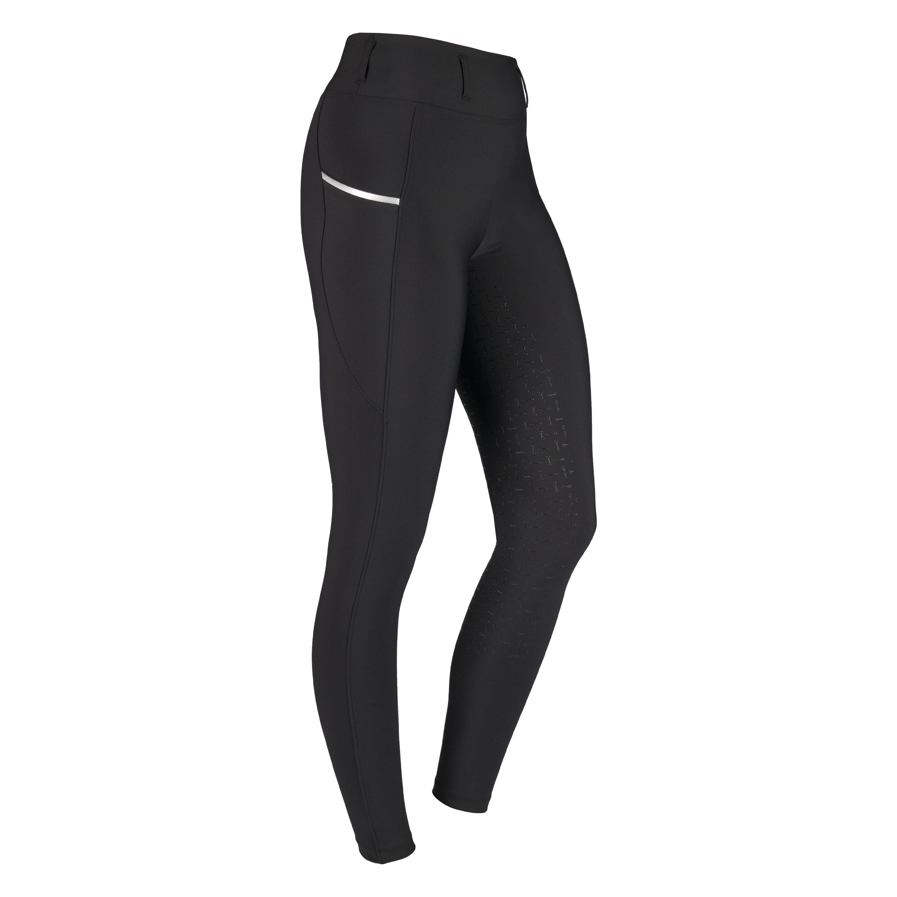 Beautifully designed riding tights in high-quality comfortable and breathable stretch fabric. The riding tights have a flattering fit with a waistband fitted with belt loops. The silicone printed full seat ensures good grip in the saddle. The tights also feature two side pockets, deep enough for your mobile phone.