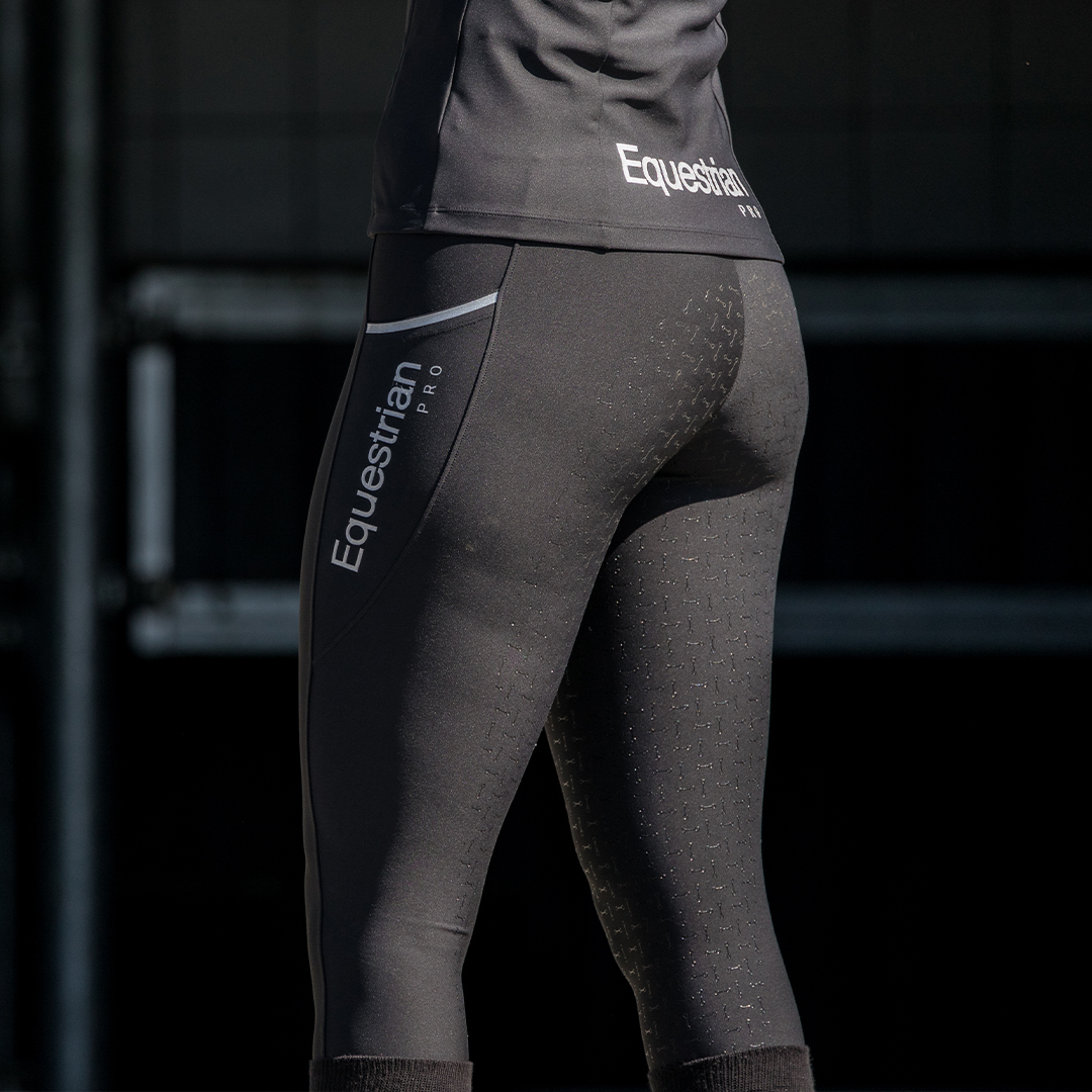 Beautifully designed riding leggings made from high-quality, comfortable, and breathable stretch fabric. The leggings have a flattering fit with a waistband and belt loops. The leggings feature a full silicone seat for good grip in the saddle. The leggings also have two side pockets deep enough to store your mobile phone. Product Specifications: Quick-drying and breathable Waistband with belt loops Two side pockets deep enough for a mobile phone Full silicone seat Material: 78% Polyester 22% Spandex 280 gsm woven