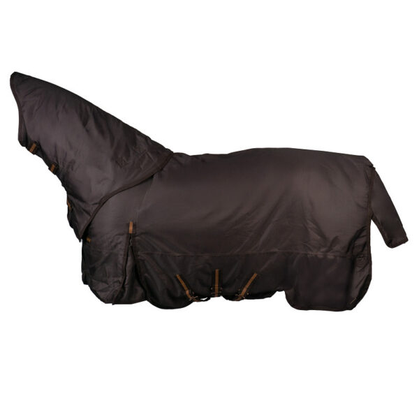 Modern and functional rug designed with the latest features. Made with a durable 1200D ripstop outer fabric that is waterproof and breathable for reliable protection and comfort. The 150 GSM filling and polyester lining provide warmth and softness. The rug features a practical V-neck closure, a removable neck cover attached with four loops, three surcingles for extra stability and a detachable PVC-covered tail cord.