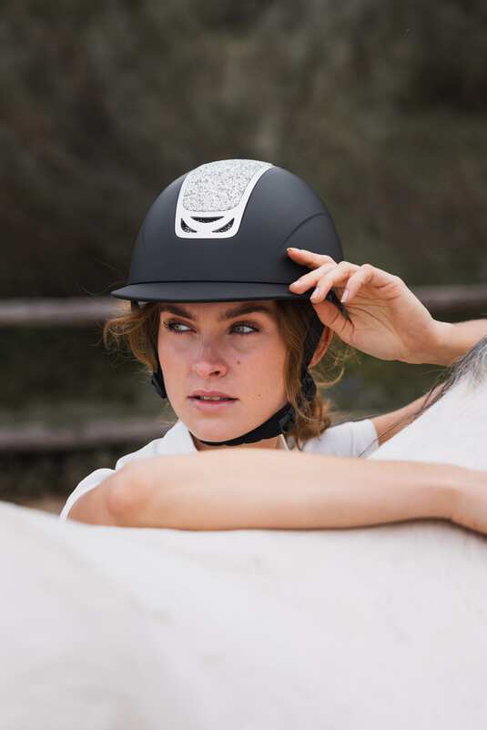 The Horze Arix II helmet can withstand high impact, and ventilation slots offer comfort with plenty of air flow to keep your head cool. The crystal panels with glitter on the outer shell of the helmet add a touch of elegance to your riding outfit and come in a variety of stylish colours. The wide visor provides extra cover. The dial system allows you to adjust it for a perfect fit. Memory foam lining cradles your head in comfort while offering protection in the event of a fall. A flexible peak brim adds more safety.