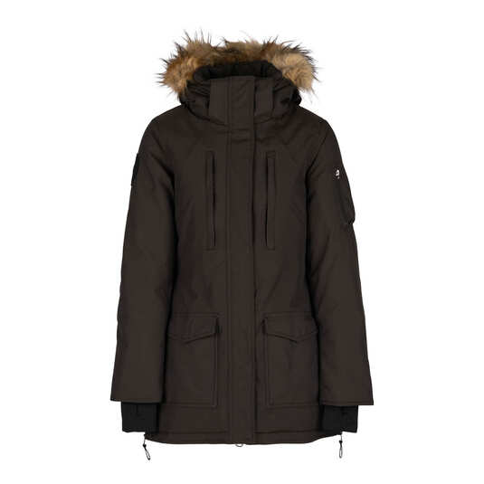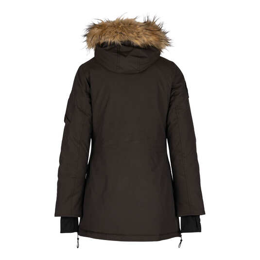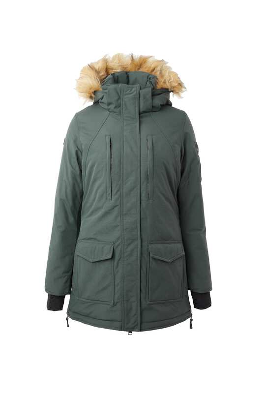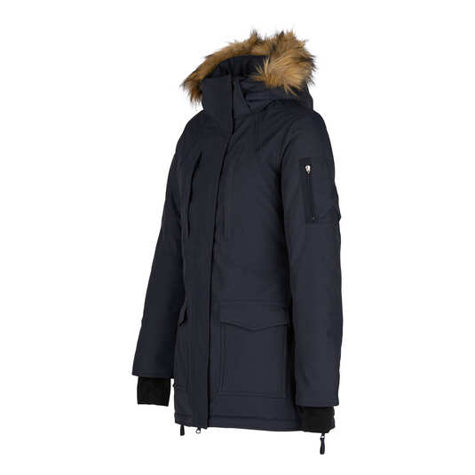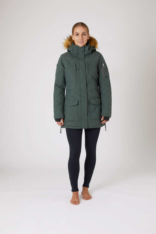 Choose this sporty, long women’s parka for plenty of warmth with function and durability. The jacket is warm, water repellent and windproof for any type of winter weather. The 2-way zipper and zipper side openings are just a few of the many details. Plenty of pockets and a hood with stunning fur trim make this a remarkable coat. The longer cuffs make it easy to pull them over your hands while you ride for added warmth.
