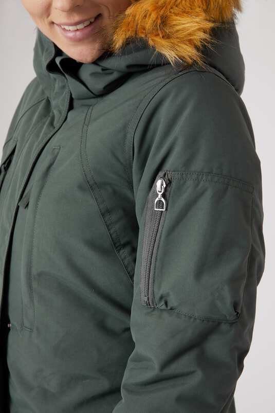 Parka on varustatud mitmete lukuga ja trukkidega taskutega, kuhu saad mugavalt paigutada vajalikud asjad. Kapuuts on eemaldatav ning seda kaunistab eemaldatav kunstkarusnahkne ääris, mis lisab mantlile stiili ja soojust. Pikendatud varrukaotsad saab tõmmata käte peale, et ratsutades oleks lisakaitse külma vastu tagatud.
