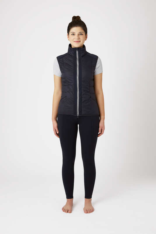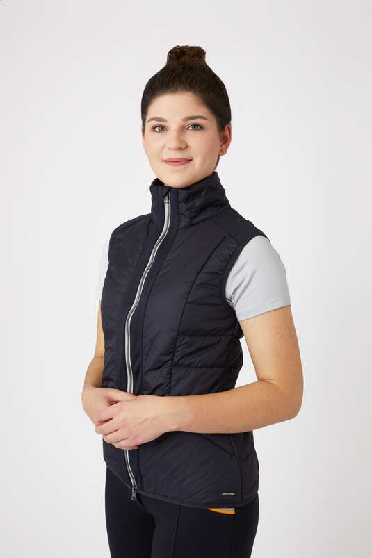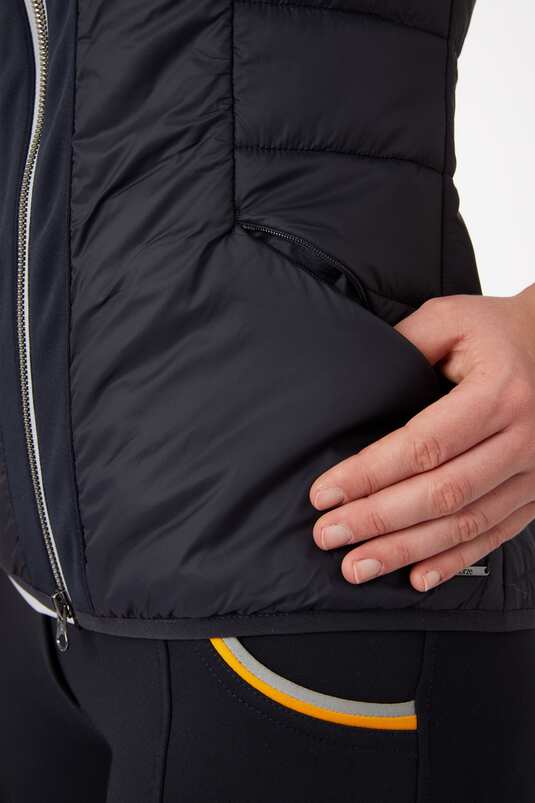 This functional women’s vest has light padding and is quilted at the sides and has a oneside stretch fleece panel at the back middle and also at back of sleeves, to provide optimal moveability when riding. Contrasting piping at hem, armholes and zipper. Water repellent and windproof this is a perfect option for layering. 3D logo print on the back below the neck and a small metal logo plate at the front hem. Two hidden zipper pockets for keeping your belongings safe during rides.