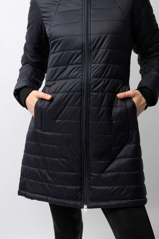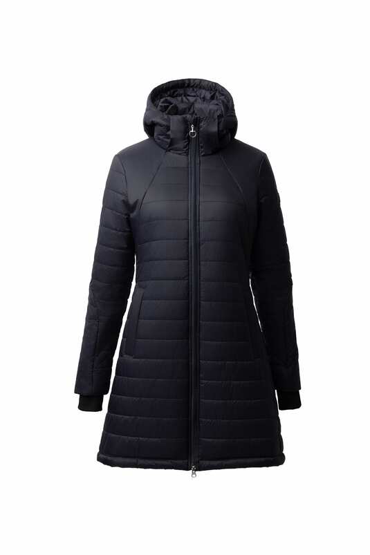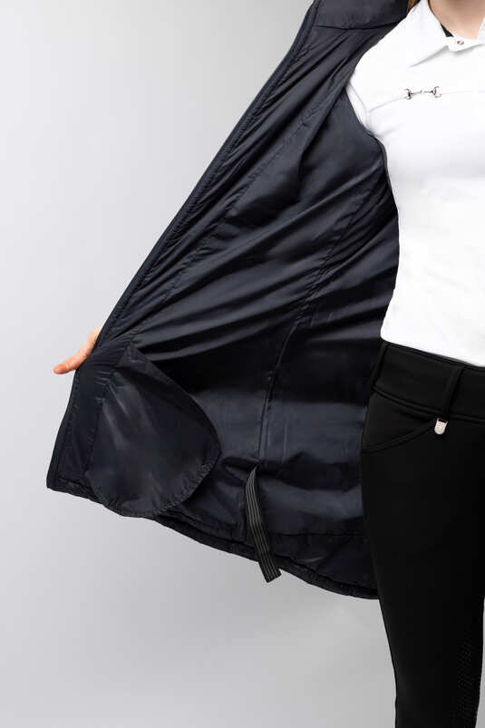 The waterproof, breathable, quilted Horze Charlotte Women’s Long Riding Jacket with soft lining is the perfect choice to cover you and your saddle during cold, snowy winter rides or anytime you want to stay extra warm. The long skirt opens in the back and magnetic snaps keep drafts away while protecting your saddle from scratchy buckles or buttons. Adjustable elastic straps on the inside keep the hem at place when in the saddle. A tapered waist adds a feminine fit to this versatile, long jacket. Highly functional with many details for active riders.