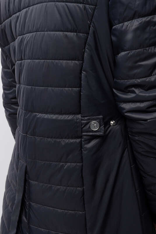 - Opening skirt at back hem with magnetic snap closure Elastic straps inside the coat to keep hem in place