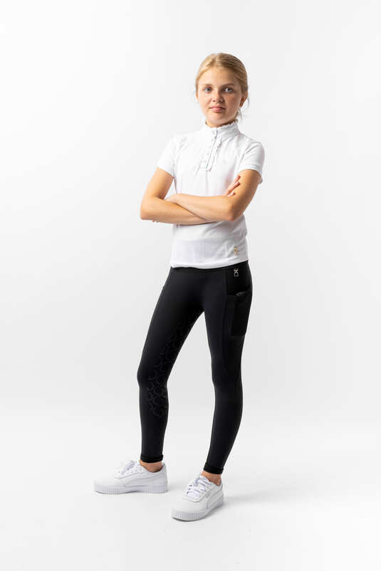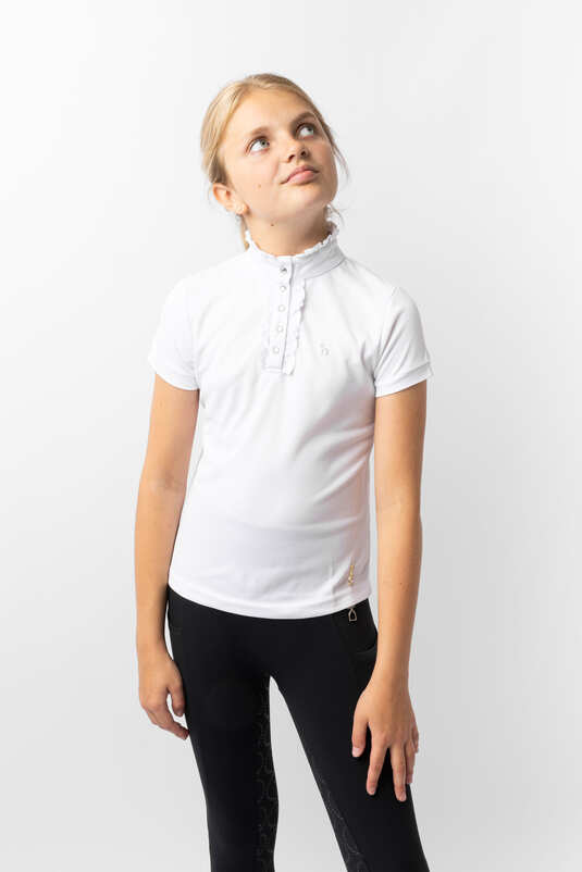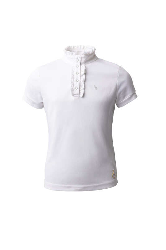 The Horze Christel kids show shirt is the perfect choice for a classy show outfit. Ruffle details at the collar and front placket look traditional, while crystal buttons and a logo at the chest bring a little something extra to your child’s show outfit. The breathable and lightweight fabric will keep young riders comfortable at their next tournament.
