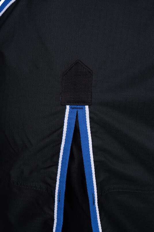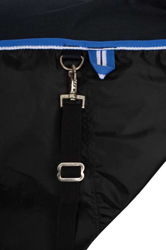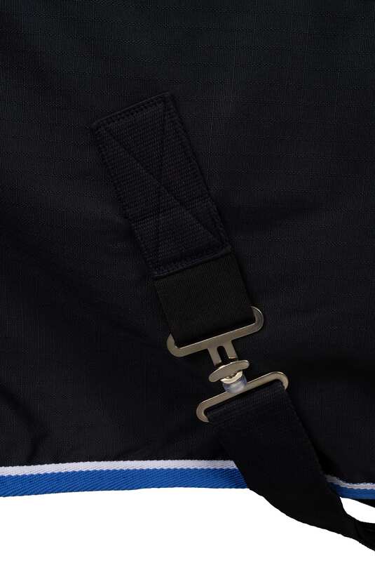 This rug in full neck style is made from a waterproof, breathable fabric. The good fit at the neck and shoulder area makes it comfortable, and the high gussets allow freedom of movement. The front buckles, X-surcingles, leg straps and tail flap secure the turnout.