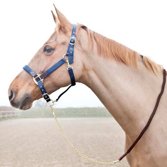 Tugev punutud nöör ja vastupidav messingvärvi kett tagavad kindla kontrolli hobuse käsitlemisel.