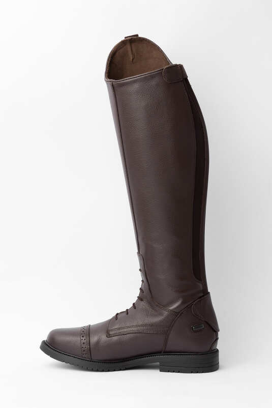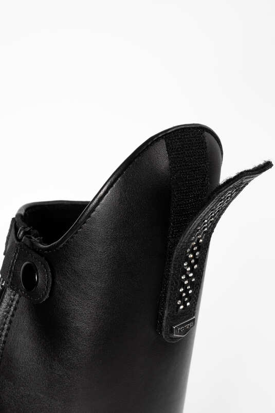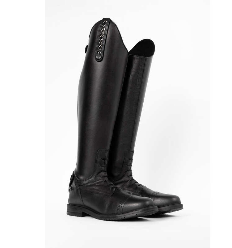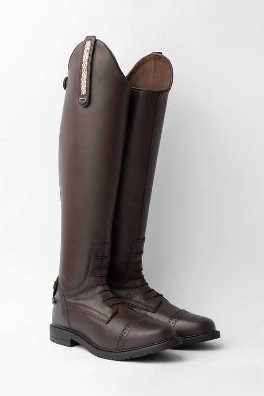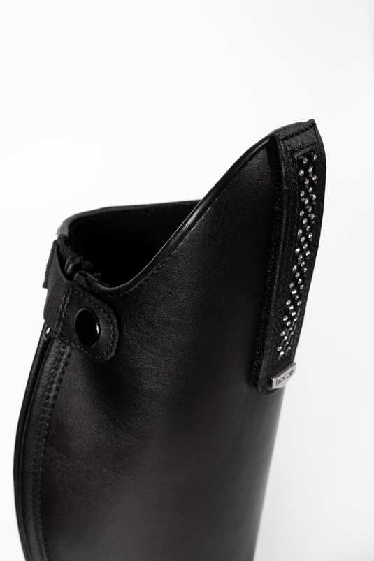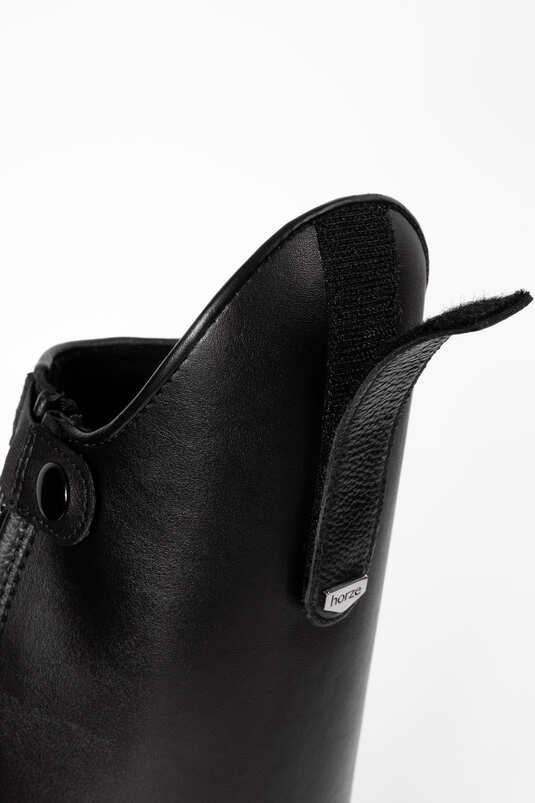 Our Verona Tall boots are both elegant and practical – perfect for competitions where you need to look and perform your best. Both detachable trims feature a small, silver pin with the Horze logo. Smooth leather on the outer leg, and an embossed area of leather on the inner leg combine to create highly professional tall boots. The elastic panel that runs the length of the boot shaft ensures a glove-like fit. The foot has punched details, fixed elastic laces and a handy spur rest. A leather strap with snap buttons at the top and bottom of the zipper keeps this boot securely fastened.