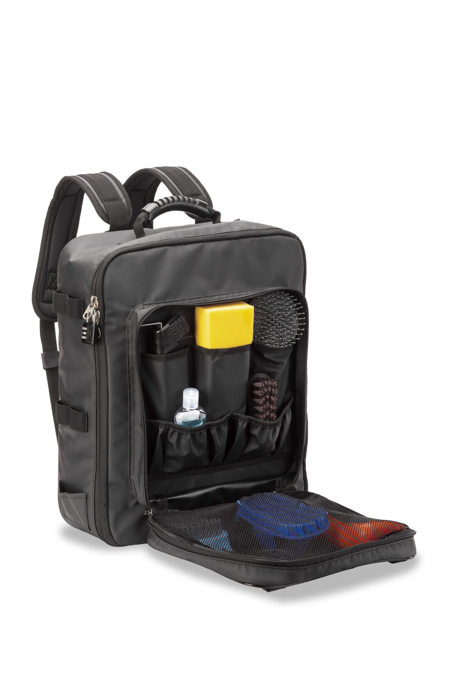 The HORSE & TRAVEL grooming bag, made of 500D high-tenacity tarpaulin, is waterproof and perfectly suited to the needs of professional horse groomers. A compartment stores grooming equipment, while the main compartment can accommodate the owner’s personal belongings, such as a 15″ laptop, a tablet, etc. A mesh pocket for a helmet completes the bag. Furthermore, the padded back and professional straps ensure maximum comfort even when worn for extended periods. The HORSE & TRAVEL grooming bag is customizable and comes with a padlock.