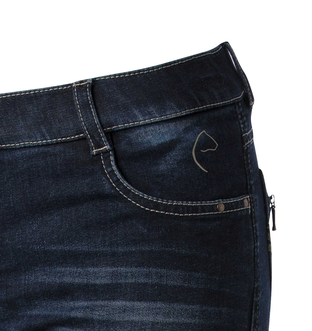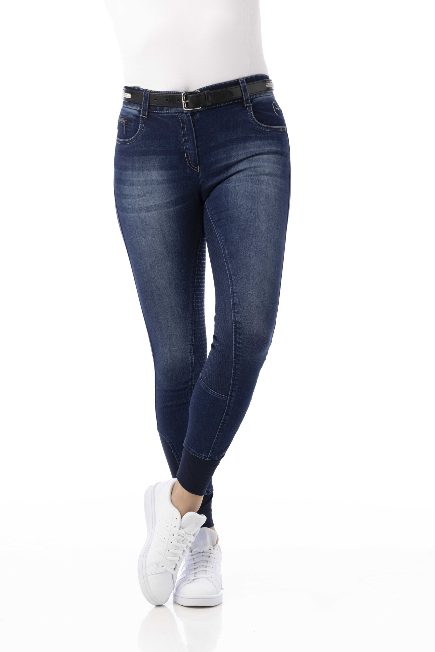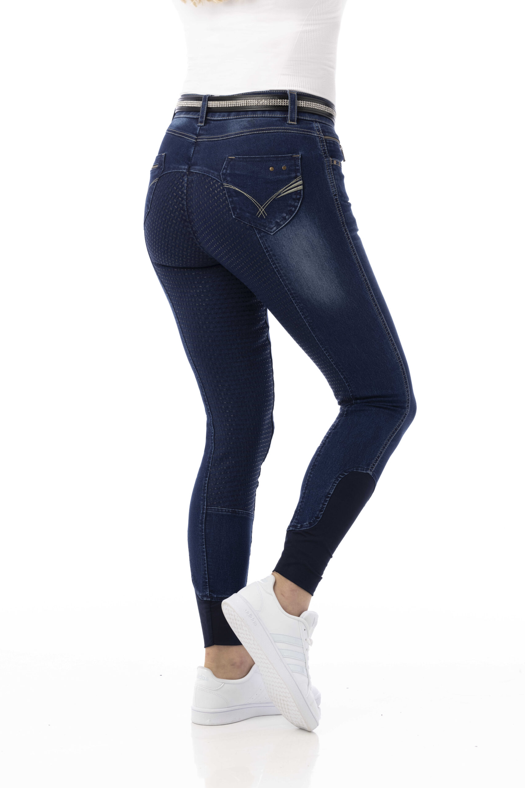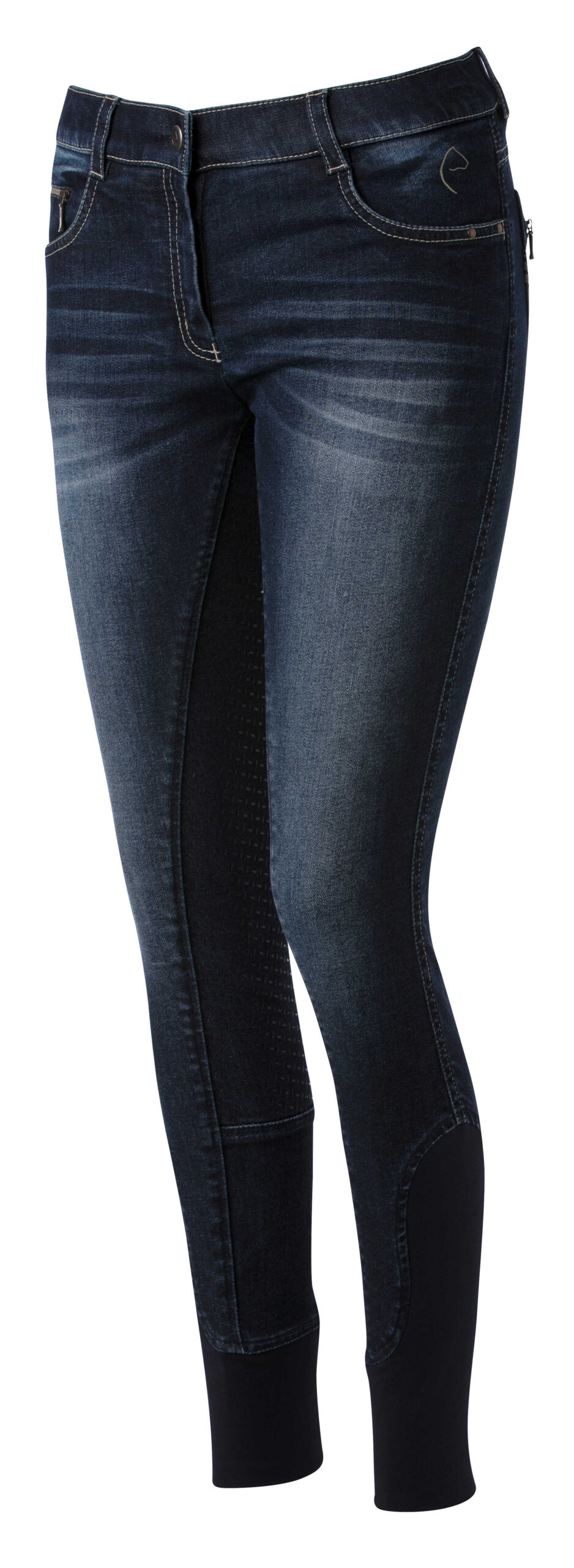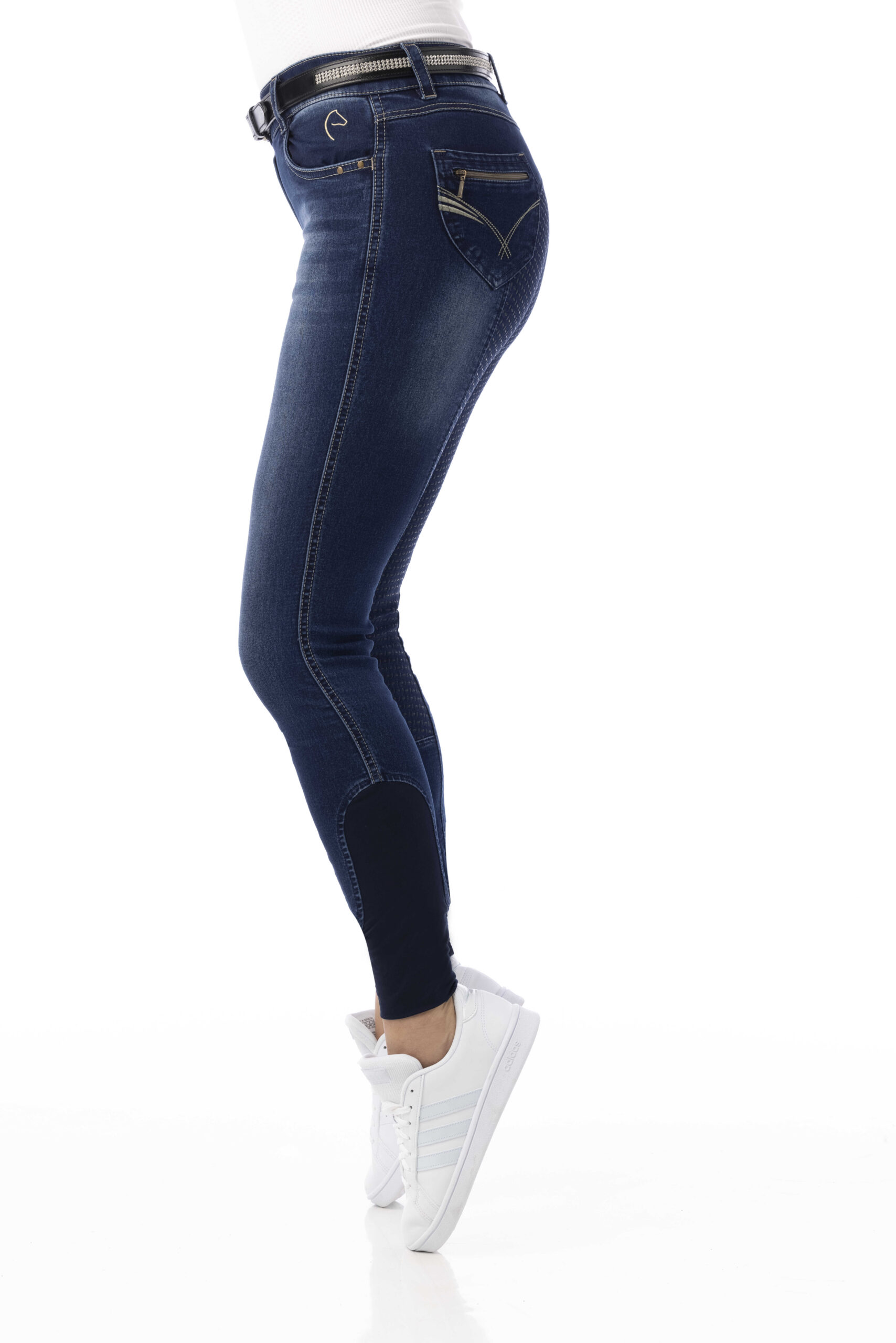 A pair of jeans in a riding breeches version. Comfortable to wear thanks to their stretch denim fabric with contrasting stitching and embroidery on the back pockets. Slant pockets on the front and patch pockets on the back. Straight cut, elastic waistband with belt loops and elastane bottom. ¾ non-slip bottom with silicone inserts for a fixed leg position and unmatched grip. Composition: 97% cotton, 3% elastane. Machine washable at 40°C.