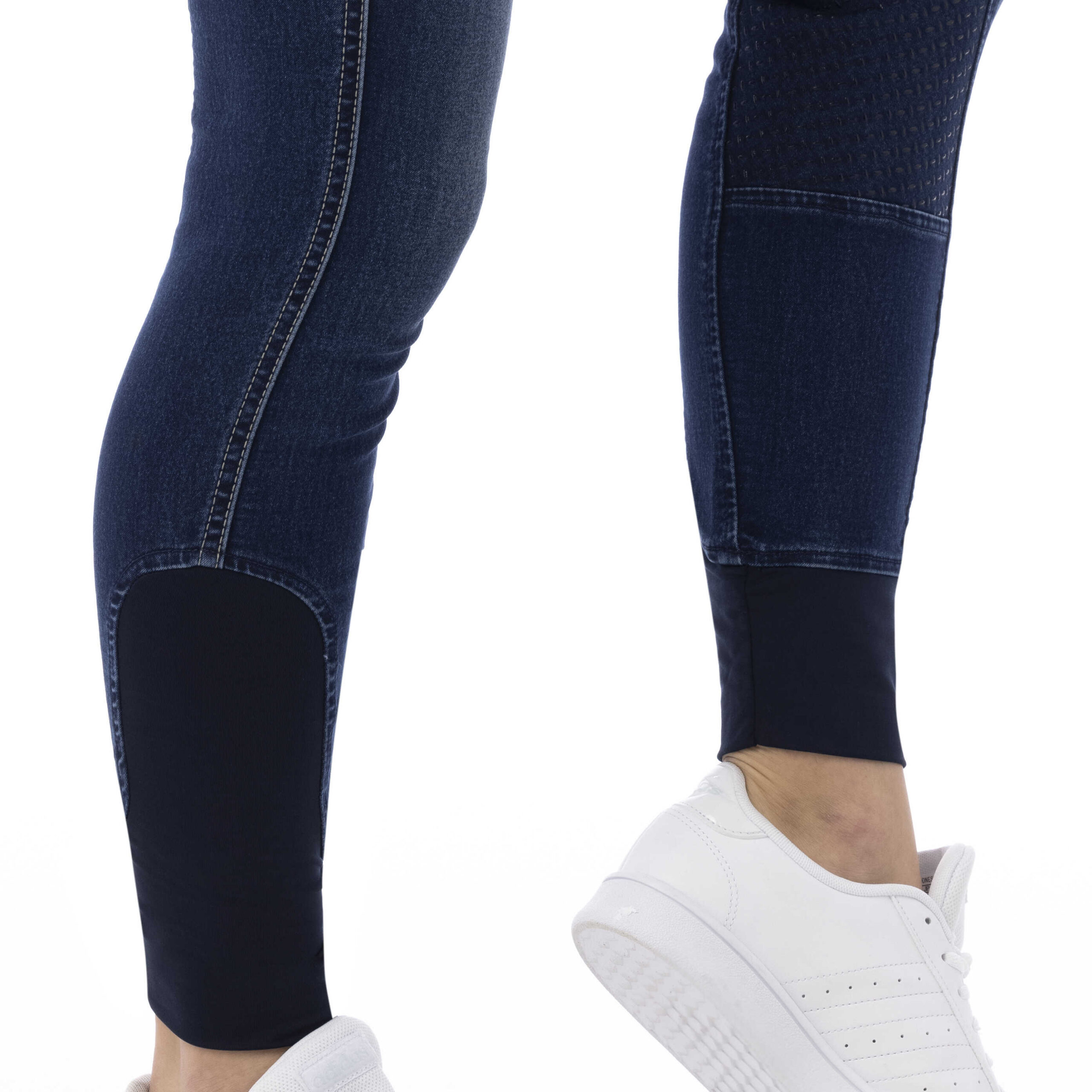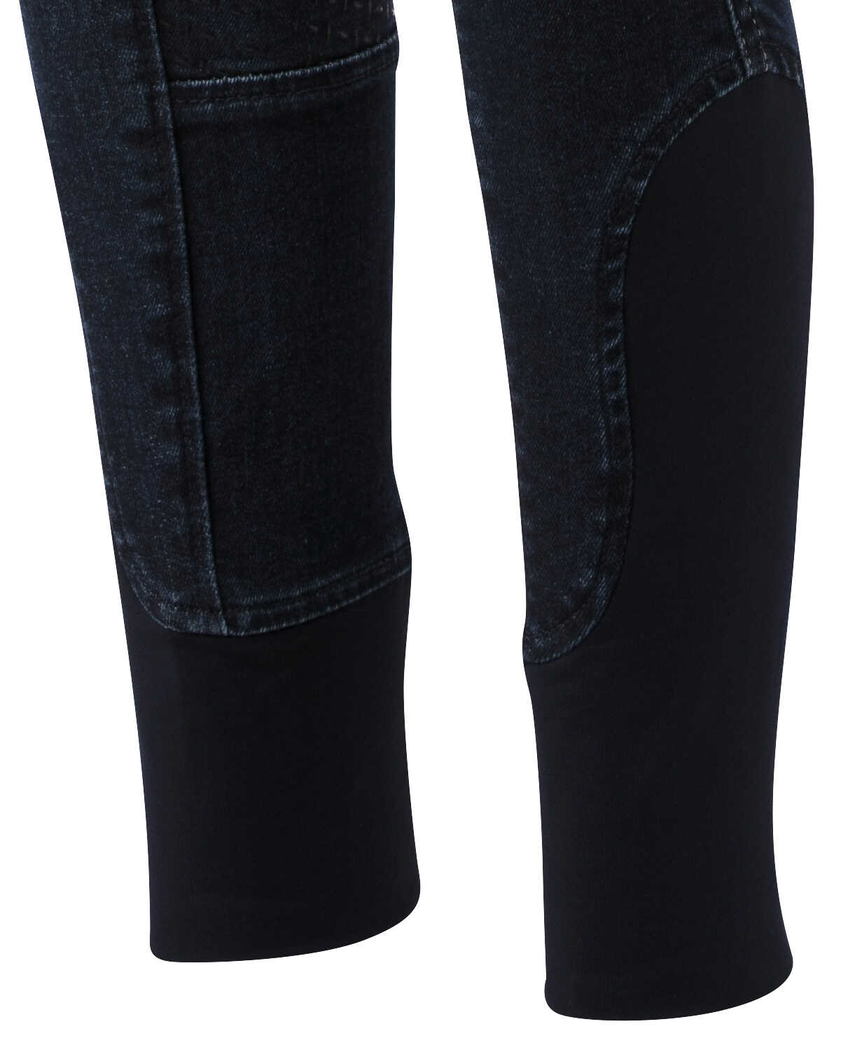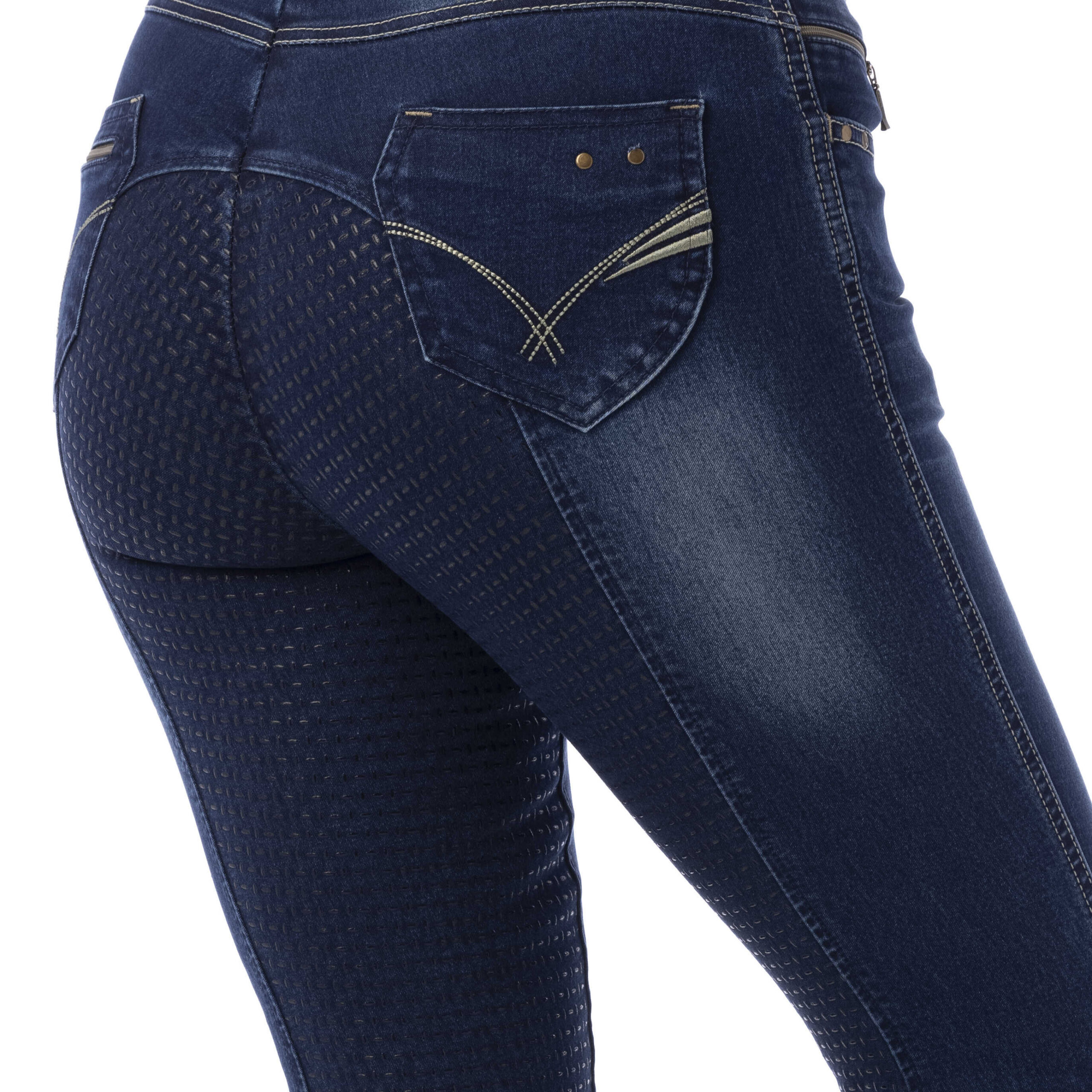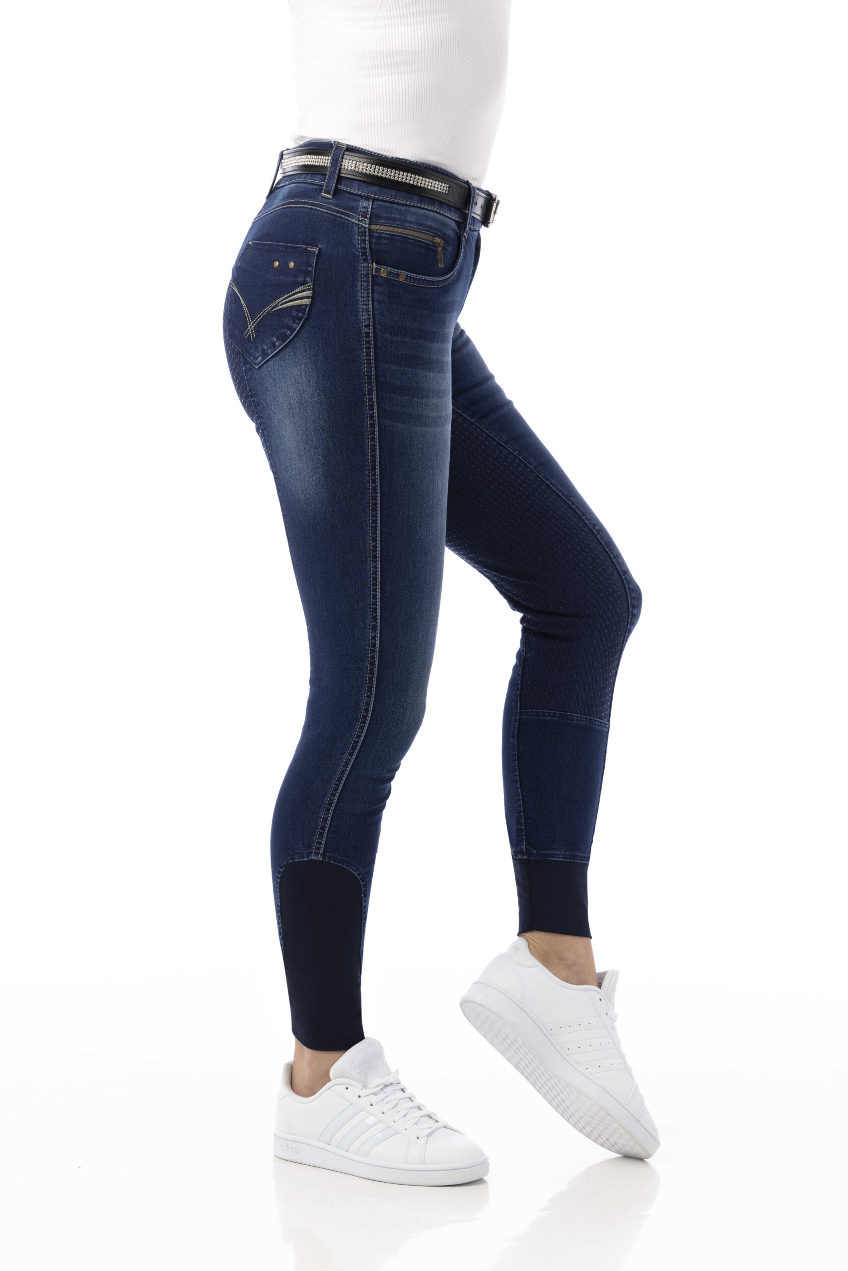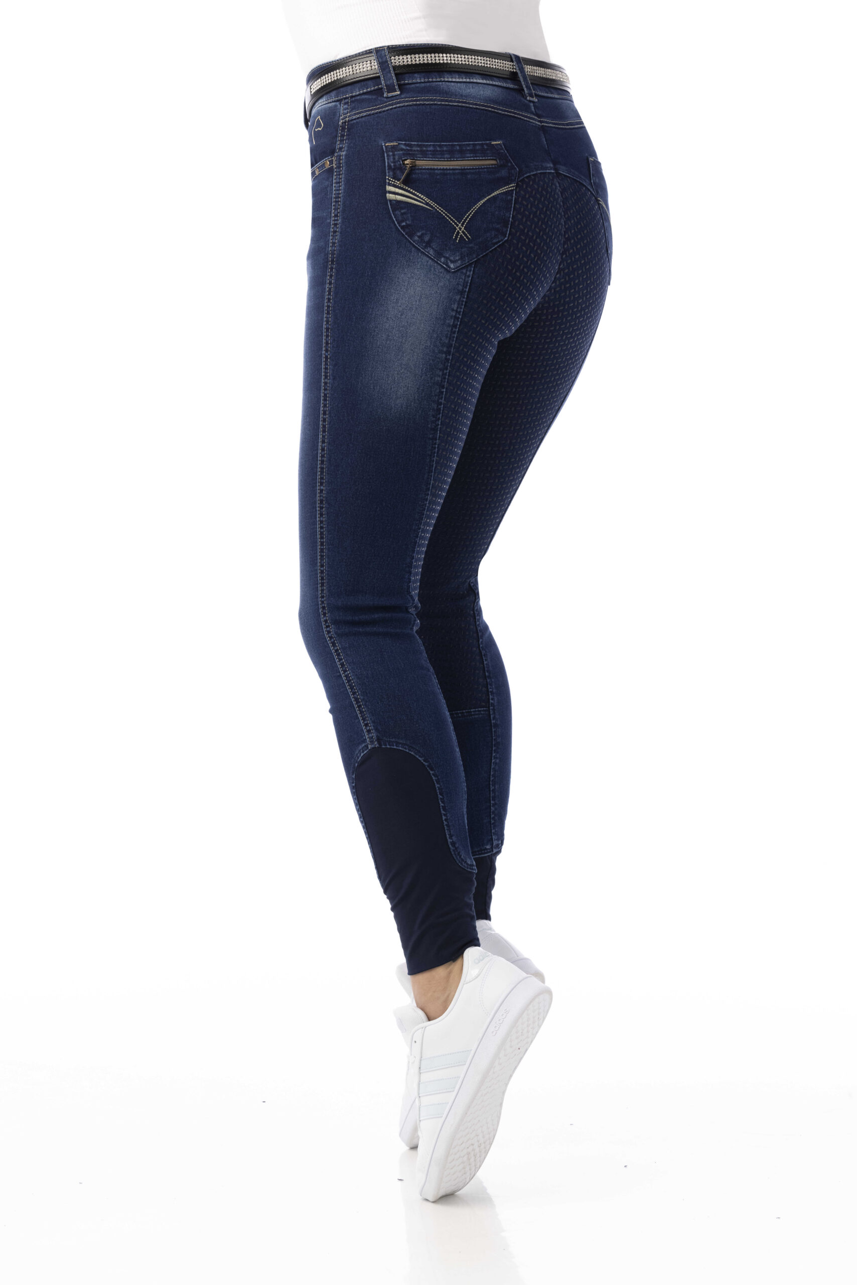 A pair of jeans in a riding breeches version. Comfortable to wear thanks to their stretch denim fabric with contrasting stitching and embroidery on the back pockets. Slant pockets on the front and patch pockets on the back. Straight cut, elastic waistband with belt loops and elastane bottom. ¾ non-slip bottom with silicone inserts for a fixed leg position and unmatched grip. Composition: 97% cotton, 3% elastane. Machine washable at 40°C.