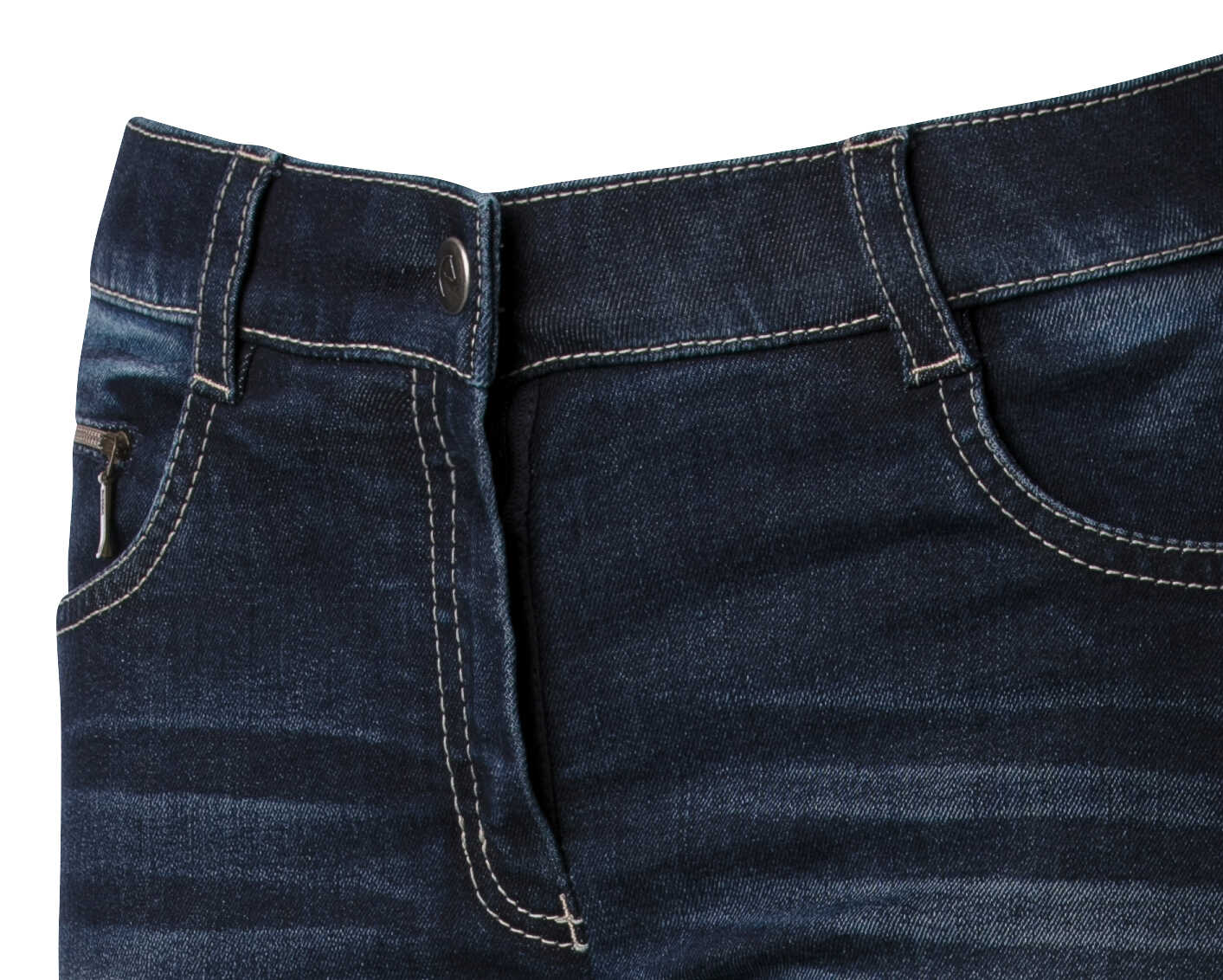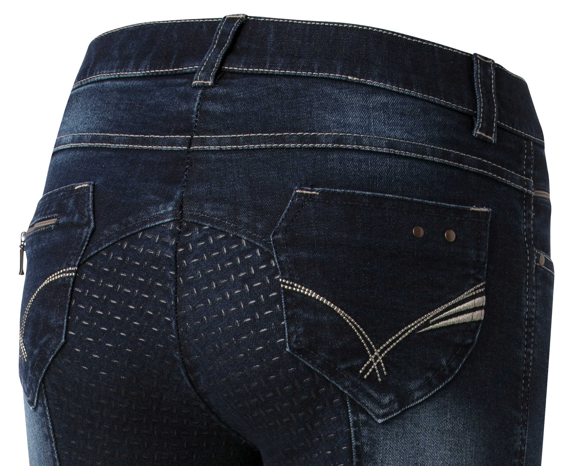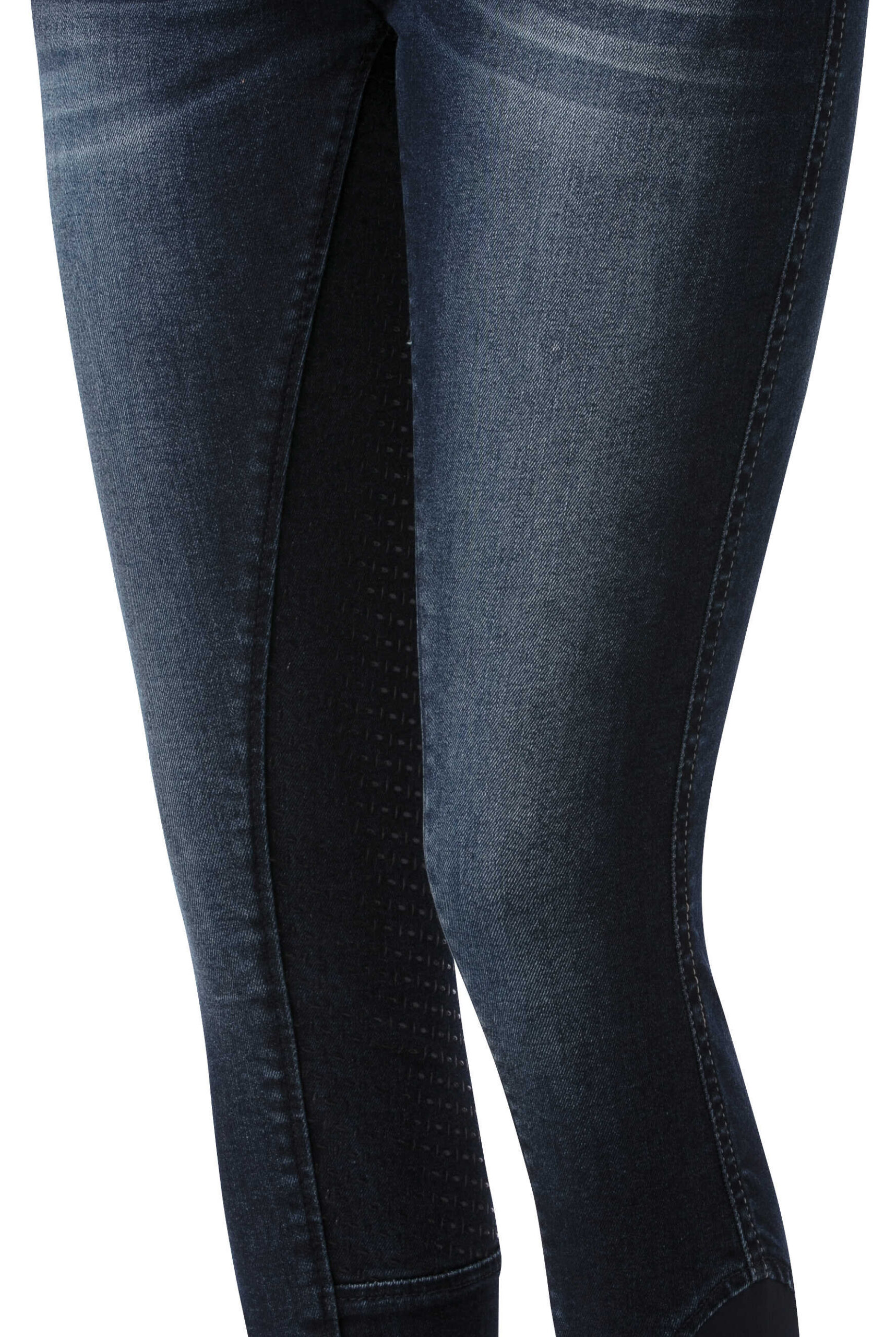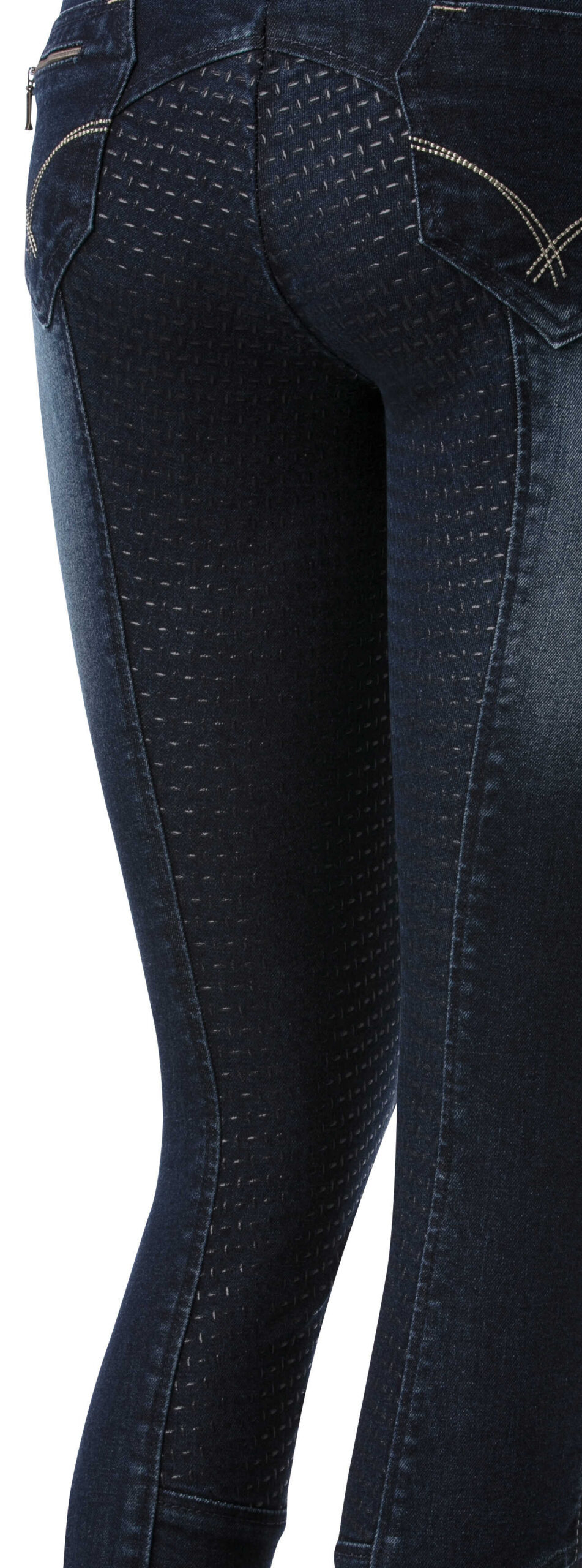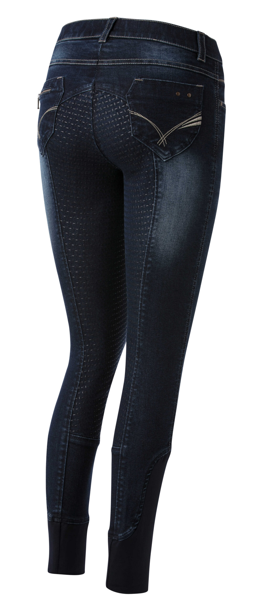 A pair of jeans in a riding breeches version. Comfortable to wear thanks to their stretch denim fabric with contrasting stitching and embroidery on the back pockets. Slant pockets on the front and patch pockets on the back. Straight cut, elastic waistband with belt loops and elastane bottom. ¾ non-slip bottom with silicone inserts for a fixed leg position and unmatched grip. Composition: 97% cotton, 3% elastane. Machine washable at 40°C.