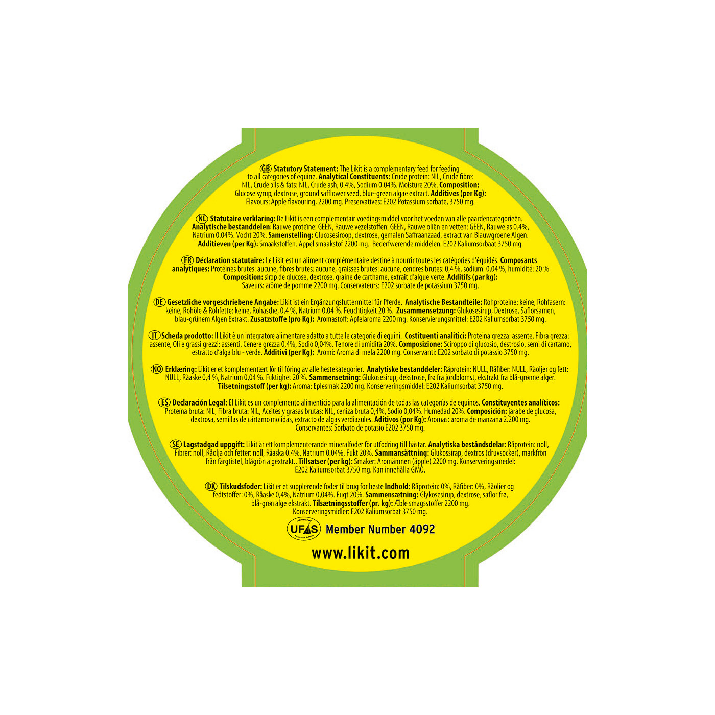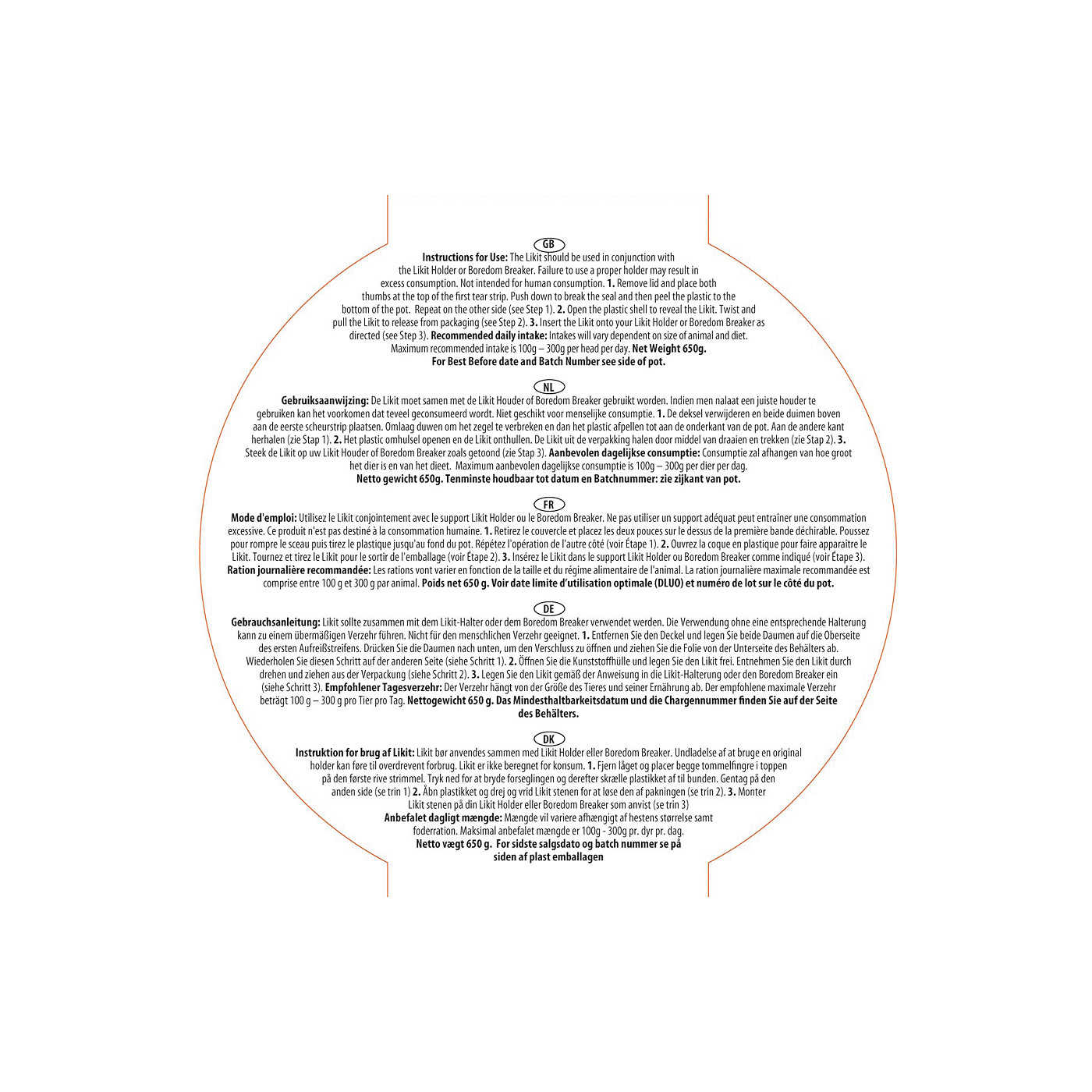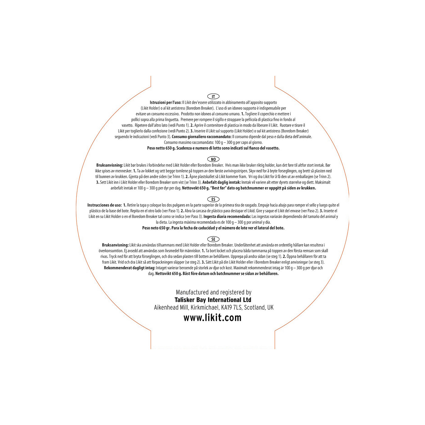 Kasutada ainult koos Likit hoidja või Boredom Breaker’iga. Mitte anda vabalt tarbimiseks ilma hoidjata. Soovituslik päevane kogus sõltub hobuse suurusest ja aktiivsusest – keskmiselt 100–300 g päevas.