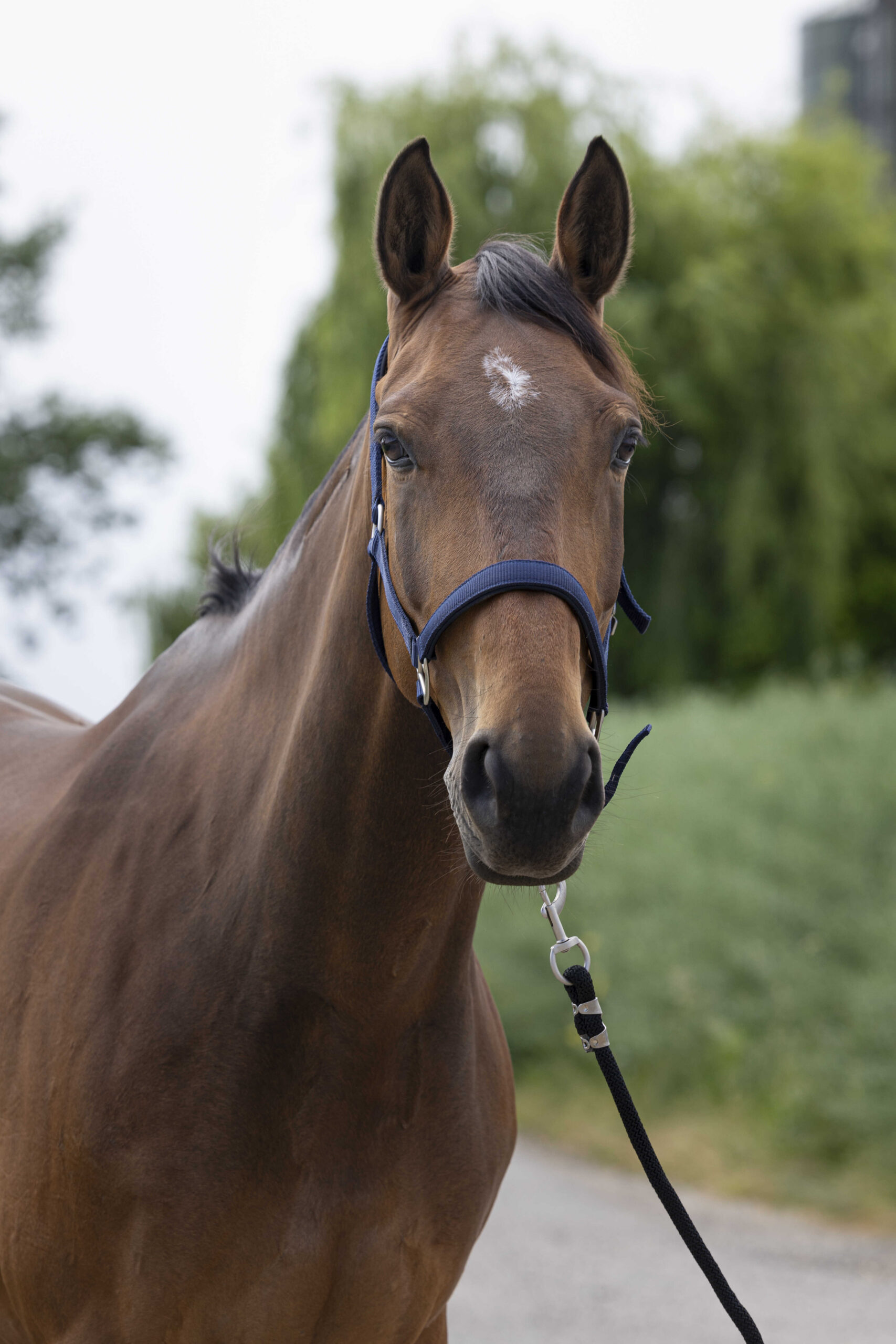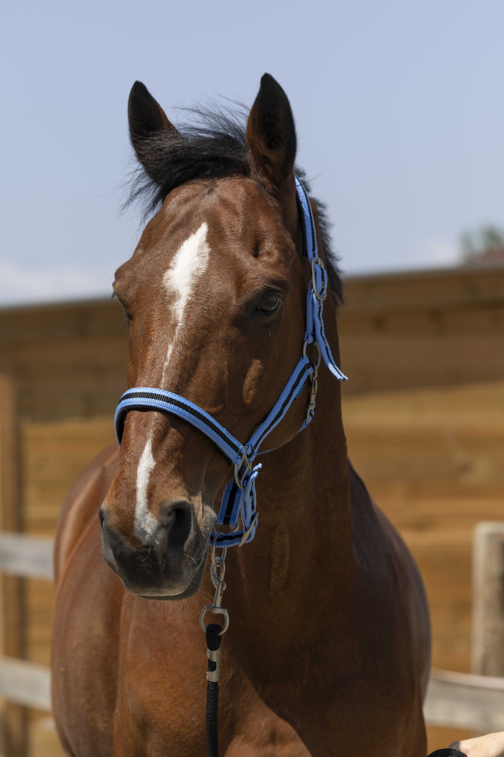 Polypropylene halter with adjustable headpiece and noseband with throat latch. – Neoprene lined noseband and headpiece. – Satin metal buckle printed with the NORTON logo.