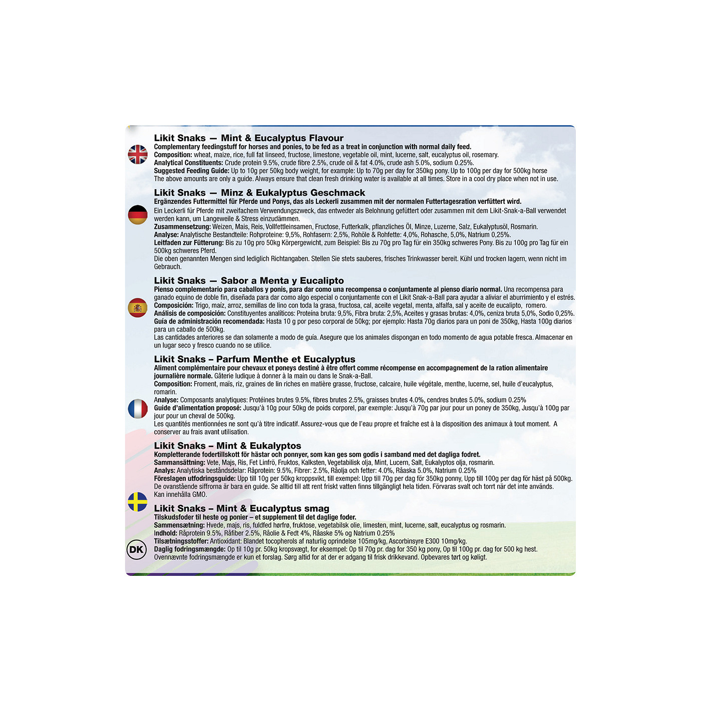 Likit Snaks are tasty, crunchy, heart shaped nibbles that fit easily inside the Likit Snak-a-Ball to alleviate boredom, or can be fed from the hand as a reward or training aid. Containing no artificial colours or flavours, the Snaks come in a delicious Mint & Eucalyptus flavour, and the low sugar formulation making them suitable for all horses and ponies. Each bag contains 500 g. PU 10.