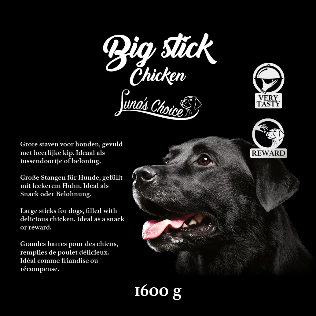 This Big Stick is filled with delicious salmon or chicken and is a semi-moist soft reward. This means that these snacks are still slightly moist and therefore extremely powerful in taste and smell. This stick is a delicious treat for your dog and can also be broken into small pieces for use as a snack during training to encourage good behaviour. These sticks were made in the Netherlands!