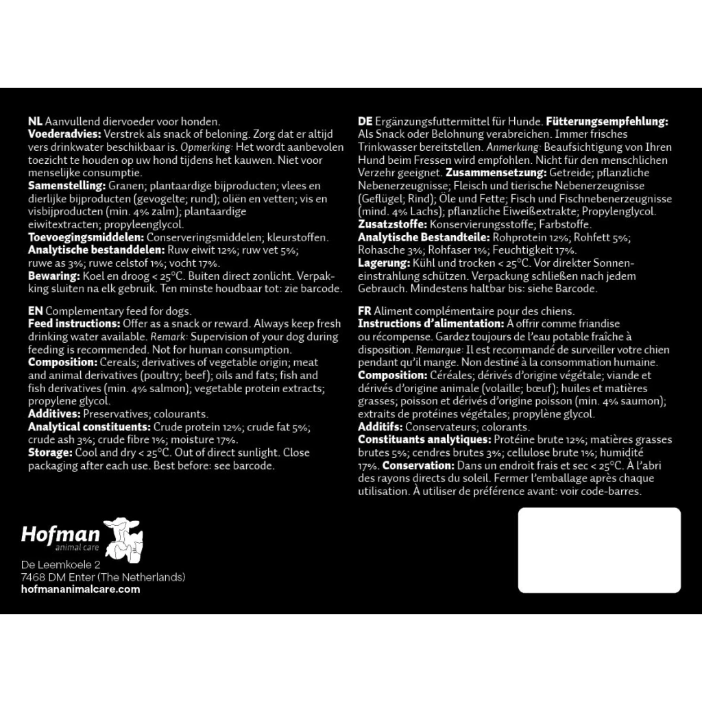All you need is love! And all dogs love this surf and turf snack! This trainer-snack is filled with delicious meat and salmon and is a semi-moist soft reward. This means that these snacks are still slightly moist and therefore extremely powerful in taste and smell. That is why this is the ideal snack for dog trainers and dog parents, in order to reward their dog and puppy for their good behaviour during trainings. These trainer snacks do not contain added sugars and most of all; they were made in the Netherlands!