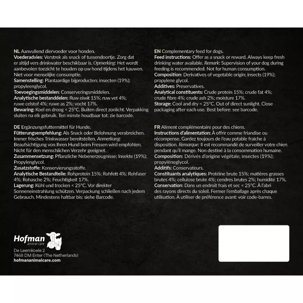 The Insect Sticks are made from insect protein, a hypoallergenic and gluten-free protein source. This makes them particularly suitable for dogs with food sensitivities or allergies.
