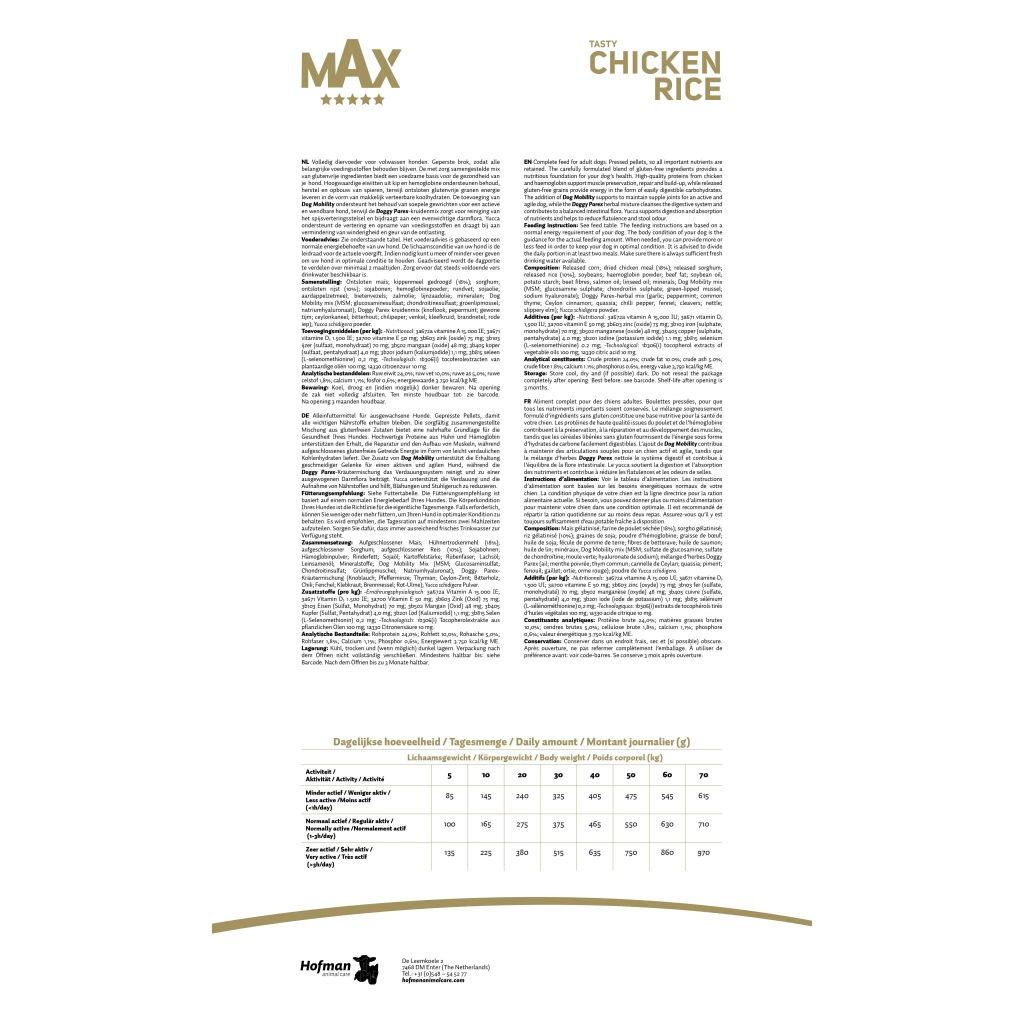 Max Adult Pressed Chunks Chicken & Rice is fully balanced, 5-star feed for adult dogs in the form of pressed kibble. It helps adult dogs stay perfectly balanced. This feed is enriched with 2 of our complementary feeds, namely Dog Mobility and Doggy Parex.
