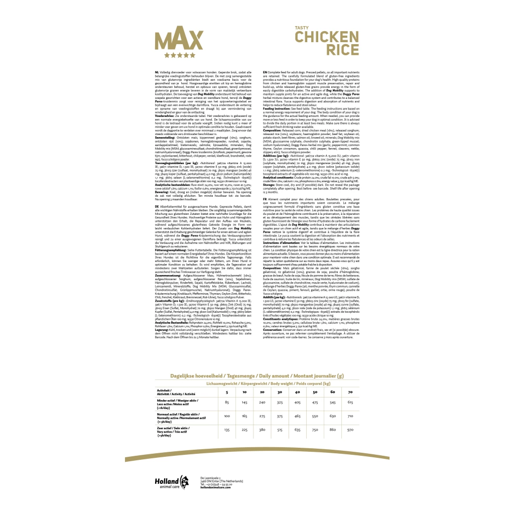 Max Adult Pressed Chunks Chicken & Rice is fully balanced, 5-star feed for adult dogs in the form of pressed kibble. It helps adult dogs stay perfectly balanced. This feed is enriched with 2 of our complementary feeds, namely Dog Mobility and Doggy Parex.