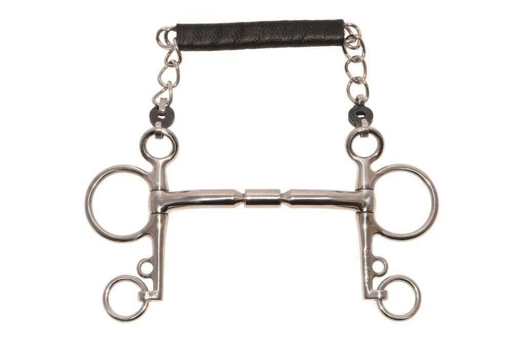 Stainless steel, straight with a rolling centerpiece, short bridles. Curb chain with leather cover. Targeted and effective relief through its impact on the tongue, throat, and lower jaw.