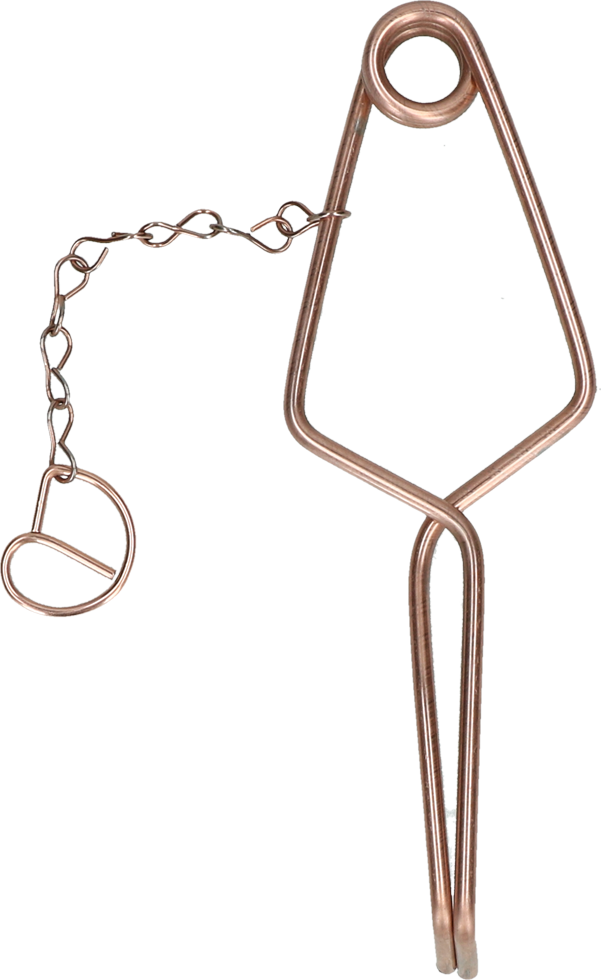 Copper wire clamp to catch vole and field mice. Very easy to use. The clamp ring is attached to a chain to prevent it gets lost in the ground.