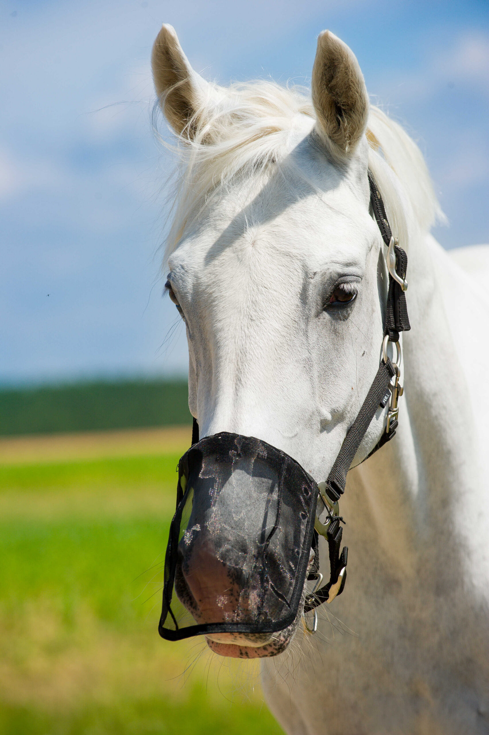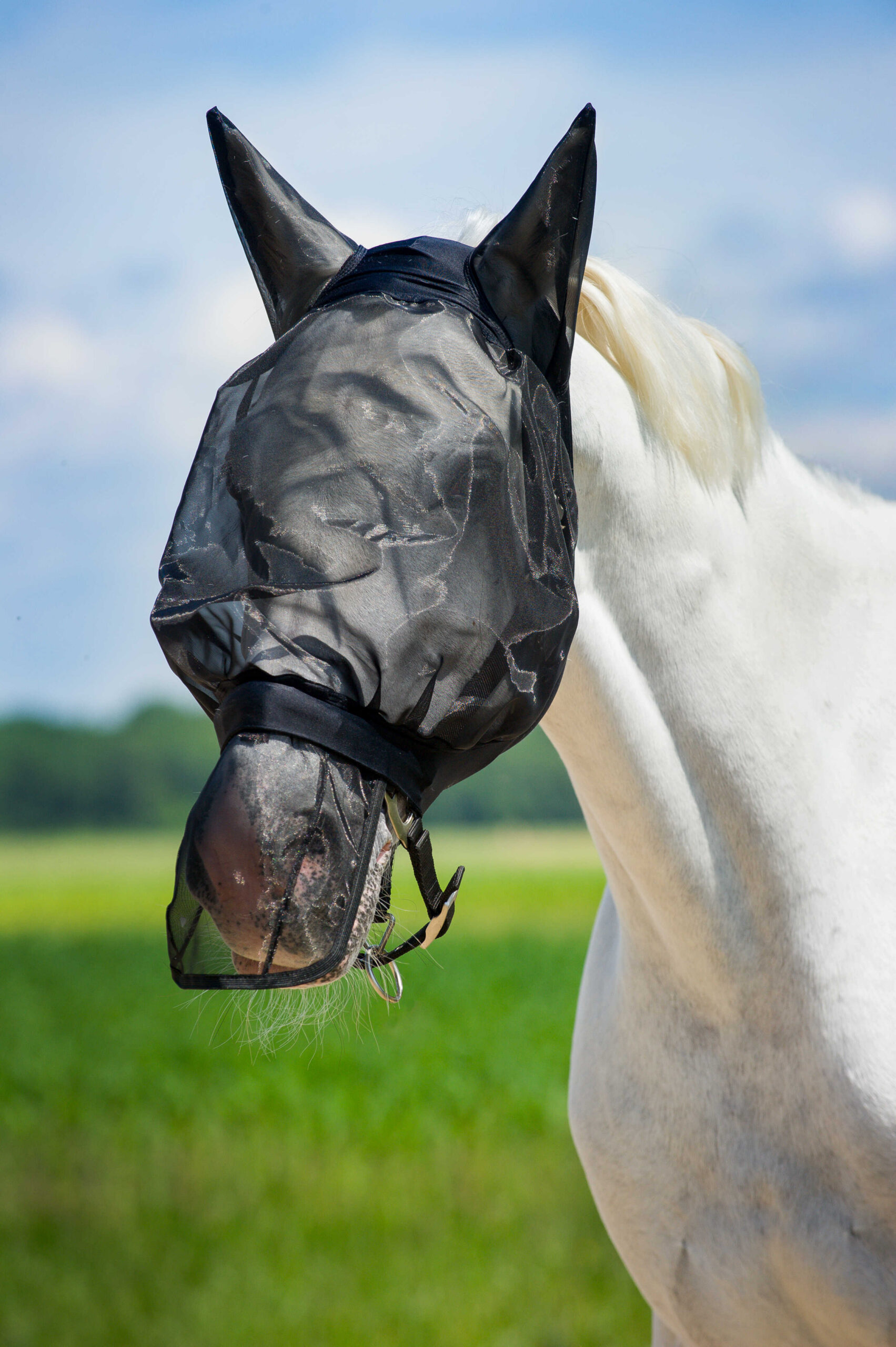 – Velcro closure and two fastening cords for attaching to a noseband or halter.