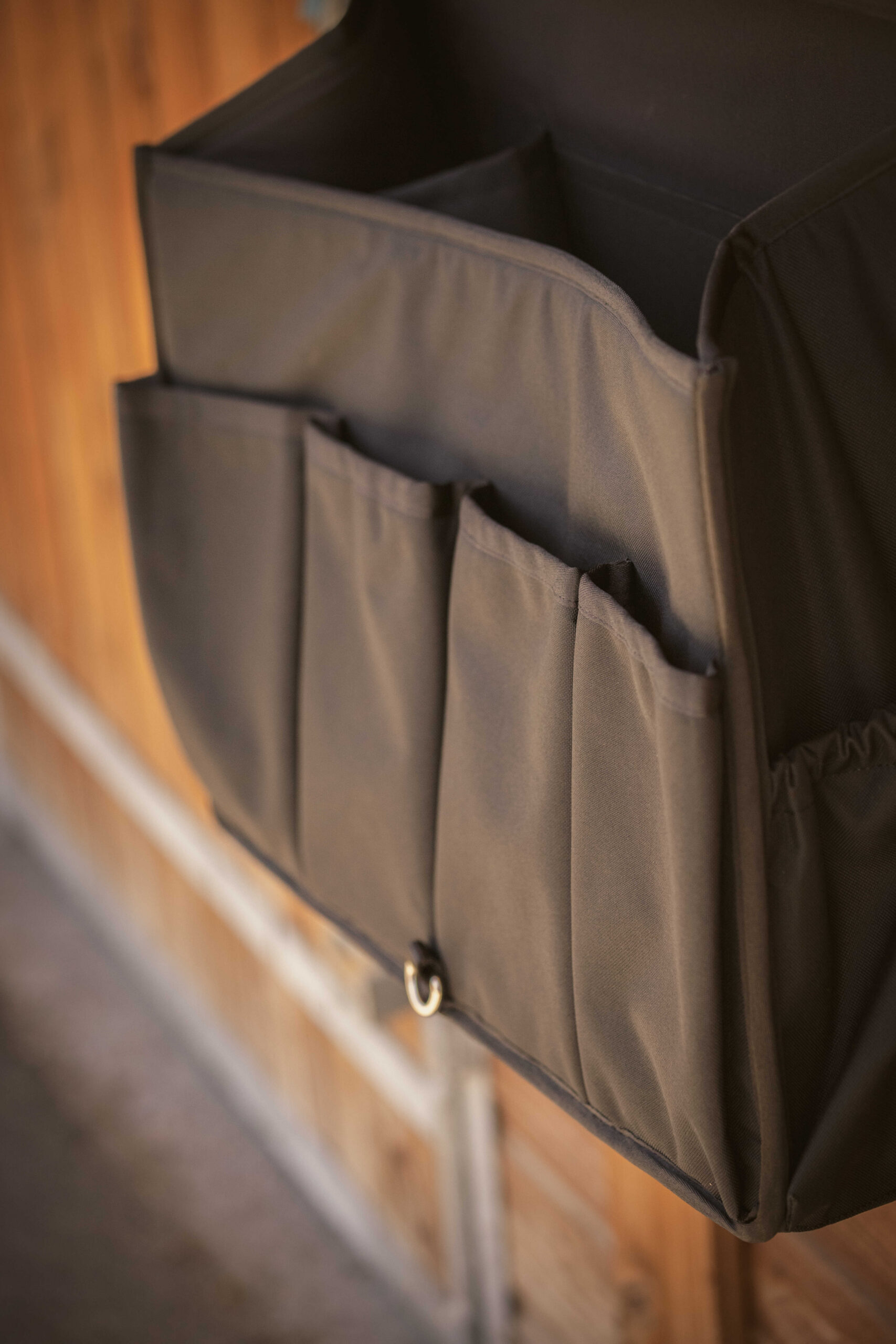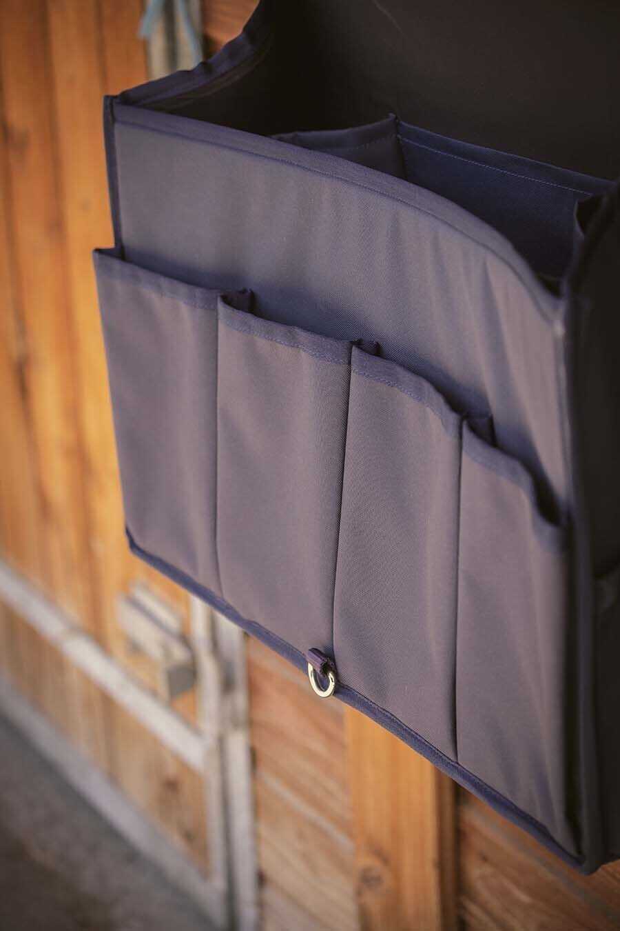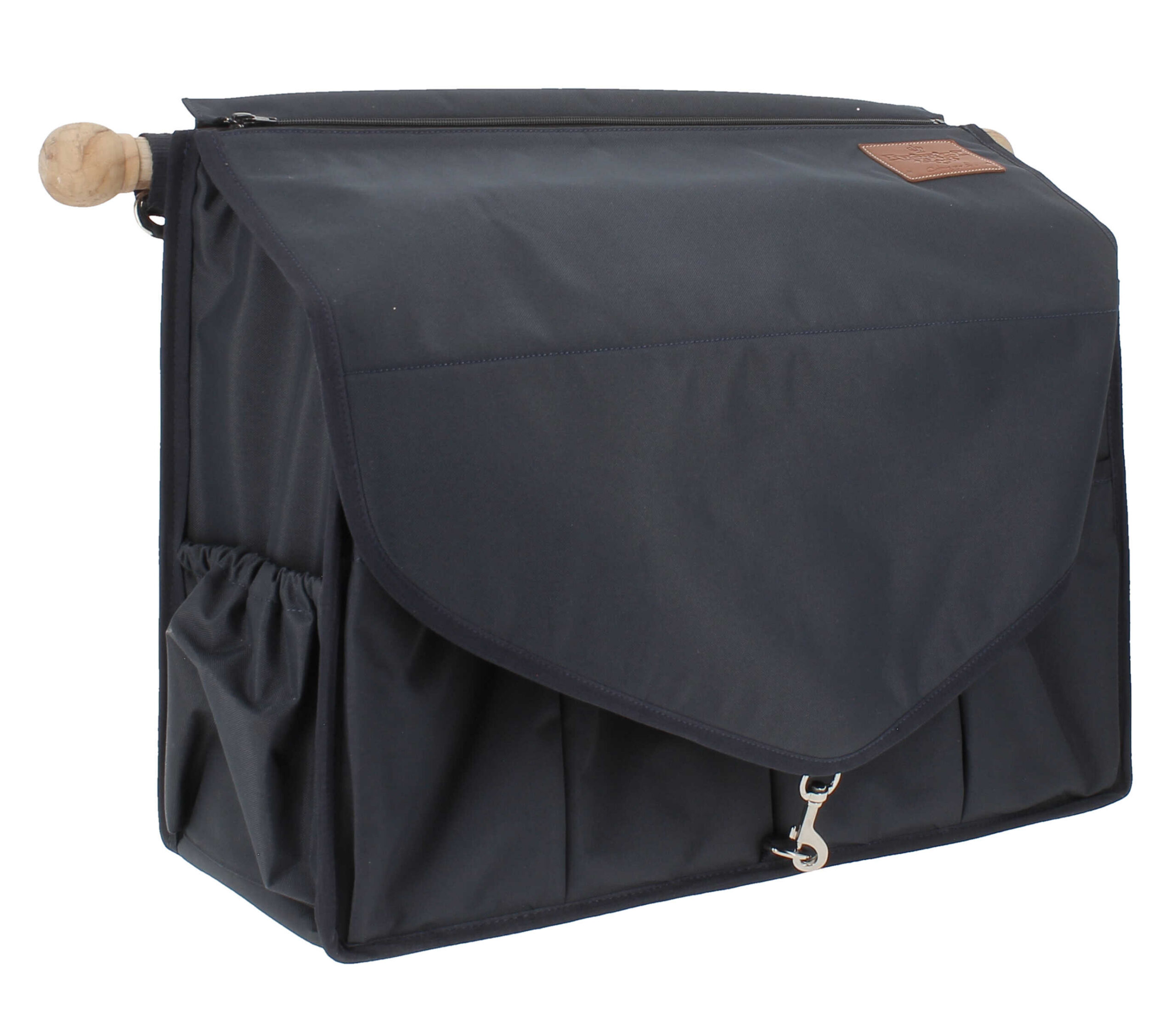 Very practical and designed for carrying a maximum amount of equestrian equipment (brushes, bandages, small items, grooming products, bridles, etc.) at competitions or for storing it in the stable. The Paddock Sports stable bag consists of a removable flap (very convenient for customizing with embroidery and grooming) and a main pocket divided into three parts, reinforced at the bottom for durability and stability. Four additional pockets are available on the front for work, rest, or polo bandages. Two small elastic pockets are also located on the side for storing even more small items. The bag’s flap closes with a silver snap hook, and a faux leather insert with paddock ornaments is sewn into the top left corner. With a large capacity, it hangs from a removable strap connected to a beautiful wooden pole, which also increases its stability and durability. Composition: wood and 100% polyester. Available in black and navy.
