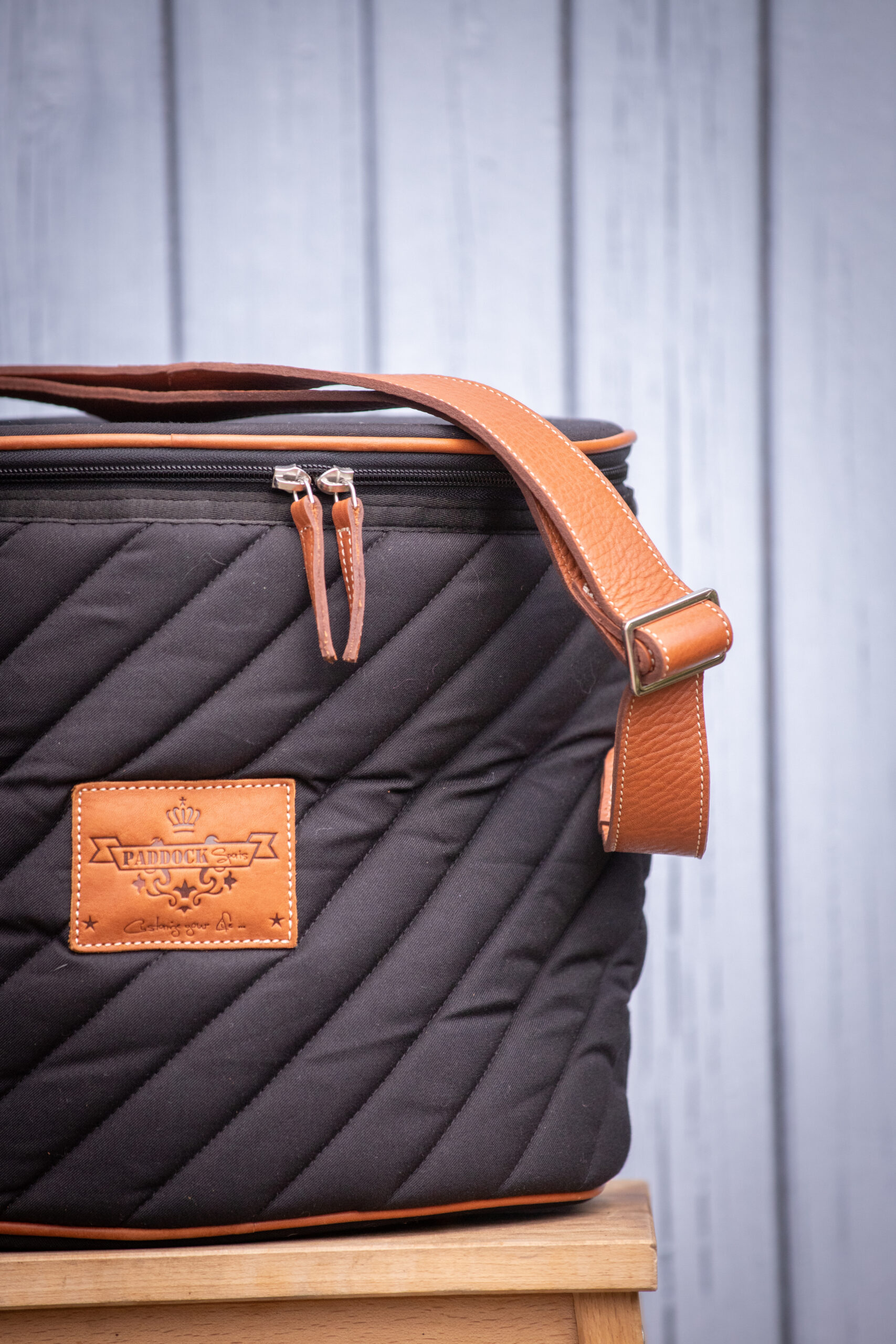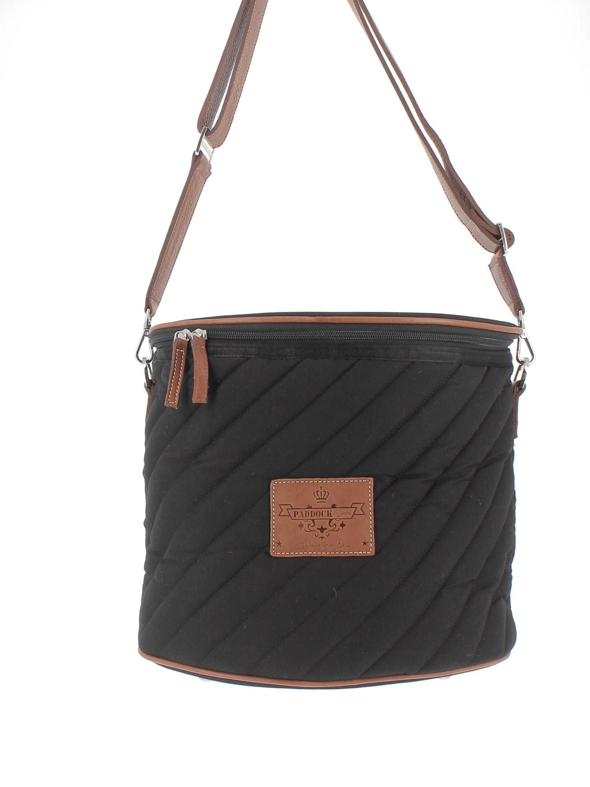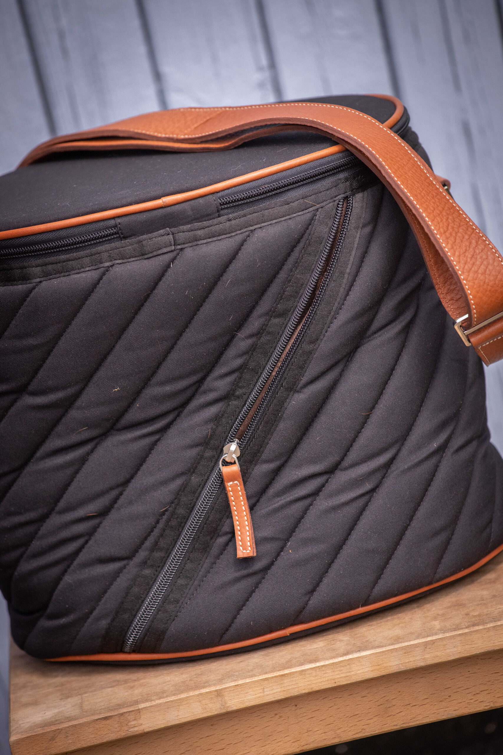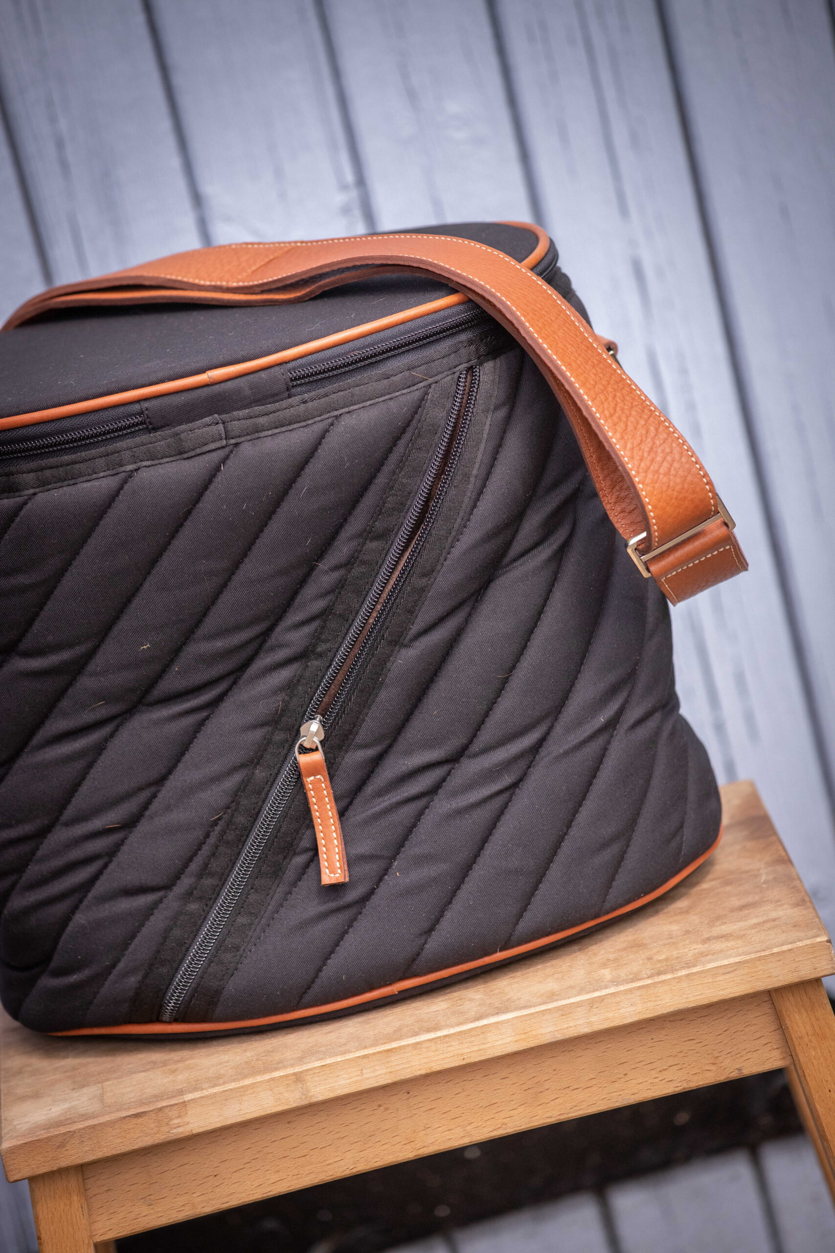 Designed like a hat box, the Paddock Helmet Bag is ideal for transporting riders’ helmets. Cylindrically shaped, it closes with a tonal zipper. Its diagonal quilted pattern matches many other pieces from the same collection, such as the boot bag, weekend bag, curtain, door front, or even the head guard. It also features a large adjustable shoulder strap that allows it to be hung anywhere. Composition: 100% polyester and cowhide. One Size fits all.
