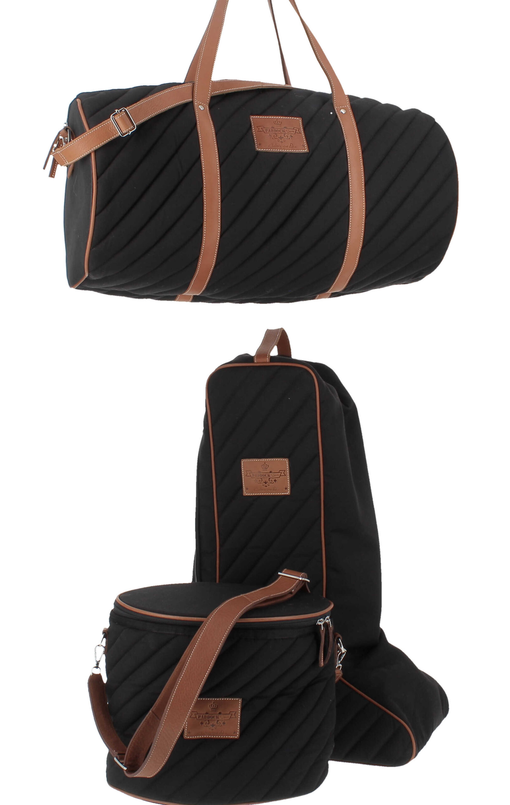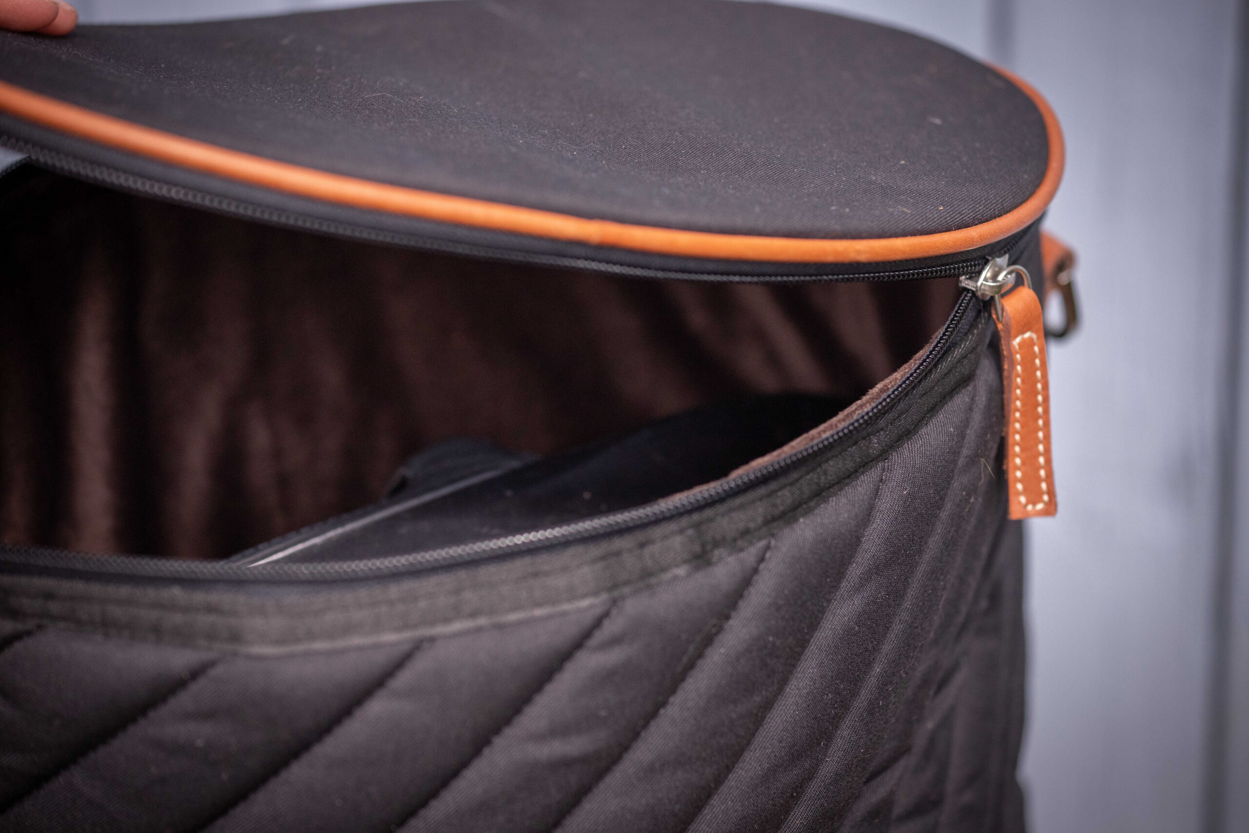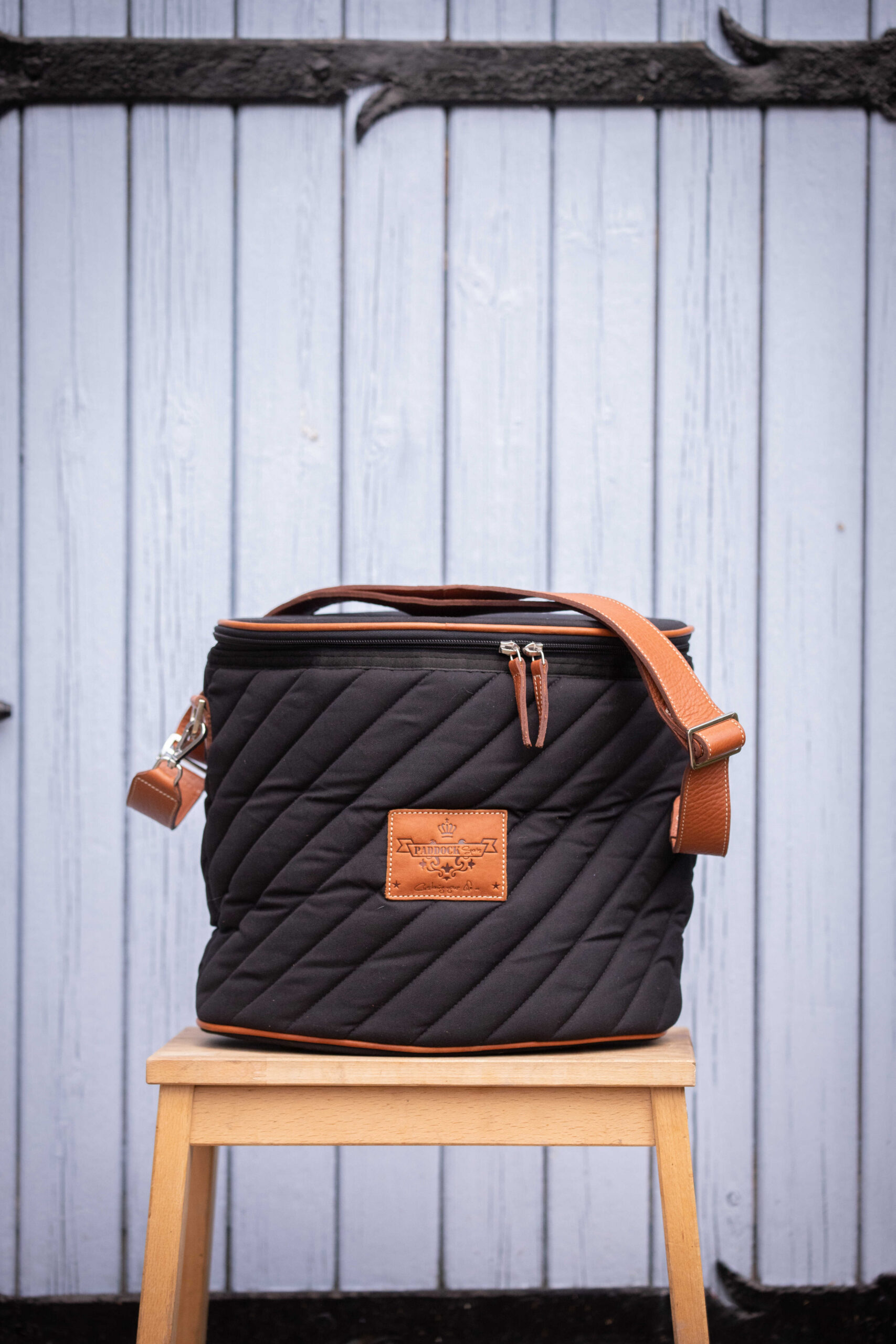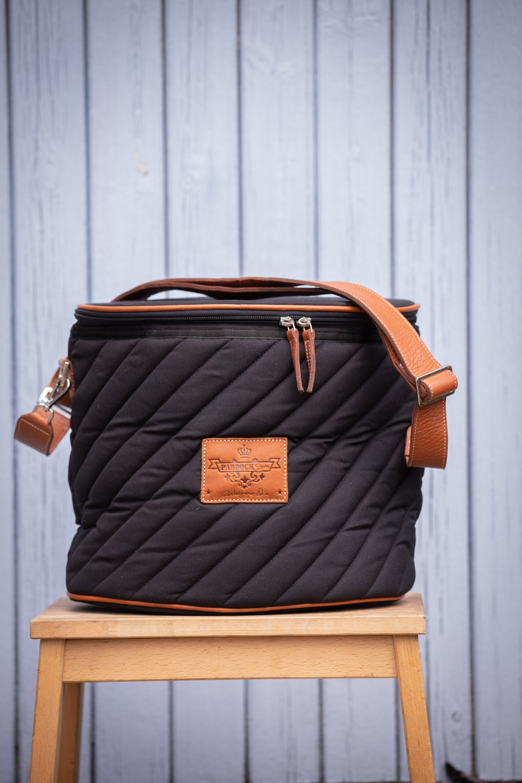 Designed like a hat box, the Paddock Helmet Bag is ideal for transporting riders’ helmets. Cylindrically shaped, it closes with a tonal zipper. Its diagonal quilted pattern matches many other pieces from the same collection, such as the boot bag, weekend bag, curtain, door front, or even the head guard. It also features a large adjustable shoulder strap that allows it to be hung anywhere. Composition: 100% polyester and cowhide. One Size fits all.