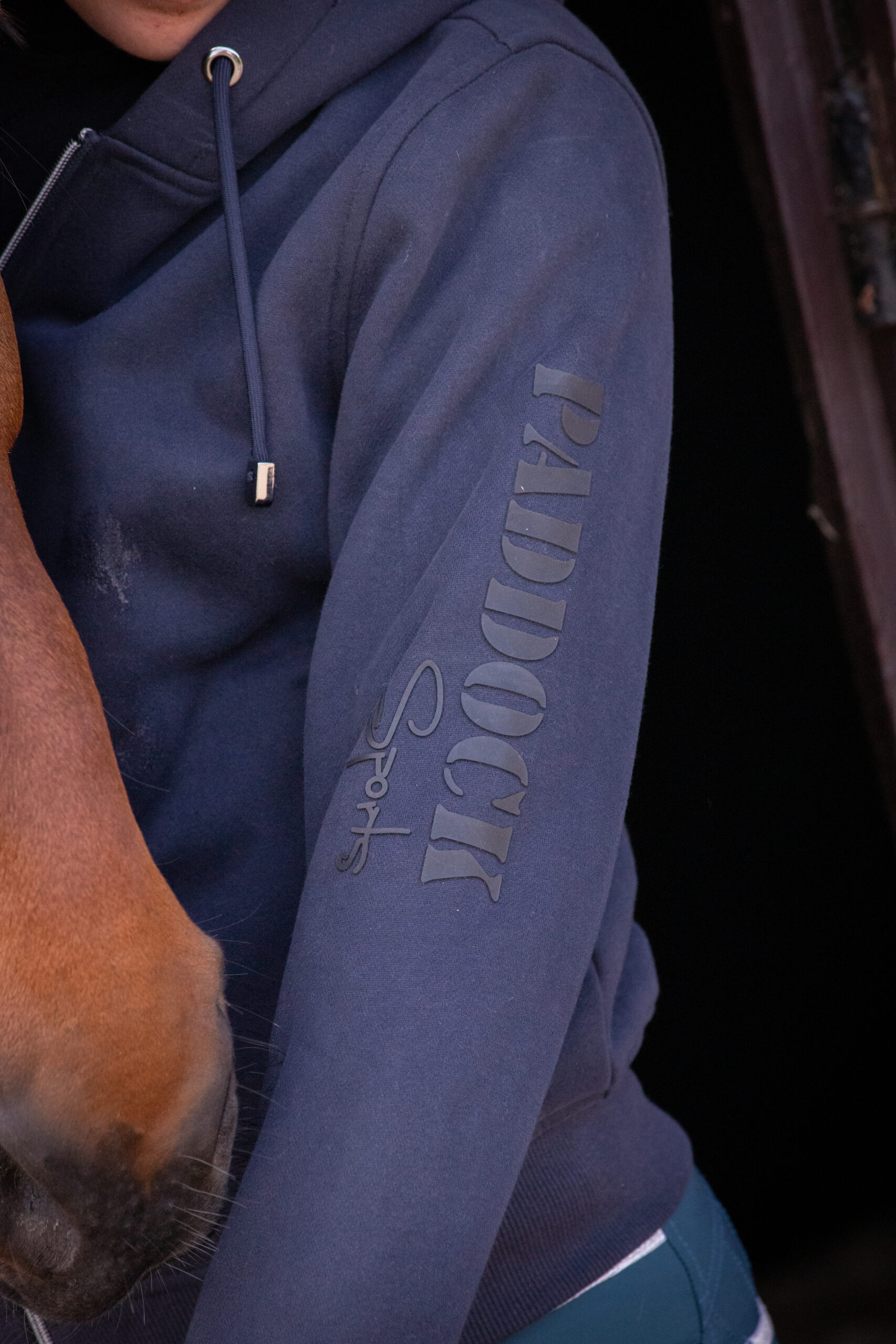 The Montebello sweatshirt features a front zipper and a hood, as well as two front zippered pockets. This sportswear garment is marked with “Paddock Sports” in matte, tone-on-tone silicone along the left sleeve. A similar Paddock marking is located on the back of the jacket, on the right shoulder. In the corner of the right pocket, there is a small, round, red mark, like a seal, marked with a P. This is a unisex sweatshirt, available in Sizes XXS to XXL in navy blue or black. Composition: 51% polyester and 49% cotton. Size guide: The Montebello sweatshirt has a unisex fit and is suitable for both women and men. For those between two Sizes, it is recommended to choose a Size smaller than their usual Size. Washing instructions: This product is machine washable at 30°C; however, tumble drying is not recommended.