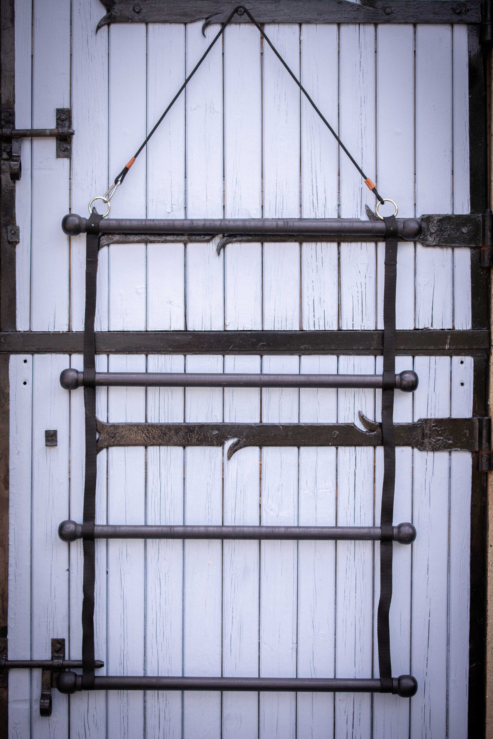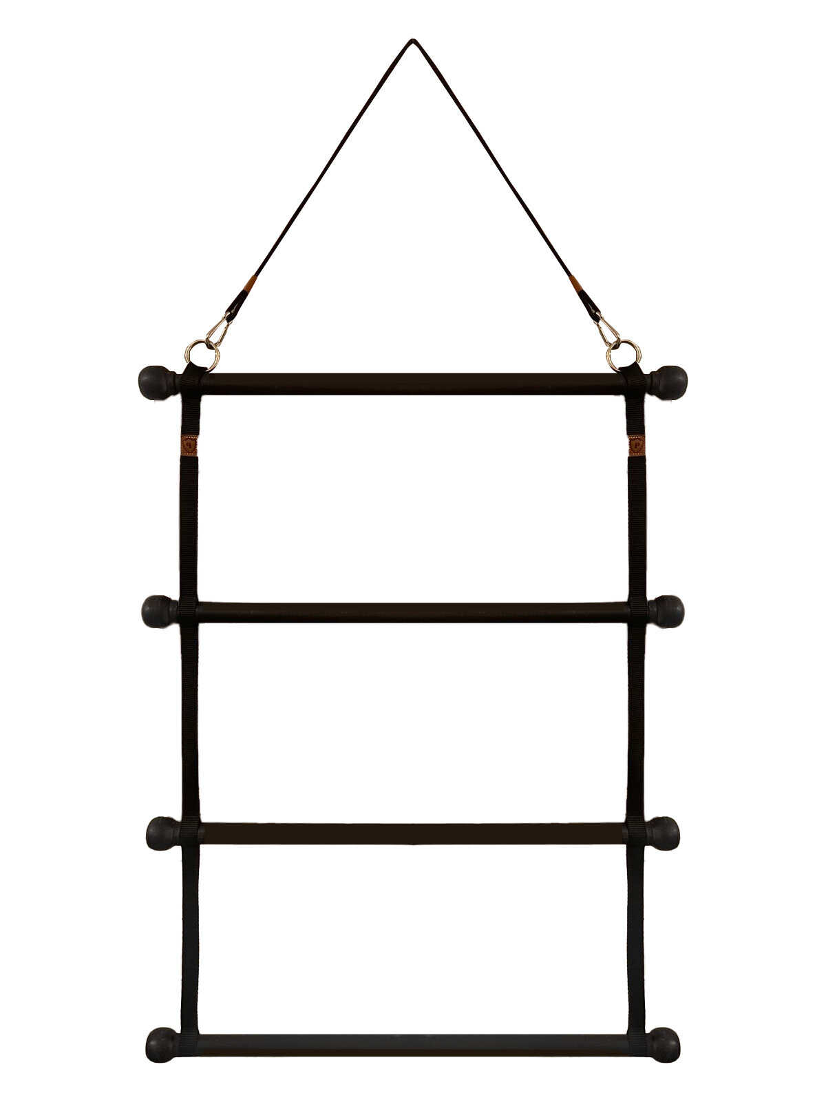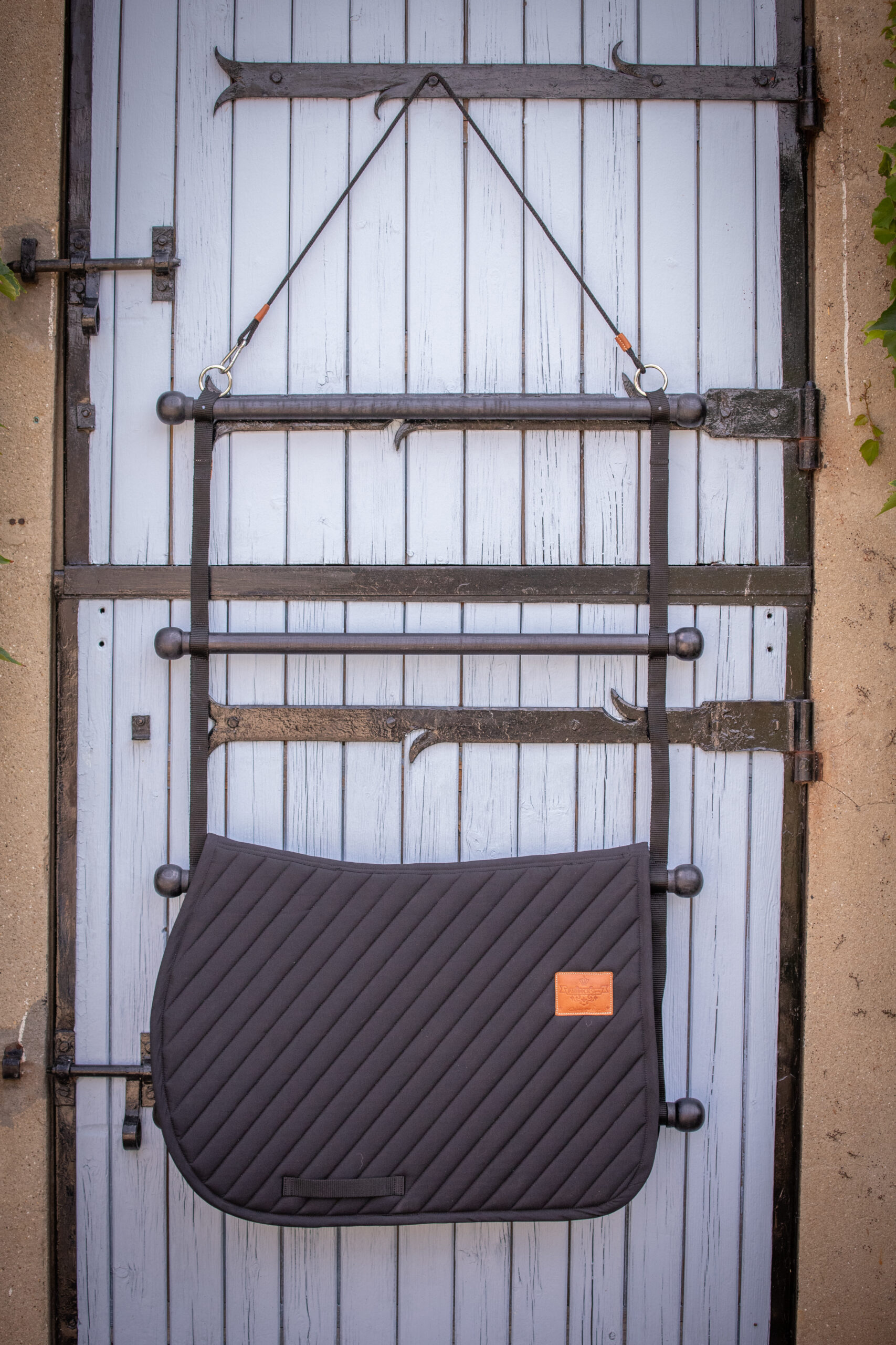The Paddock Sports saddle pad holder is an essential stable accessory. It allows you to hang saddle pads, quarter rugs, blankets, or sheets on four different levels as desired. With its removable strap, it can be hung almost anywhere, whether in the stable or at competitions. Very robust, it is made of very stylish wood and particularly durable nylon. Composition: Wood and nylon. Available in black. One Size.
