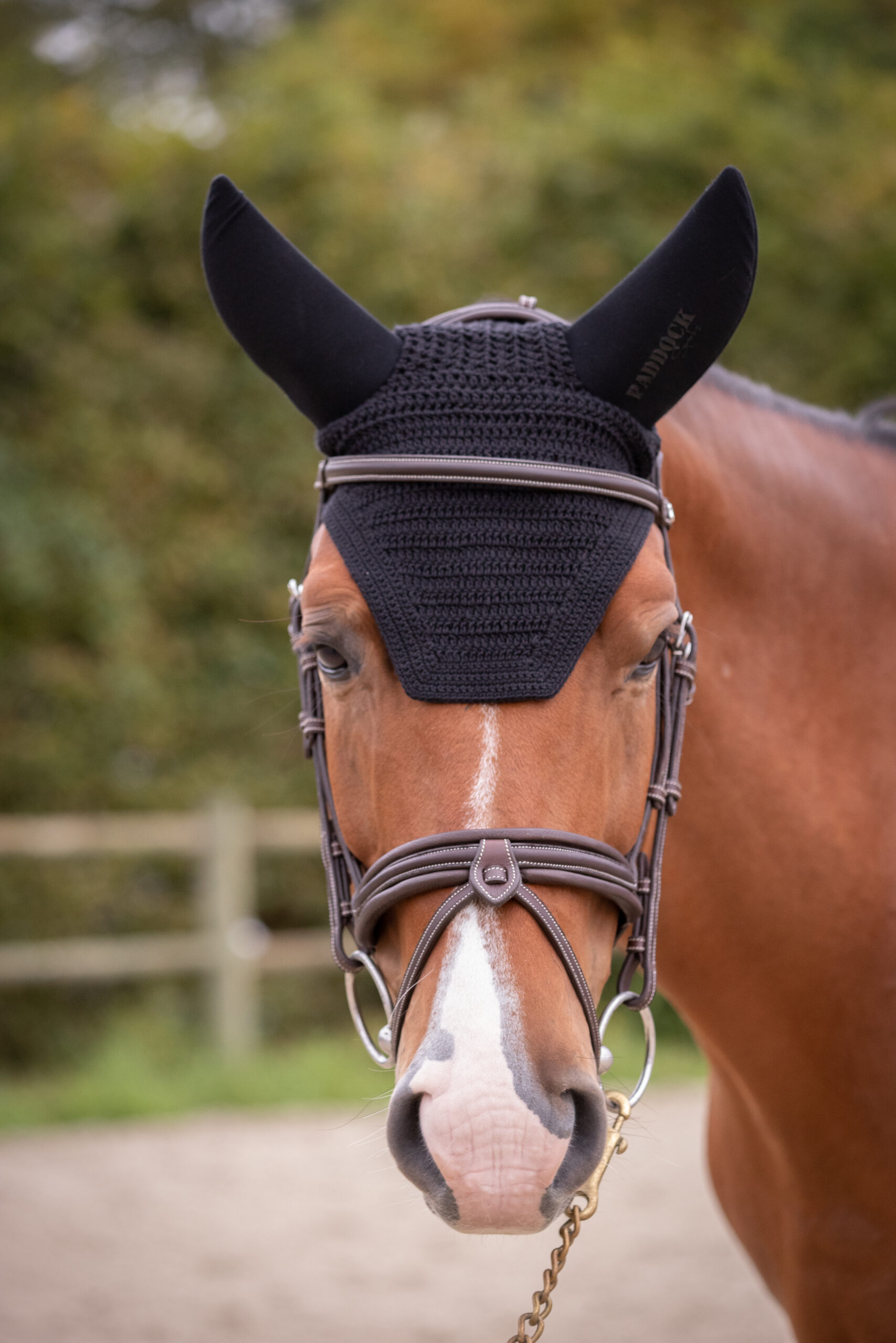 Soundless cotton hat available in horse Size. This high-quality hat is crocheted with a fairly thick yarn and fits perfectly to the horse’s head. It features lined ears that protect against outside noise and promote the horse’s concentration. It also protects against insects and weather influences for horses sensitive to these types of influences. Material: 100% polyester. Available in navy or black. Only available in horse Size.
