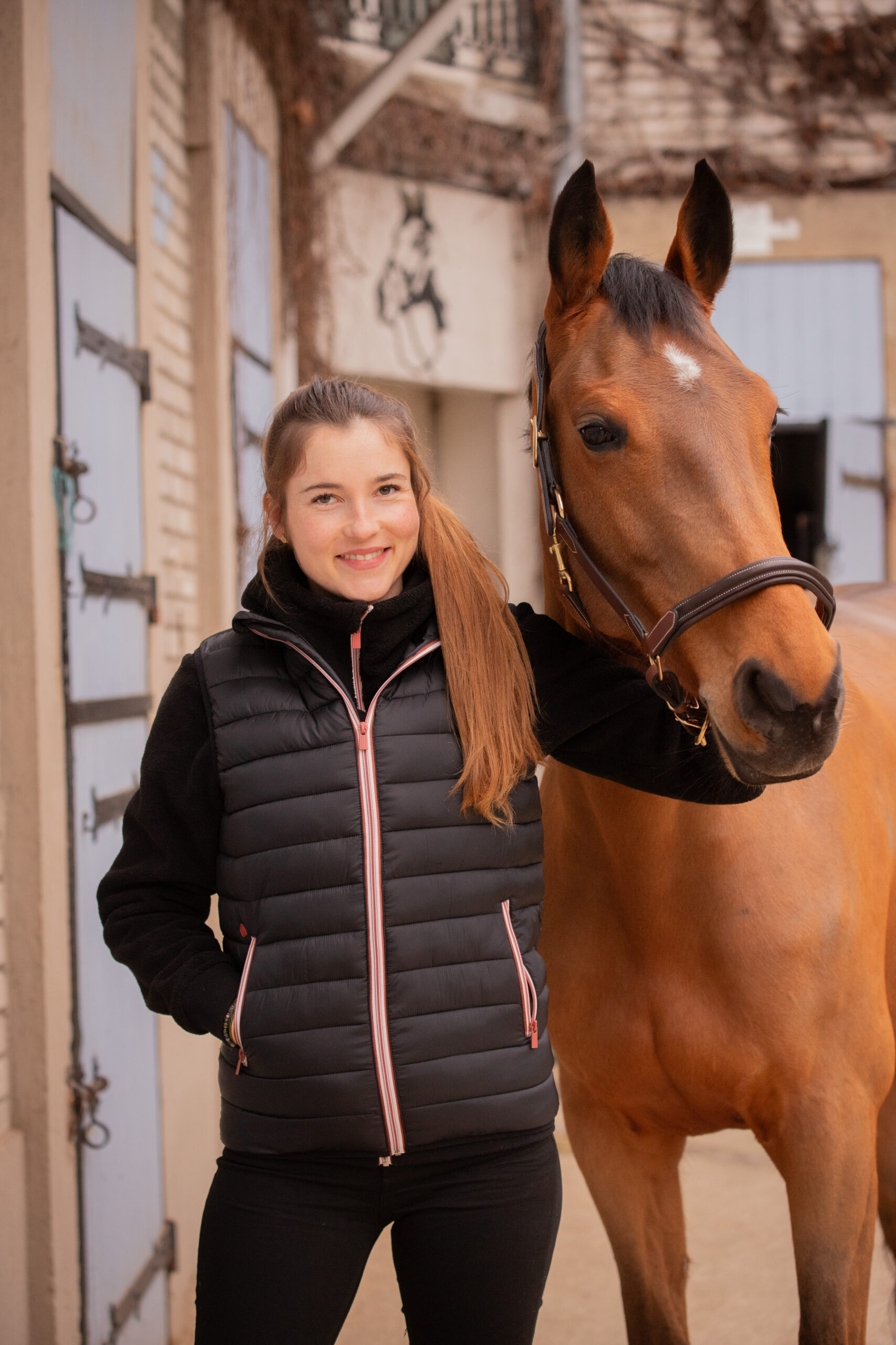 Macaron sleeveless vest by Paddock Sports with horizontal quilting and closed at the front with a raspberry-colored zip. It features a rubber Paddock Sports logo on the shoulder.