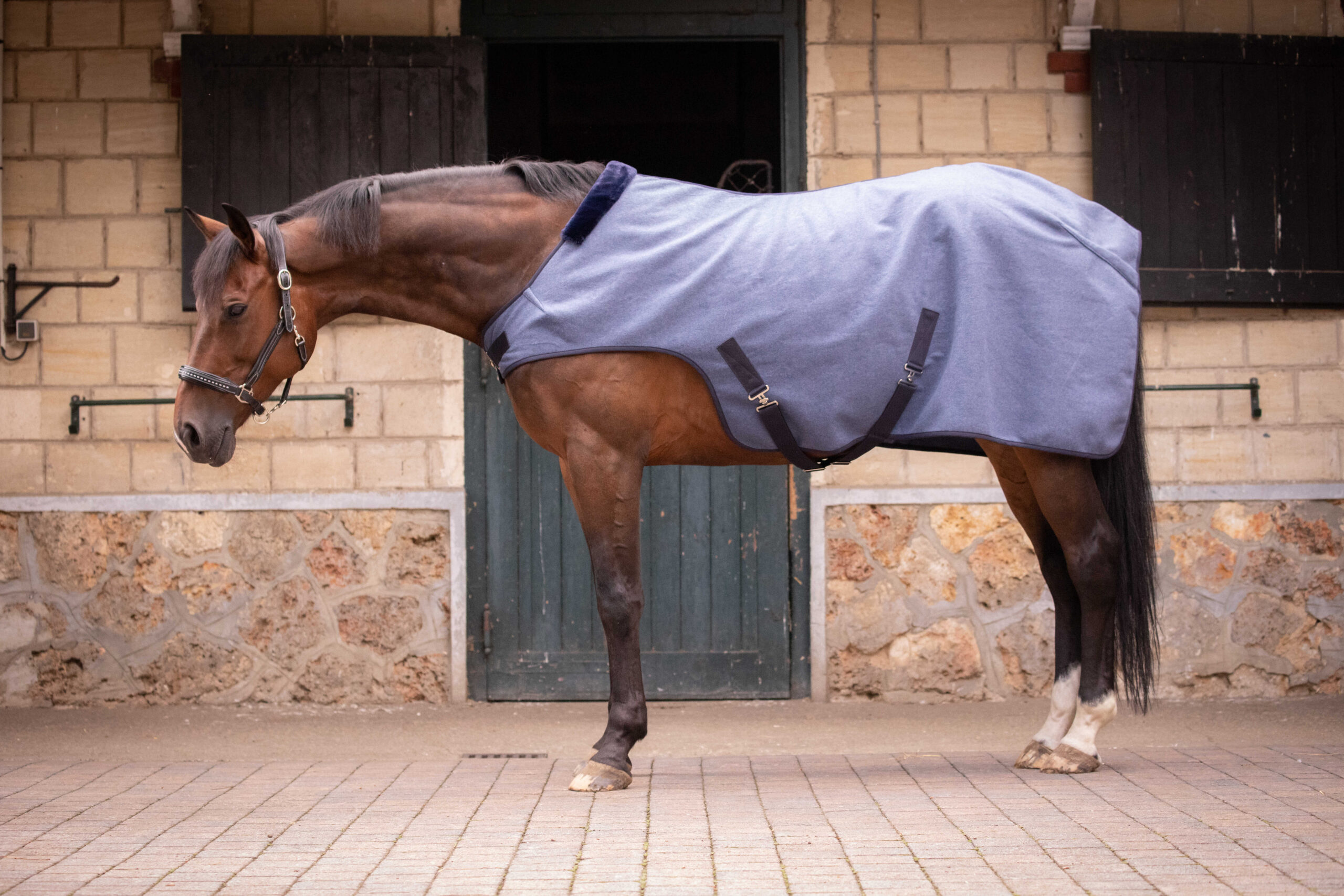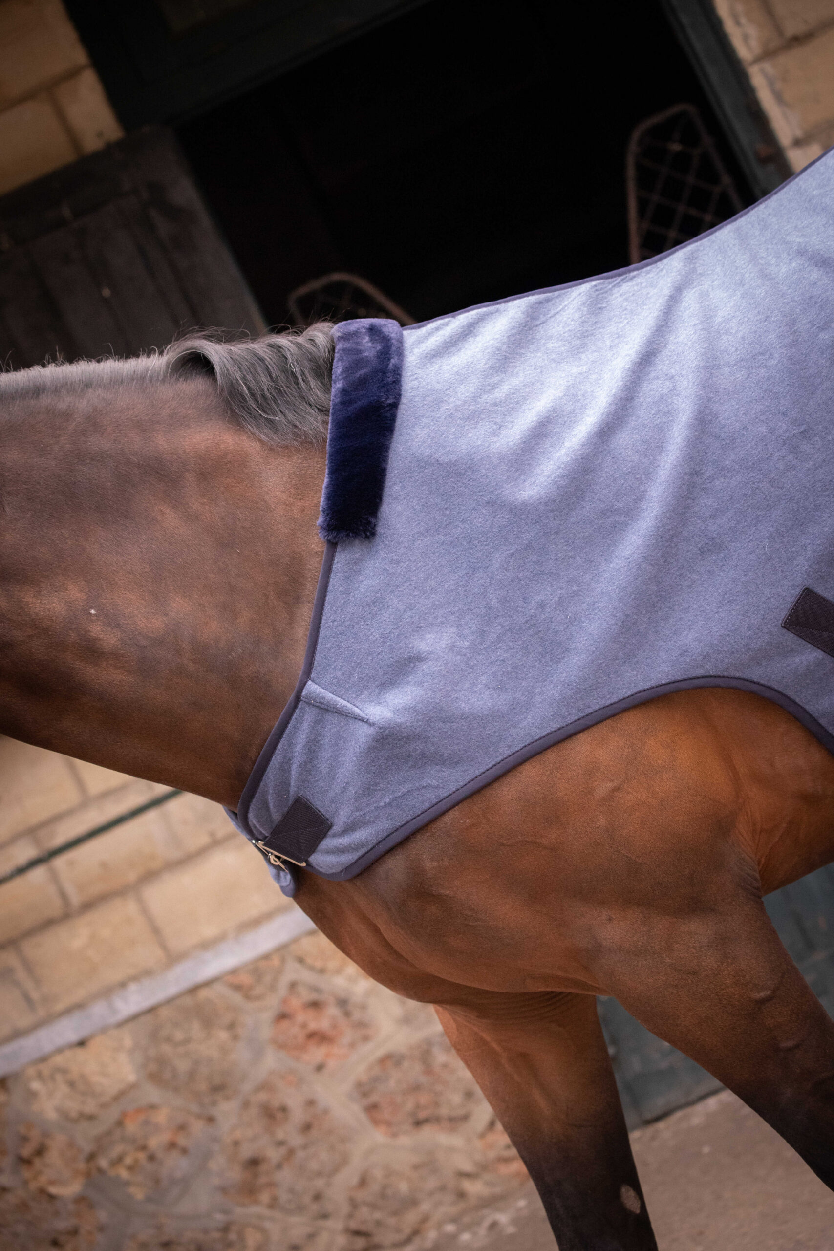The rug is made of a wool-touch material, decorated with a black border and a black Brandenburg-style tail braid. A black faux fur reinforcement along the neckline protects a large area around the withers, adding an elegant touch. Two hidden cross surcingles under the belly help keep the rug in place. The rug fastens at the front with a silver buckle. Its considerable thickness provides a good source of warmth in cold weather. Its simple yet stylish appearance allows for use in both training and competitions.