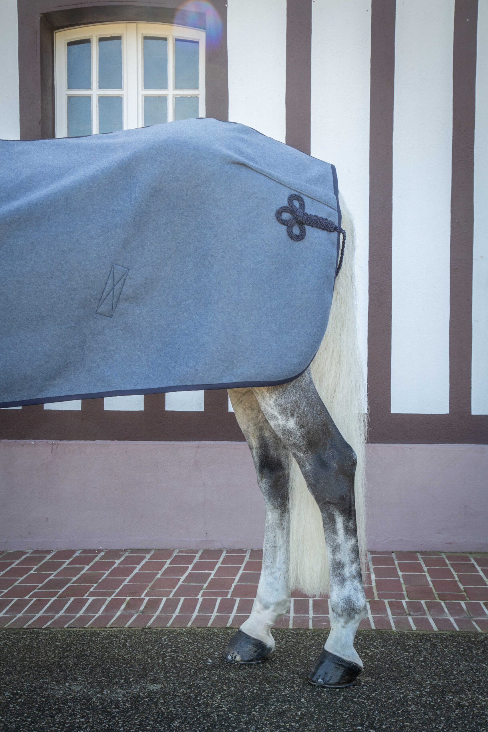 Blanket made of a “wool touch” material adorned with a black braid and a black tail cord type brandebourg.