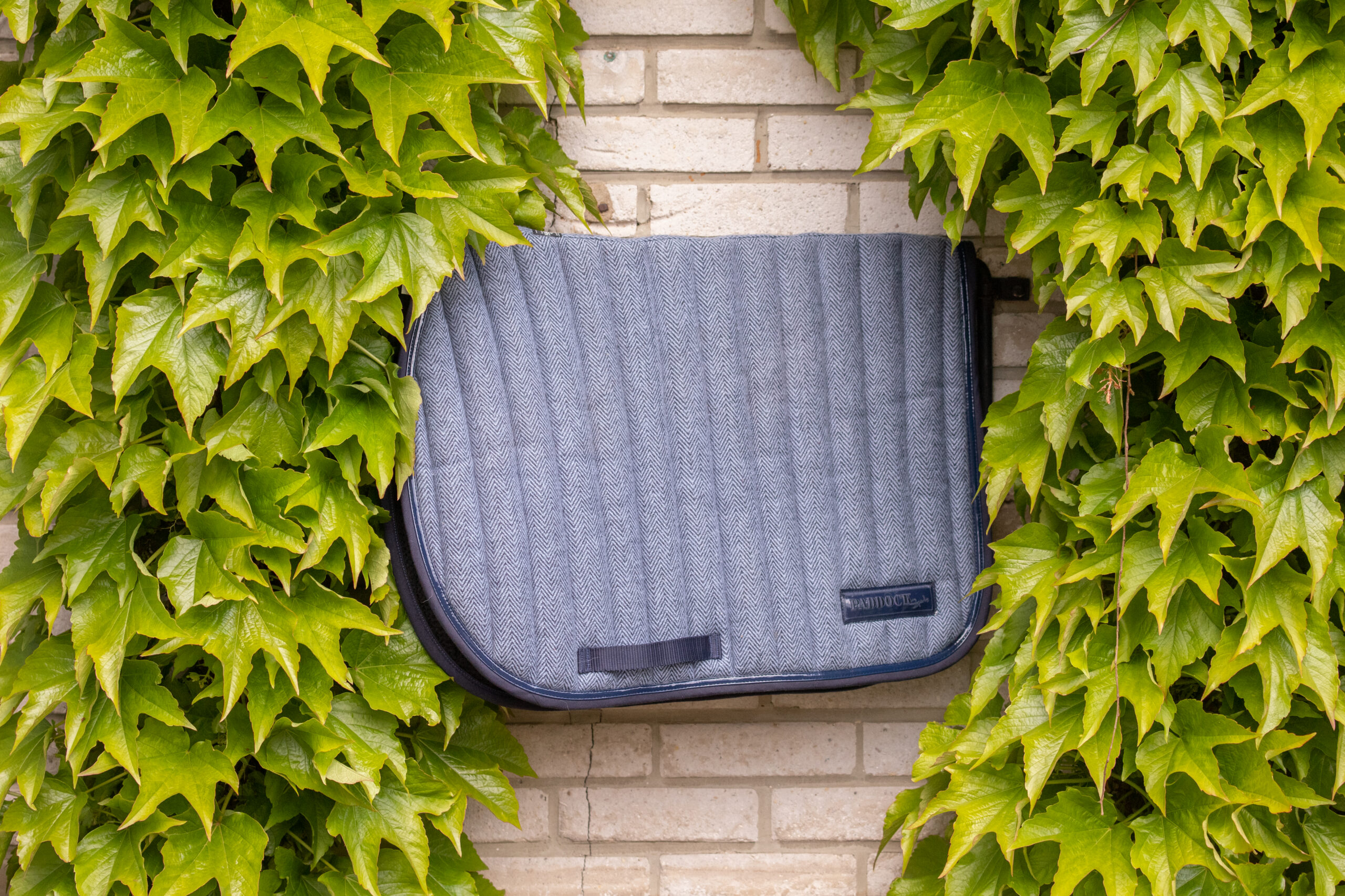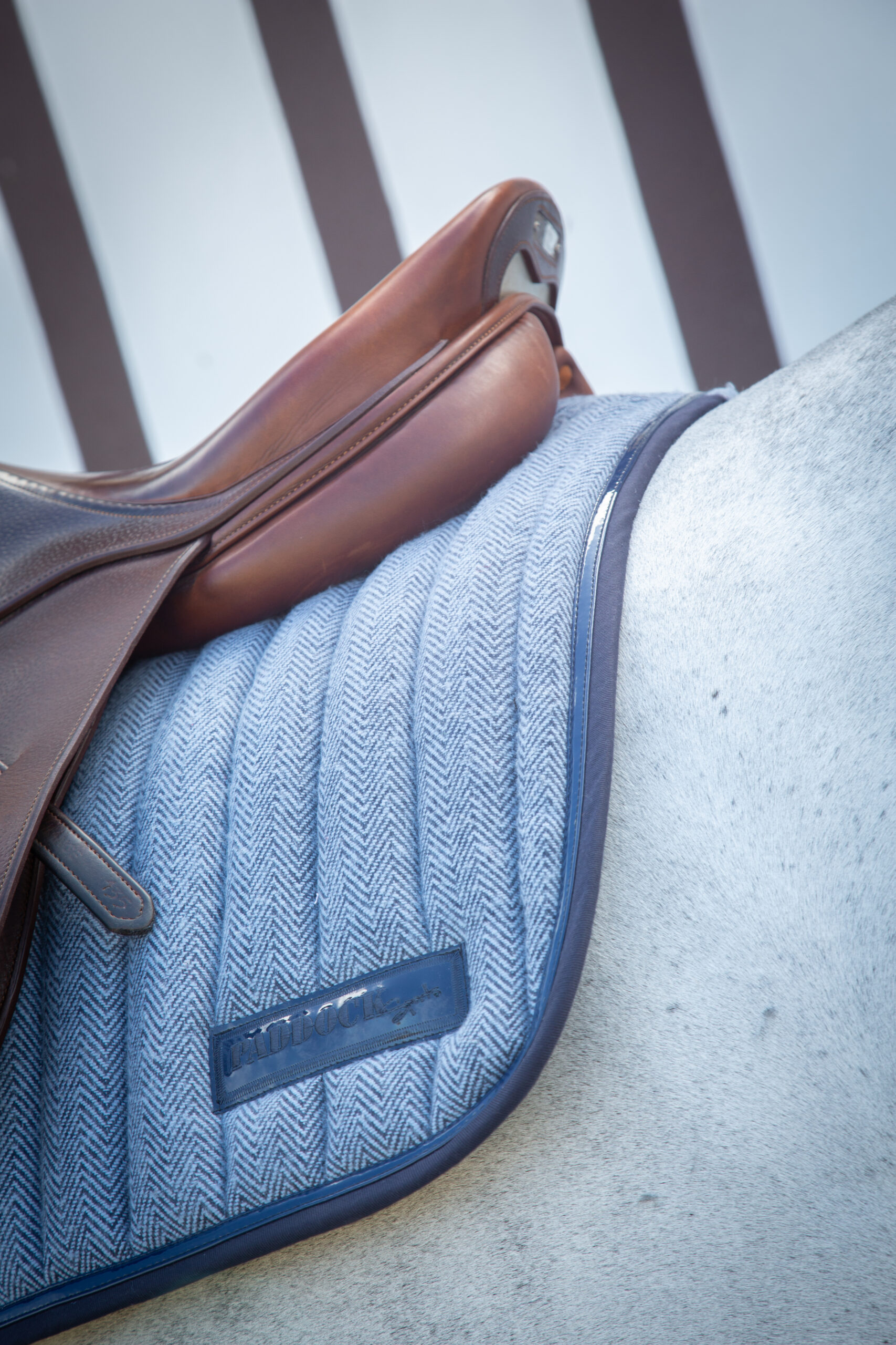 Wooltouch Paddock Sports saddle pad, made from a thick fabric with a very chic chevron pattern. A classic shaped pad signed Paddock Sports and available in gray or blue and trimmed with a varnish. On the back, a varnished patch with the Paddock Sports logo is sewn and perfectly finishes the look of this Paddock Sports creation. Composition: Exterior: 55% Polyester and 45% Wool – Filling: 100% Polyester and 100% Polyurethane – Lining: 100% Cotton Size Horse Care instructions: