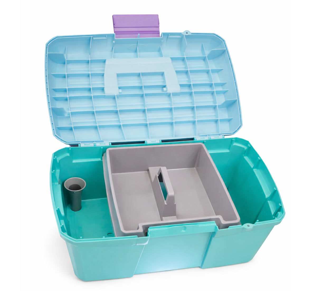 Large grooming box of polypropylene with tray and a separate pull out holder for an oilbrush. Thanks to the extra strengthened lid the grooming box can be used as mounting block or stool. A padlock can be used if required (not included). Dimensions: 40 x 27.5 x 24.5 cm (l x w x h).