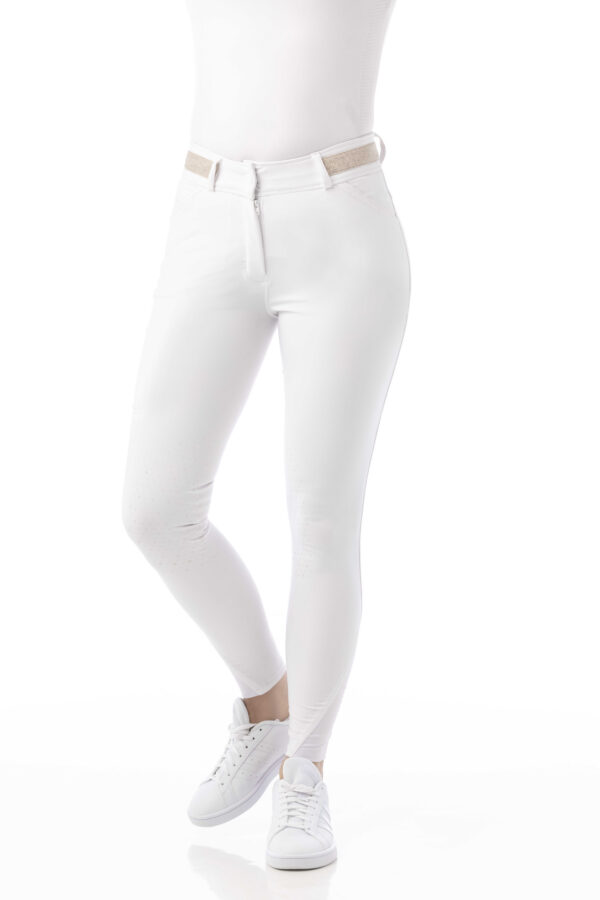 Elegance and femininity are guaranteed for the LUCY. We love the belt and the 2 diagonal pockets. Trousers in Leicht and Atmungsaktiv fabric, they provide you with all the comfort and geschmeidigkeit you need for your horseback rides. Classic cut. Waistband decorated with a glittery elastic band. Phone pocket on the side, closed by a zip. Silicone bands. Leg bottoms with elastane insert. Composition: 96% polyester, 4% elastane. Machine washable at 30°C.
