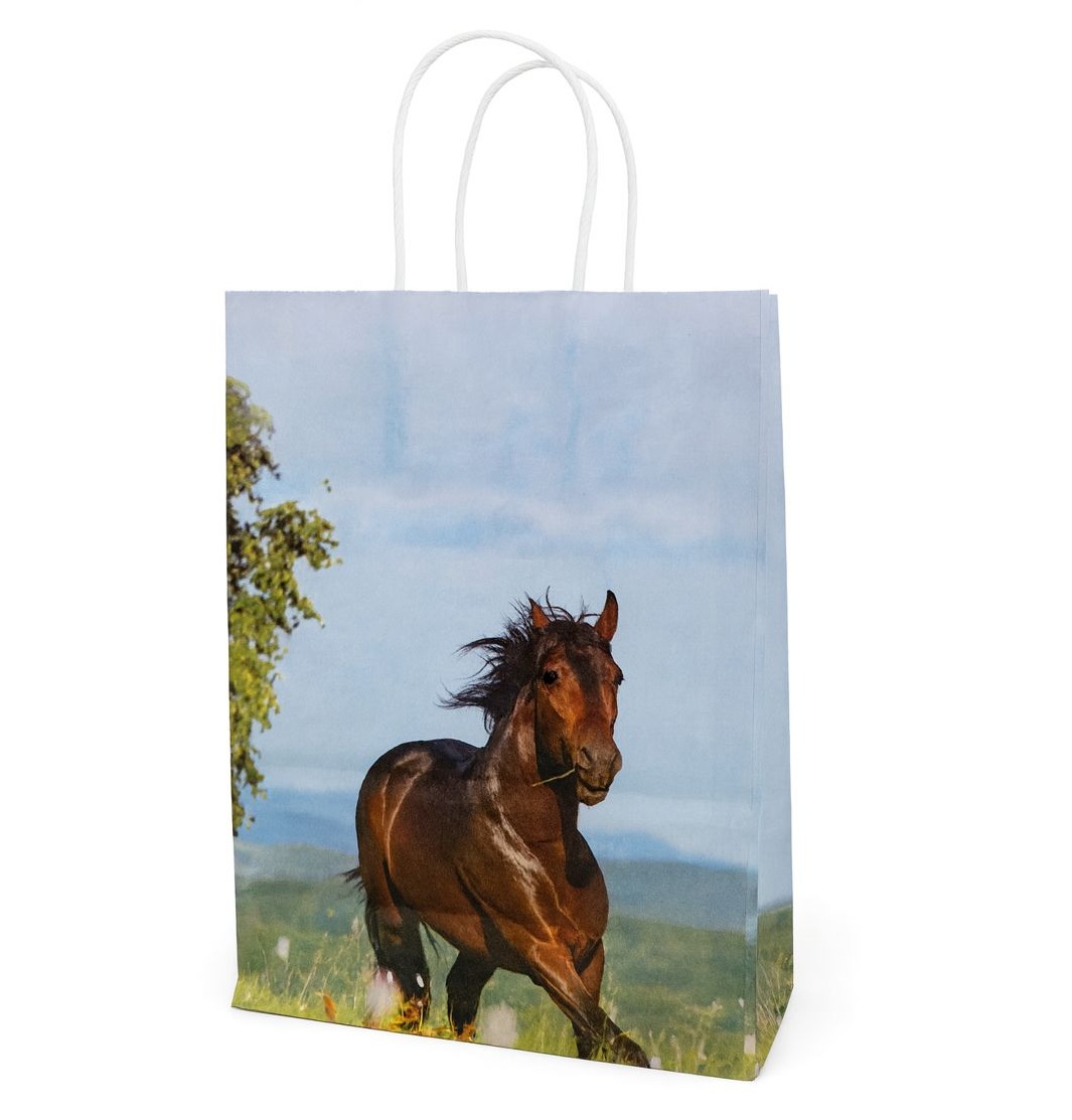 Beautiful and durable paper gift bag featuring a horse motif, perfect for any horse lover.