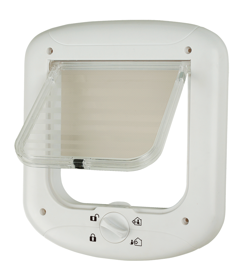 The Cat Flap has 4 positions: in, out, in or out, or lock.