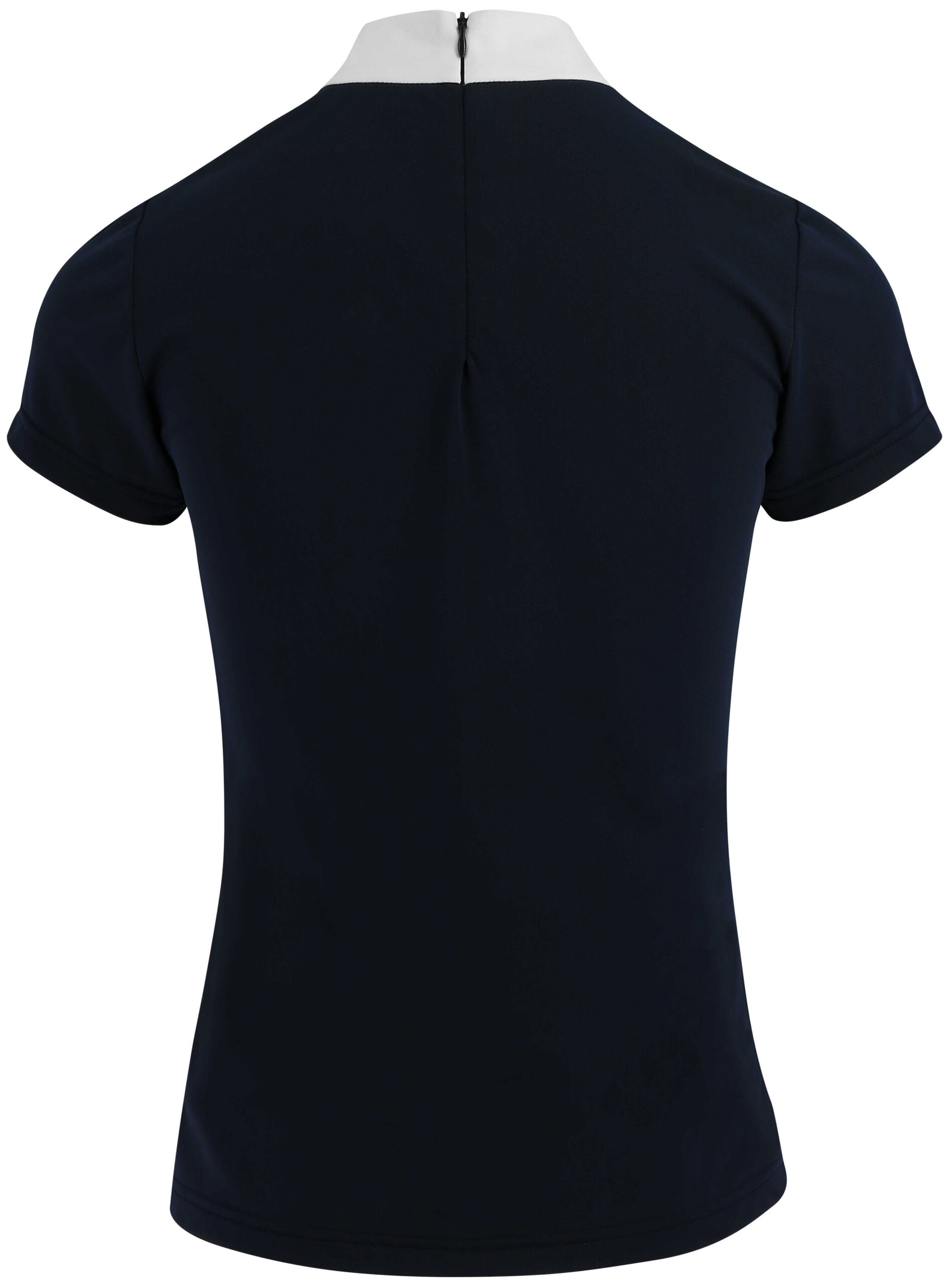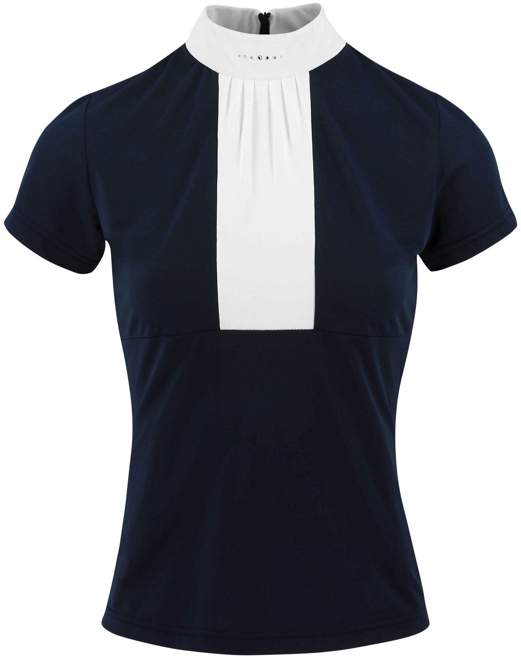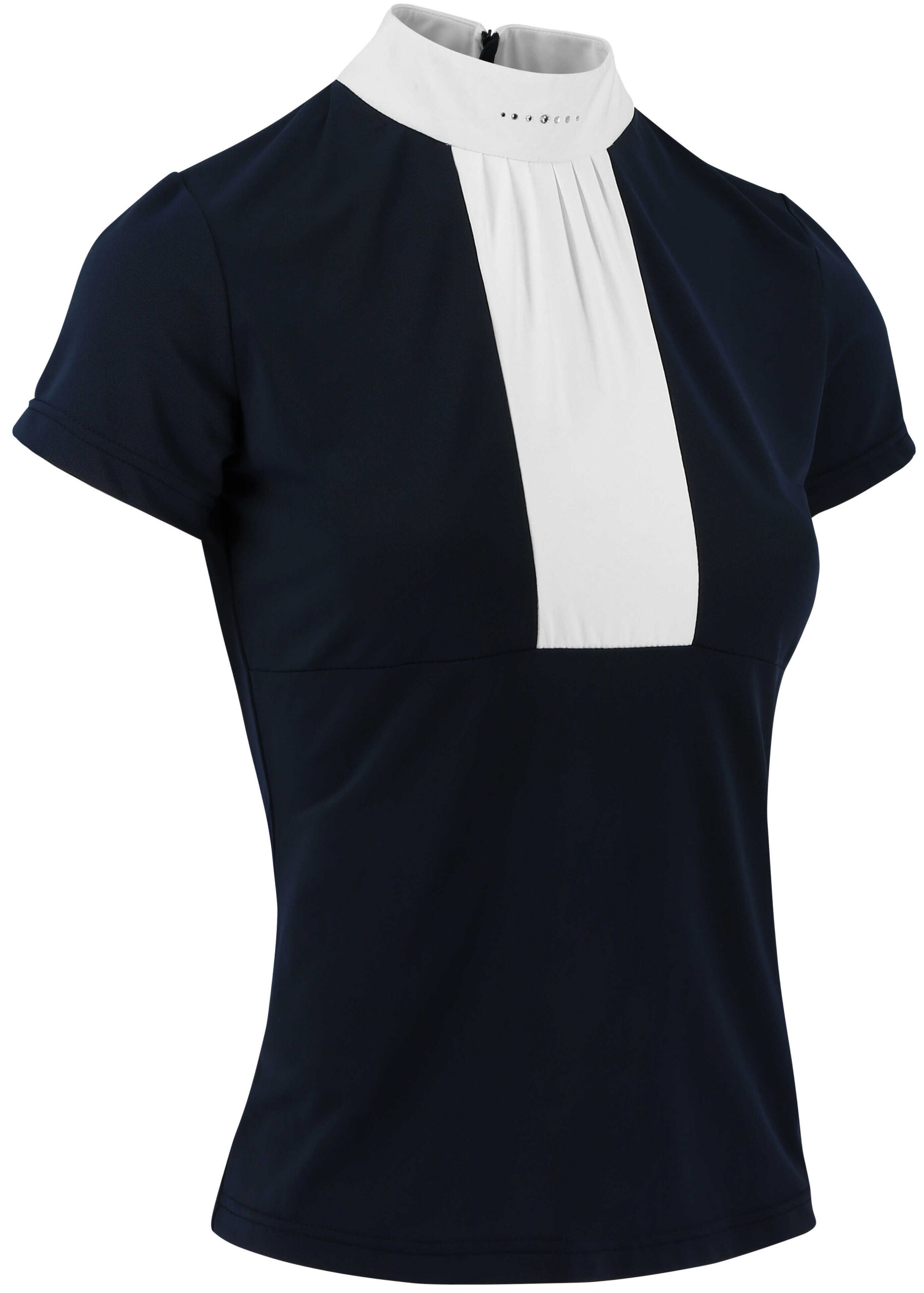 Specially designed for competition or for a dressage session.- Stretch: Soft and stretchy in all directions.- Lightweight and breathable: Cotton (80%) naturally white mixed with elastane.DETAILS:- White pussy bow collar with a delicate line of rhinestones.- Fitted cut and zip fastening at the back.COMPOSITION: 80% cotton, 20% elastane.