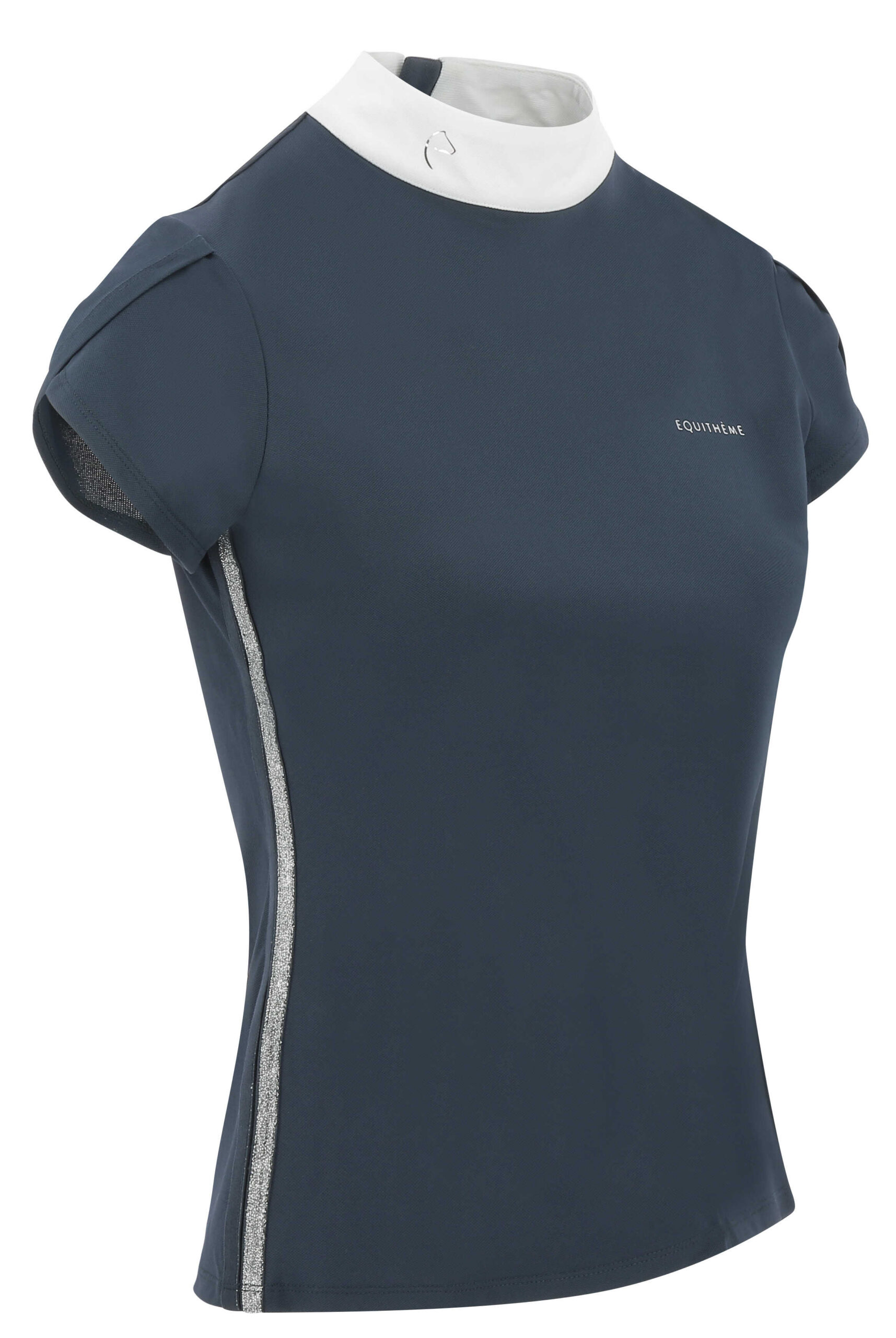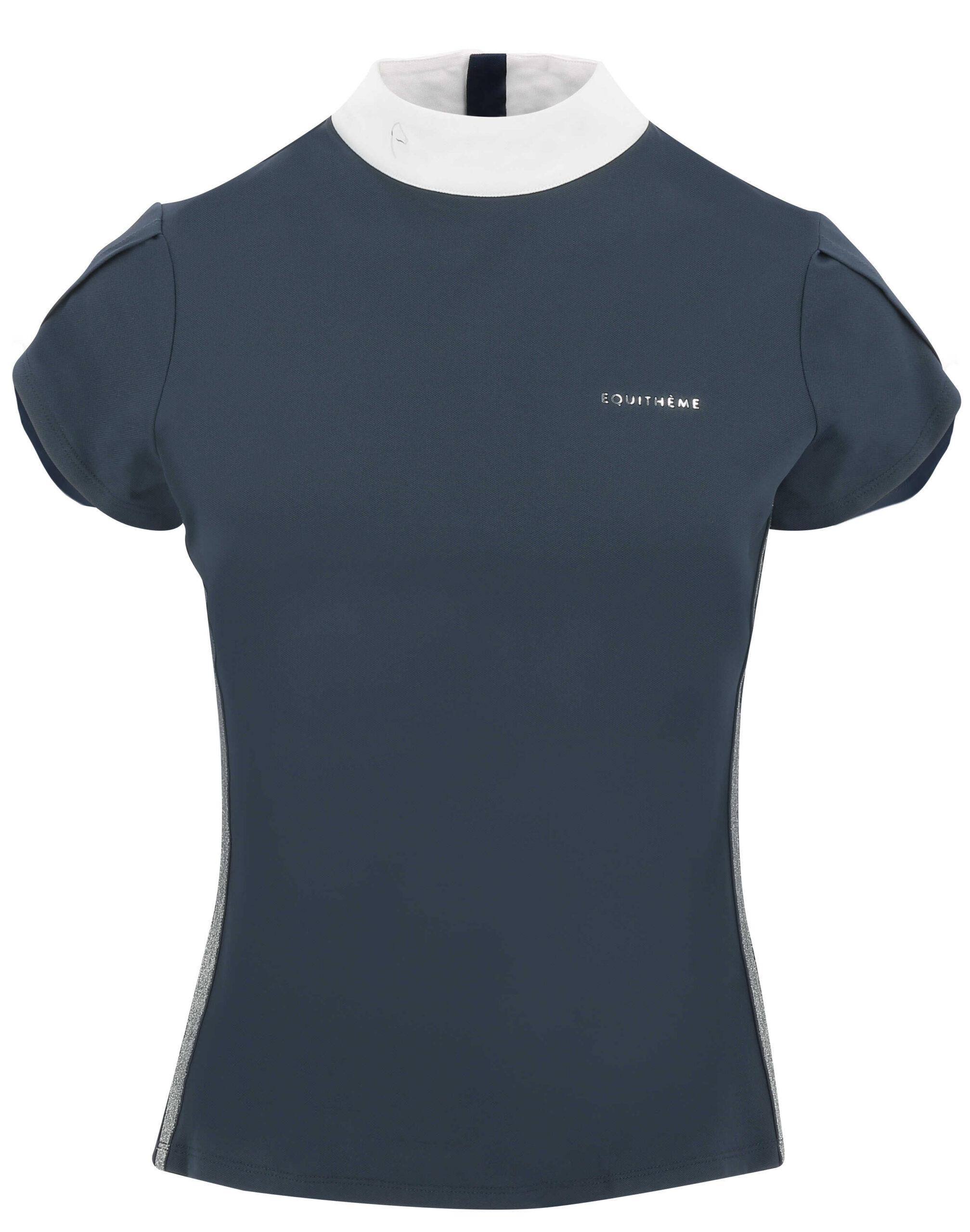 Competition polo shirt with short tulip sleeves. FEATURES* Breathable. * Lightweight: Soft and comfortable pique knit fabric.* STRETCH. FEATURES – Slim fit. – Zipper closure at the back. – White stand-up collar. – Short tulip sleeves. – Contrasting elastic bands on the side. Composition: 94% recycled polyamide, 6% elastane, 190 g/m² pique.