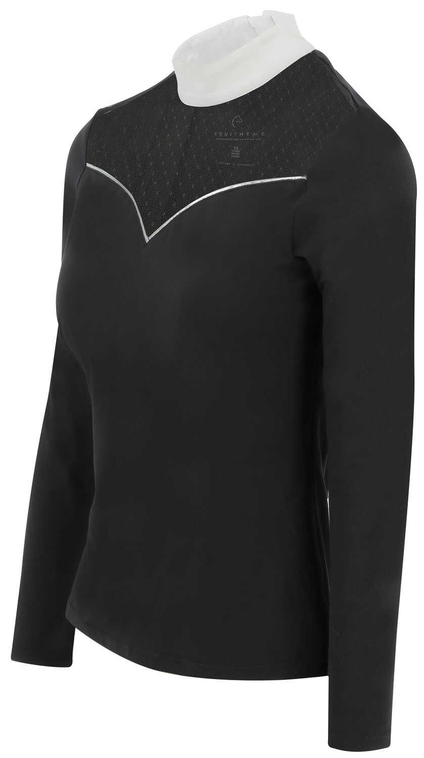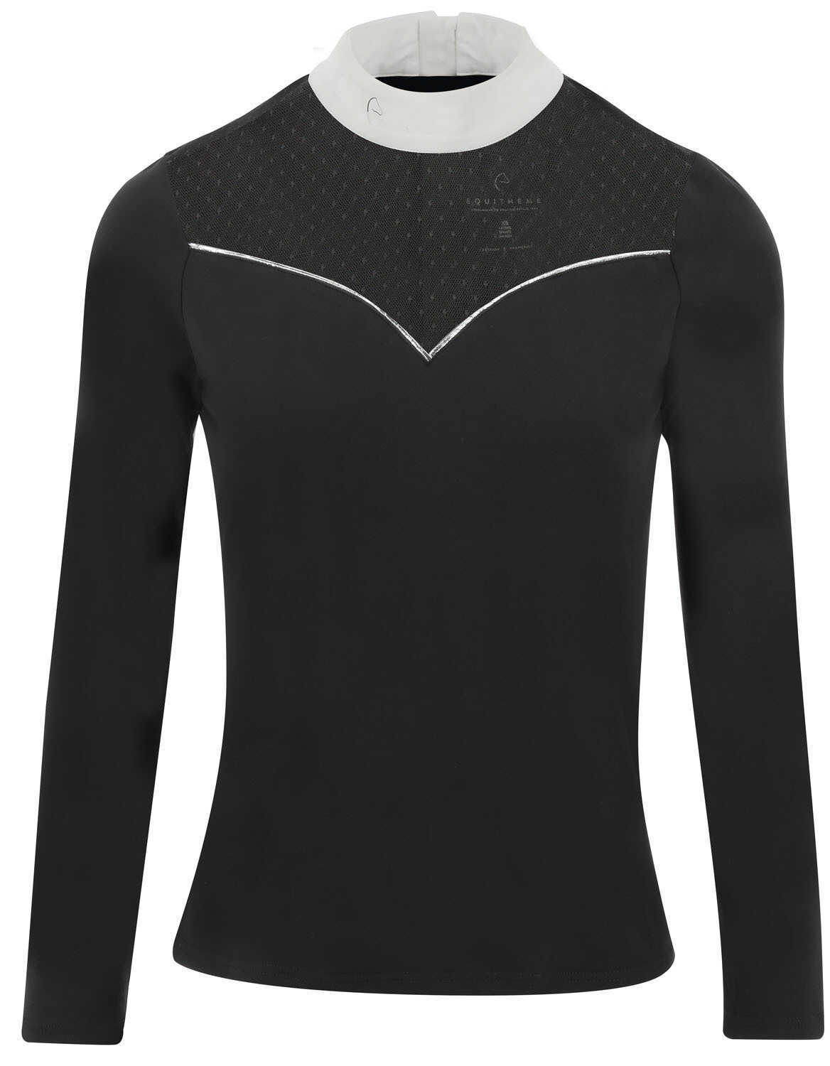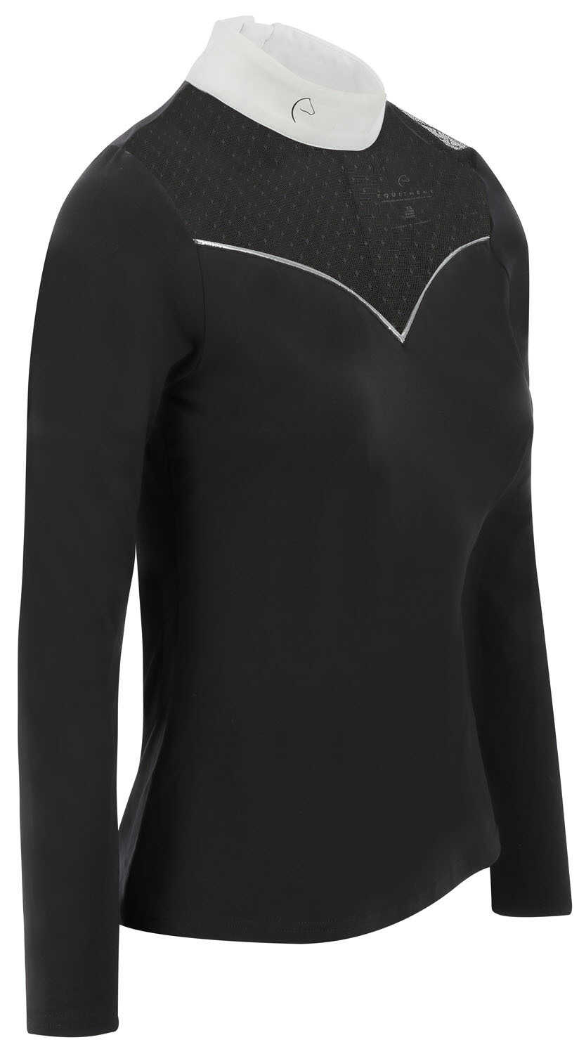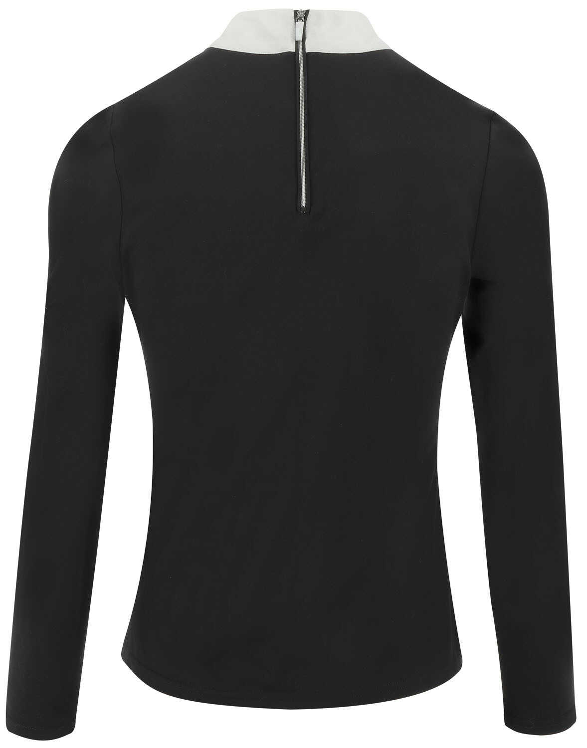 Long sleeve competition polo shirt with heart cutout. FEATURES * Breathable. * Lightweight: Soft and comfortable lightweight fabric. * STRETCH. FEATURES – Close-fitting cut. – Zipper closure at the back. – White stand-up collar. – Long sleeves. – Contrasting dotted panels on the front. – Contrasting piping on the front. Main fabric: 83% recycled polyester, 17% elastane, 230 g/m².