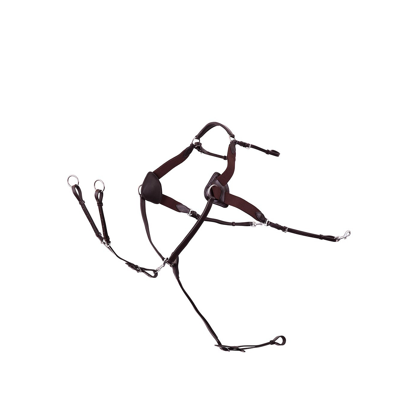 The Premiere breastplate is a five point leather breastplate with elastic inserts. The breastplate has an adjustable girth attachment loop with buckle closure and includes a removable, adjustable martingale attachment. The martingale part has soft padded lining. The breastplate has elastic running from the shoulder to the wither and from the shoulder to the saddle flap to improve comfort and freedom of movement. In addition, the breastplate has adjustable leather straps with snap hooks, to fix it to the D-rings at the front of the saddle. The triangular shoulder pads ensure extra comfort. The breastplate is fixed to the billets with adjustable leather straps with buckle closure. The breastplate is fitted with stainless steel fittings. A breastplate is used to stabilize the saddle and prevent is from slipping, particularly when eventing and jumping.